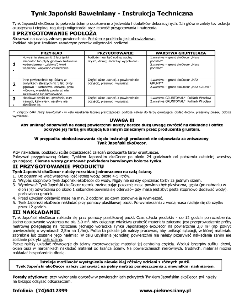 Tynk Japoński Bawełniany - Instrukcja Techniczna Tynk Japoński ekoDecor to pokrycia ścian produkowane z jedwabiu i dodatków dekoracyjnych. Ich główne zalety to: izolacja akustyczna i cieplna, regulacja wilgotności oraz łatwość przygotowania i nałożenia. I PRZYGOTOWANIE PODŁOŻA Stosować na czystą, zdrową powierzchnię. Położenie podkładu jest obowiązkowe. Podkład nie jest środkiem zaradczym przeciw wilgotności podłoża! PRZYKŁAD 1 . 2 . 3 . PRZYGOTOWANIE WARSTWA GRUNTUJĄCA Nowe (nie starsze niż 5 lat) tynki mineralne lub płyty gipsowo kartonowe wodoodporne – „zielone”, tynki wapienne, wapienno cementowe. Podłoże musi być nośne, suche, czyste, dziury, szczeliny wypełnione. 1.warstwa – grunt ekoDecor „Masa podkład” 2.warstwa – grunt ekoDecor „Masa podkład” Inne powierzchnie np. ściany w budynkach starszych niż 5 lat, płyty gipsowo – kartonowe. drewno, płyta wiórowa, wszelakie powierzchnie lakierowane lub laminowane. Metalowe części np. gwoździe, rury framugi, kaloryfery, warstwy nie określone itp. Części luźne usunąć, a powierzchnie oczyścić, przemyć i wysuszyć. 1.warstwa – grunt ekoDecor „MAX GRUNT”* 2.warstwa – grunt ekoDecor „MAX GRUNT” Części luźne usunąć, a powierzchnie oczyścić, przemyć i wysuszyć. 1.warstwa GRUNTOMAL* Polifarb Wrocław 2.warstwa GRUNTOMAL* Polifarb Wrocław * Dotyczy tylko farby Gruntomal - w celu uzyskania lepszej przyczepności podłoża należy do farby gruntującej dodać drobny, przesiany piasek, dobrze wymieszać. UWAGA !!! Aby uniknąć odbarwień na danej powierzchni należy bardzo dużą uwagę zwrócić na dokładne i obfite pokrycie jej farbą gruntującą lub innym zalecanym przez producenta gruntem. W przypadku niedostosowania się do instrukcji producent nie odpowiada za zniszczony Tynk Japoński ekoDecor. Przy nakładaniu podkładu ściśle przestrzegać zaleceń producenta farby gruntującej. Pokrywać przygotowaną ścianę Tynkiem Japońskim ekoDecor po około 24 godzinach od położenia ostatniej warstwy gruntującej. Ciemne wzory gruntować podkładem barwionym kolorze tynku. II PRZYGOTOWANIE PRODUKTU Tynk Japoński ekoDecor należy rozrabiać jednorazowo na całą ścianę. 1. Do pojemnika wlać właściwą ilość letniej wody, około 4-5 litrów. 2. Wsypać stopniowo Tynk Japoński ekoDecor do wody. Nigdy nie należy opróżniać torby za jednym razem. 3. Wymieszać Tynk Japoński ekoDecor ręcznie roztrzepując palcami; masa powinna być plastyczna, gęsta (po nabraniu w dłoń i jej odwróceniu po około 1 sekundzie powinna się oderwać– gdy masa jest zbyt gęsta stopniowo dodawać wody), pozbawiona grudek. 4. Przed użyciem odstawić masę na min. 2 godziny, po czym ponownie ją wymieszać. 5. Tynk Japoński ekoDecor nakładać przy pomocy plastikowej packi. Po wymieszaniu z wodą masa nadaje się do użytku przez 12 godzin. III NAKŁADANIE Tynk Japoński ekoDecor nakłada się przy pomocy plastikowej packi. Czas użycia produktu - do 12 godzin po rozrobieniu. Jedno opakowanie wystarcza na ok. 3,0 m 2. Aby osiągnąć właściwą grubość materiału zalecane jest przeprowadzenie próby metrowej polegającej na rozłożeniu jednego woreczka Tynku Japońskiego ekoDecor na powierzchni 3,0 m 2 (np. pokryć powierzchnię o wymiarach 2,5m na 1,4m). Próba ta pokaże jak należy pracować, aby uniknąć sytuacji, w której materiału zabraknie lub zostanie jego nadmiar. W celu uzyskania jednolitej powierzchni nie należy przerywać nakładania zanim nie zostanie pokryta cała ściana. Packę należy układać równolegle do ściany rozprowadzając materiał jej centralną częścią. Wzdłuż brzegów sufitu, drzwi, okien oraz w narożnikach nakładać materiał od krańca ściany. Na powierzchniach nierównych, trudnych, materiał można nakładać bezpośrednio dłonią. Istnieje możliwość wystąpienia niewielkiej różnicy odcieni z różnych partii. Tynk Japoński ekoDecor należy zamawiać na pełny metraż pomieszczenia z niewielkim nadmiarem. Porady użytkowe: przy wykonaniu otworów w powierzchniach pokrytych Tynkiem Japońskim ekoDecor, pył należy na bieżąco odsysać odkurzaczem. Infolinia (74)6412399 www.pieknesciany.pl