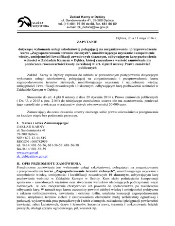 Zakład Karny w Dębicy ul. Sandomierska 41, 39-200 Dębica tel. (14) 681-56-56 do 58, fax. 681-56-59 e-mail: [email protected] Dębica, dnia 11 maja 2016 r. ZAPYTANIE dotyczące wykonania usługi szkoleniowej polegającej na zorganizowaniu i przeprowadzeniu kursu „Zagospodarowanie terenów zielonych”, umożliwiającego uzyskanie i uzupełnienie wiedzy, umiejętności i kwalifikacji zawodowych skazanym, odbywającym karę pozbawienia wolności w Zakładzie Karnym w Dębicy, której szacunkowa wartość zamówienia nie przekracza równowartości kwoty określonej w art. 4 pkt 8 ustawy Prawo zamówień publicznych Zakład Karny w Dębicy zaprasza do udziału w prowadzonym postępowaniu dotyczącym wykonania usługi szkoleniowej, polegającej na zorganizowaniu i przeprowadzeniu kursu zagospodarowanie terenów zielonych, umożliwiającego uzyskanie i uzupełnienie wiedzy, umiejętności i kwalifikacji zawodowych 10 skazanym, odbywającym karę pozbawienia wolności w Zakładzie Karnym w Dębicy. Stosownie do art. 4 pkt 8 ustawy z dnia 29 stycznia 2014 r. Prawo zamówień publicznych ( Dz. U. z 2015 r. poz. 2164) do niniejszego zamówienia ustawa nie ma zastosowania, ponieważ jego wartość nie przekracza wyrażonej w złotych równowartości 30 000 euro. Zamawiający do czasu zawarcia umowy zastrzega sobie prawo unieważnienia postępowania na każdym etapie bez podawania przyczyn. I. Nazwa i adres Zamawiającego: ZAKŁAD KARNY ul. Sandomierska 41 39-200 Dębica NIP : 872-12-44-819 REGON : 000782959 tel. /0-14/ 681-56-56, 681-56-57, 681-56-58 fax./0-14/ 681-56-59 www.sw.gov.pl [email protected] II. OPIS PRZEDMIOTU ZAMÓWIENIA Przedmiotem zamówienia jest wykonanie usługi szkoleniowej, polegającej na zorganizowaniu i przeprowadzeniu kursu „Zagospodarowanie terenów zielonych”, umożliwiającego uzyskanie i uzupełnienie wiedzy, umiejętności i kwalifikacji zawodowych 10 skazanym, odbywającym karę pozbawienia wolności w Zakładzie Karnym w Dębicy. Kurs służy podniesieniu kompetencji społeczno – zawodowych więźniów oraz stworzeniu warunków ułatwiających podtrzymanie więzi rodzinnych w celu zwiększenia efektywności ich powrotu do społeczeństwa po zakończeniu odbywania kary. W ramach tego kursu uczestnicy powinni zdobyć wiedzę i umiejętności praktyczne z zakresu roślinoznawstwa, nawożenia i ochrony roślin, ustalania koncepcji zagospodarowania terenu, urządzania terenów zieleni z zastosowaniem elementów małej architektury ogrodowej i parkowej, wykonywania prac porządkowych i robót ziemnych, zakładania i pielęgnacji powierzchni trawiastej, rabat kwiatowych, drzew i krzewów, koszenia trawy, tyczenia i wykonywania ścieżek pieszych, obsługi sprzętu ogrodniczego, pił, kosiarek itp. CPV 80530000-8 Szczegółowy opis przedmiotu zamówienia oraz opis jego wykonania 1. Liczba osób uczestniczących w kursie –10 skazanych. 2. W przypadku nieprzystąpienia skazanego do kursu lub nieukończenia kursu, wynagrodzenie dla Wykonawcy zostanie zmniejszone o liczbę osobogodzin kursu, w których skazany nie uczestniczył. W takim przypadku Wykonawca zobowiązany będzie zweryfikować koszt kursu. 3. Zamawiający zastrzega, że w przypadku przerwania uczestnictwa w kursie przed ukończeniem 20% zajęć, bądź nieprzystąpienia skazanego do kursu, Zamawiający może skierować na zwolnione miejsce nowego skazanego z listy rezerwowej, który zobowiązany będzie realizować obowiązki uczestnika kursu na zasadach określonych w specyfikacji. W takim przypadku Zamawiający pokryje jedynie koszt odpowiadający kosztowi kursu przewidzianego dla jednej osoby. 4. Nabór kandydatów do udziału w kursie przeprowadzi Zamawiający, który skieruje na kurs 10 skazanych oraz dodatkowo przygotuje listę rezerwową obejmującą trzy osoby w celu umożliwienia wprowadzania nowej osoby na miejsce osoby rezygnującej, według zasad określonych w pkt 3. 5. Osoba, która ukończy kurs, otrzyma zaświadczenie o ukończeniu kursu, wydane przez Wykonawcę na podstawie § 18 ust. 2 rozporządzenia Ministra Edukacji Narodowej z dnia 11 stycznia 2012 r. w sprawie kształcenia ustawicznego w formach pozaszkolnych (Dz. U. z 2014 r. poz. 622 ) oraz potwierdzi jego odbiór własnoręcznym podpisem na liście stanowiącej załącznik nr 4 do Umowy. Zaświadczenie o ukończeniu kursu może otrzymać osoba, która nie będzie miała więcej niż 20% nieobecności w zajęciach. W wydanym zaświadczeniu nie można umieszczać żadnych danych, wskazujących że osoba kończąca kurs przebywała w zakładzie karnym. 6. Liczba godzin dydaktycznych kursu – łączna liczba godzin zajęć teoretycznych i praktycznych powinna wynieść 100 godzin dydaktycznych dla każdego uczestnika (1 godzina dydaktyczna to 45 minut). W tym - zajęcia teoretyczne powinny obejmować 20 godzin, zajęcia praktyczne powinny obejmować 80 godzin. Koszt osobogodziny kursu należy obliczyć dzieląc koszt przeszkolenia jednego uczestnika przez liczbę godzin przypadającą na jednego uczestnika. 7. Zajęcia na kursie będą realizowane sukcesywnie w dni robocze w godzinach pomiędzy 8:30 a 15:20, nie dłużej niż 8 godzin dydaktycznych dziennie z zastrzeżeniem, że uczestników kursu obowiązuje przerwa obiadowa w godzinach od 13:00 do 13:50. 8. Miejsce przeprowadzenia zajęć praktycznych i teoretycznych - Zakład Karny w Dębicy, ul. Sandomierska 41, 39-200 Dębica. Zamawiający zapewni salę szkoleniową do przeprowadzenia zajęć teoretycznych oraz wskaże miejsca, gdzie odbywać się będą zajęcia praktyczne. 9. Zamawiający udostępni uczestnikom kursu sprzęt oraz narzędzia zakupione ze środków Norweskiego Mechanizmu Finansowego 2009-2014 ramach 1.1 – działania na rzecz ekologii realizowanego w Projekcie nr 1 (PL17) pn. : „Realizacja szkoleń podnoszących kompetencje społeczno–zawodowe więźniów oraz stworzenie warunków ułatwiających podtrzymanie więzi rodzinnych w celu zwiększenia efektywn