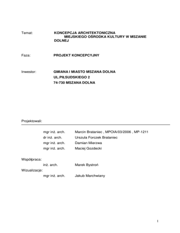 Temat: KONCEPCJA ARCHITEKTONICZNA MIEJSKIEGO OŚRODKA KULTURY W MSZANIE DOLNEJ Faza: PROJEKT KONCEPCYJNY Inwestor: GMIANA I MIASTO MSZANA DOLNA UL.PIŁSUDSKIEGO 2 74-730 MSZANA DOLNA Projektowali: mgr inż. arch. Marcin Brataniec , MPOIA/03/2006 , MP-1211 dr inż. arch. Urszula Forczek Brataniec mgr inż. arch. Damian Mierzwa mgr inż. arch. Maciej Gozdecki inż. arch. Marek Bystroń mgr inż. arch. Jakub Marchwiany Współpraca: Wizualizacje: 1 IDEA W dolinie pomiędzy górami zamieszkali ludzie. W dolinie pomiędzy górami ludzie zbudowali miasto. W dolinie pomiędzy górami miasto jest tworem natury i cywilizacji. Góry i dolina są wzorem form przestrzeni. Jak u początku przestrzeń pomiędzy górami stała się domem człowieka tak natura i cywilizacja łączą się tworząc przestrzeń kultury. Architektura przemienia pejzaż w geometrię. ROZWIĄZANIA FUNKCJONALE Zaprojektowano czysty podział funkcjonalny budynku na części biblioteczną, widowiskową oraz edukacyjno rozrywkową. Powyższe funkcje zlokalizowano wokół wspólnej części halo głównego który ma bezpośredni dostęp z placu przedwejściowego oraz ogrodu jak też i zaplecza. Hal główny stanowi otwartą przestrzeń do której przynależy kawiarnia, schody prowadzące na antresolę części edukacyjnej, pomieszczenie muzeum i foyer sali widowiskowej, szatnia i sanitariaty. Przestrzeń halu połączono wizualnie z częścią czytelni i wypożyczalni bibliotecznej jak także z strefa placu wejściowego i ogrodem. Frontowy blok części widowiskowej składa się z sali dla 200 osób, pomieszczenia konferencyjnego dla 30 osób, zaplecza czterech garderób i pomieszczeń sanitarnych i magazynu. Poprzez dostęp z halu głównego jak też bezpośrednie przejście do ogrodu może być użytkowany niezależnie od części bibliotecznej. Bibliotekę podzieloną na cześć otwartą dla czytelników dostępna bezpośrednio z halu głównego oraz wydzieloną cześć z czytelnią i właściwymi zbiorami woluminów poza przejściem przez strefą kontroli wypożyczenia. Część przynależna do hallu to czytelnia książek i czasopism z kącikiem zabaw dla dzieci, cześć wydzielona to wypożyczalnia z ilością 7000 tys. woluminów, czytelnia ogólna, pokój do pracy naukowej, sala komputerowa, magazyn książek i pomieszczenie biurowe. Odrębny funkcjonalnie blok pomieszczeń stanowi cześć edukacyjnorozrywkowa z salą baletową , pokojami do nauki gry na instrumentach, pracowaniami plastycznymi lub salami edukacji. Pomieszczenia te połączone komunikacyjne z halem głównym i niezależna klatką schodową mogą być użytkowane niezależnie od biblioteki. W budynku zaprojektowani pomieszczenia socjalne sanitarne i biurowe dla administratora jak też niezbędne pomieszczenia techniczne – kotłownia serwerownia i wentylatornia. 2 ROZWIĄZANIA KONSTRUKCYJNE Zaprojektowany budynek o formie nowoczesnej składa się z tradycyjnych i naturalnych rozwiązań materiałowo – budowlanych, których wbudowanie zakłada wykorzystanie współczesnych metod wykonawczych. Posadowienie obiektu na ławach i stopach żelbetowych stosownie do warunków gruntowych i obliczeń konstrukcyjnych na etapie projektu budowlanego i wykonawczego. Konstrukcja ścian i stropów – tradycyjna murowana i z elementami słupów żelbetowych. Posadzka parteru wykonana jako płyta żelbetowa na gruncie z posadzkami przemysłowymi, parkietami drewnianymi i wykładzinami w cześć bibliotecznej. Ściany działowe w pomieszczeniach mokrych ceramiczne tynkowane z okładzinami ceramicznymi. Ściany w pomieszczeniach sali widowiskowej , baletowej, pokojach do nauki muzycznych z okładzinami akustycznymi. Ściany działowe lekkie – szklane i gipsowo kartonowe lub murowane. Stropy projektuje się jako płyty żelbetowe lub drewniane. Sufity podwieszane gipsowo kartonowe z elementami akustycznymi. Konstrukcja zadaszenia części pomiędzy bryłami przewidziana jako ruszt z belek i płatwi z drewna klejonego na siatce prostokątnej podpartymi słupami z drewna klejonego. Poszycie wykonane jako stropodach odwrócony wykonany z membran EPDM z zasypem żwirowym pełniącym bufor termiczny. Konstrukcja zadaszenia głównych brył z elementów drewna klejonego, słupy drewniane w układzie skośnym, konstrukcja dachów z płatwi i belek , poszycie wykonane z blach na rąbek leżący z zakładem mocowanych na deskowaniu pełnym. Ocieplenie dachów z wełny mineralnej lub natryskowo z pianki poliuretanowej. Żaluzje osłaniające fasady przeszklone z desek, ściany wykończone deskowaniem na zakład na ruszcie drewnianym jako ściany trójwarstwowe wentylowane. 3 INFRASTRUKTURA TECHNICZNA Budynek projektuje się jako energooszczędny, nisko energetyczny obiekt z zastosowaniem systemów ekologicznego wspomagania układów instalacyjnych. Przewiduje się włączenie do układu grzewczego (po analizie ekonomicznej) pomp ciepła i solarów podgrzewających ciepła wodę użytkową. Przewiduje się także rekuperację ciepła w wentylacji budynku. Układ instalacji sanitarnych przewiduje wykorzystanie wód deszczowych do wykorzystania na cele utrzymania zieleni otaczającej budynek. Przewiduje się następujące instalacje w obiekcie: a) instalacja wody zimnej i do celów przeciwpożarowych; b) instalacja ciepłej wody użytkowej i jej cyrkulacja; c) instalacja wykorzystująca wodę deszczową do instalacji sanitarnej wewnętrznej; d) kanalizacja sanitarna i deszczowa; e) instalacja centralnego ogrzewania; f) instalacja elektryczna; g) instalacja SAP h) klimatyzacja i wentylacja z odzyskiem ciepła – według preferencji Inwestora; i) instalacja monitoringu; j) instalacja komputerowa i teletechniczna; k) winda osobowa dla osób niepełnosprawnych; l) instalacja alternatywnych źródeł energii - według preferencji Inwestora; m) instalacja EOK (elektroniczna obsługa klienta - katy biblioteczne) n) instalacja monitoringu ( wizja + czujniki bezruchu, detektory dymu itp.); o)