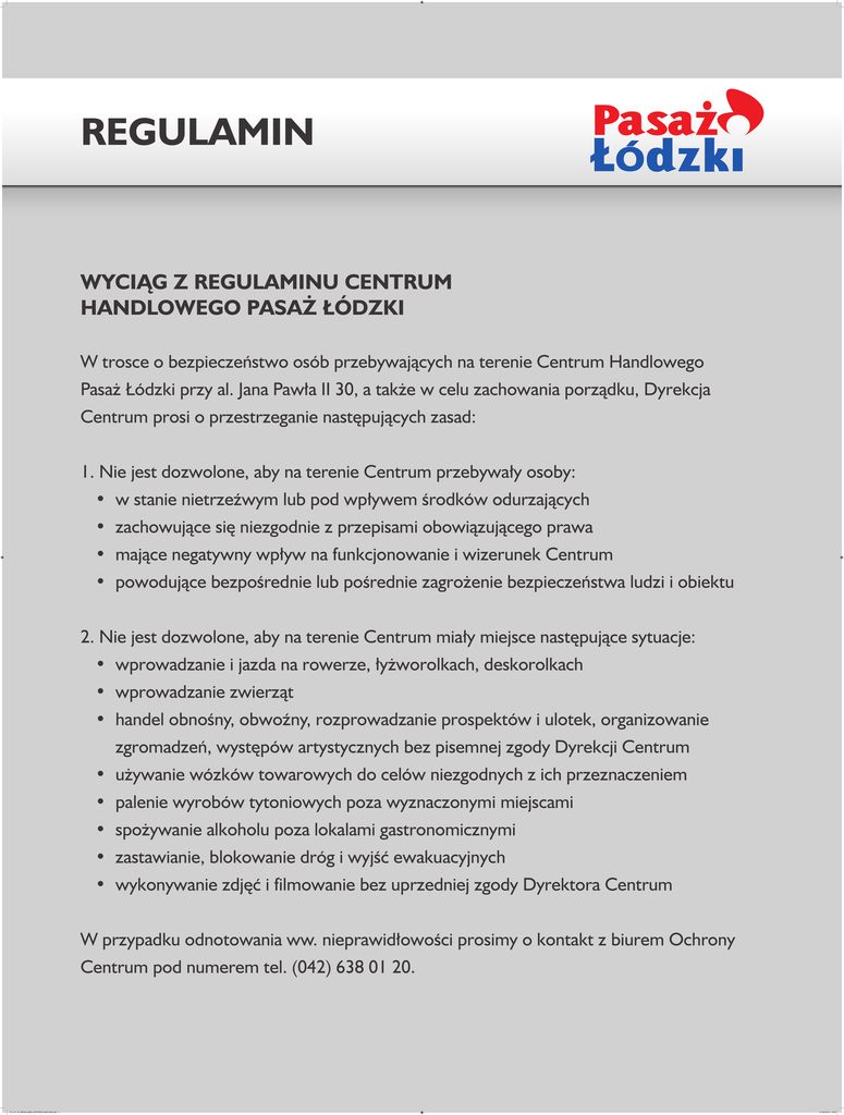 REGULAMIN REGULAMIN WYCIĄG Z REGULAMINU CENTRUM HANDLOWEGO PASAŻ ŁÓDZKI W trosce o bezpieczeństwo osób przebywających na terenie Centrum Handlowego Pasaż Łódzki przy al. Jana Pawła II 30, a także w celu zachowania porządku, Dyrekcja Centrum prosi o przestrzeganie następujących zasad: 1. Nie jest dozwolone, aby na terenie Centrum przebywały osoby: • w stanie nietrzeźwym lub pod wpływem środków odurzających • zachowujące się niezgodnie z przepisami obowiązującego prawa • mające negatywny wpływ na funkcjonowanie i wizerunek Centrum • powodujące bezpośrednie lub pośrednie zagrożenie bezpieczeństwa ludzi i obiektu 2. Nie jest dozwolone, aby na terenie Centrum miały miejsce następujące sytuacje: • wprowadzanie i jazda na rowerze, łyżworolkach, deskorolkach • wprowadzanie zwierząt • handel obnośny, obwoźny, rozprowadzanie prospektów i ulotek, organizowanie zgromadzeń, występów artystycznych bez pisemnej zgody Dyrekcji Centrum • używanie wózków towarowych do celów niezgodnych z ich przeznaczeniem • palenie wyrobów tytoniowych poza wyznaczonymi miejscami • spożywanie alkoholu poza lokalami gastronomicznymi • zastawianie, blokowanie dróg i wyjść ewakuacyjnych • wykonywanie zdjęć i filmowanie bez uprzedniej zgody Dyrektora Centrum W przypadku odnotowania ww. nieprawidłowości prosimy o kontakt z biurem Ochrony Centrum pod numerem tel. (042) 638 01 20. PL_011-16_REGULAMIN_CENTRUM_905x1200.indd 1 21.03.2016 13:29