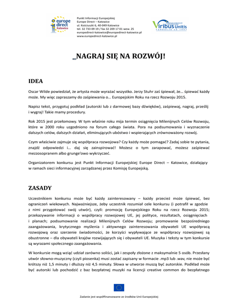 Punkt Informacji Europejskiej Europe Direct – Katowice ul. Kościuszki 6, 40-049 Katowice tel. 32 733 09 19 / fax 32 209 17 01 wew. 25 [email protected] www.europedirect-katowice.pl NAGRAJ SIĘ NA ROZWÓJ! IDEA Oscar Wilde powiedział, że artysta może wyrażać wszystko. Jerzy Stuhr zaś śpiewał, że… śpiewać każdy może. My więc zapraszamy do zaśpiewania o… Europejskim Roku na rzecz Rozwoju 2015. Napisz tekst, przygotuj podkład (autorski lub z darmowej bazy dźwięków), zaśpiewaj, nagraj, prześlij i wygraj! Takie mamy procedury. Rok 2015 jest przełomowy. W tym właśnie roku mija termin osiągnięcia Milenijnych Celów Rozwoju, które w 2000 roku uzgodniono na forum całego świata. Pora na podsumowania i wyznaczenie dalszych celów, dalszych działań, eliminujących ubóstwo i wspierających zrównoważony rozwój. Czym właściwie zajmuje się współpraca rozwojowa? Czy każdy może pomagać? Zadaj sobie te pytania, znajdź odpowiedzi i… daj się zainspirować! Możesz o tym zarapować, możesz zaśpiewać mezzosopranem albo grunge’owo wykrzyczeć. Organizatorem konkursu jest Punkt Informacji Europejskiej Europe Direct – Katowice, działający w ramach sieci informacyjnej zarządzanej przez Komisję Europejską. ZASADY Uczestnikiem konkursu może być każdy zainteresowany – każdy przecież może śpiewać, bez ograniczeń wiekowych. Najważniejsze, żeby uczestnik rozumiał cele konkursu (i potrafił w zgodzie z nimi przygotować swój utwór), czyli: promocję Europejskiego Roku na rzecz Rozwoju 2015; przekazywanie informacji o współpracy rozwojowej UE, jej polityce, rezultatach, osiągnięciach i planach; podsumowanie realizacji Milenijnych Celów Rozwoju; promowanie bezpośredniego zaangażowania, krytycznego myślenia i aktywnego zainteresowania obywateli UE współpracą rozwojową oraz szerzenie świadomości, że korzyści wypływające ze współpracy rozwojowej są obustronne – dla obywateli krajów rozwijających się i obywateli UE. Muzyka i teksty w tym konkursie są wyrazami społecznego zaangażowania. W konkursie mogą wziąć udział zarówno soliści, jak i zespoły złożone z maksymalnie 5 osób. Przesłany utwór słowno-muzyczny (czyli piosenka) musi zostać zapisany w formacie .mp3 lub .wav, nie może być krótszy niż 1,5 minuty i dłuższy niż 4,5 minuty. Słowa w utworze muszą być autorskie. Podkład może być autorski lub pochodzić z baz bezpłatnej muzyki na licencji creative common do bezpłatnego Zadanie jest współfinansowane ze środków Unii Europejskiej Punkt Informacji Europejskiej Europe Direct – Katowice ul. Kościuszki 6, 40-049 Katowice tel. 32 733 09 19 / fax 32 209 17 01 wew. 25 [email protected] www.europedirect-katowice.pl wykorzystania w niekomercyjnych projektach. Rozmiar pliku muzycznego nie może przekroczyć 10 MB. NAGRODY Główną nagrodą w konkursie jest nagranie profesjonalnego teledysku (wideoklipu) do zwycięskiego utworu. Fundatorem jednej z nagród (wyjazdu studyjnego do Parlamentu Europejskiego w Brukseli) jest Pani Poseł do Parlamentu Europejskiego, Lidia Geringer de Oedenberg. ORGANIZATOR Organizatorem konkursu jest Punkt Informacji Europejskiej Europe Direct – Katowice, działający przy Fundacji na Rzecz Wspierania Edukacji i Rozwoju Samorządności wśród Młodzieży VIRIBUS UNITIS (ul. Kościuszki 6, 40-049 Katowice). KONTAKT Punkt Informacji Europejskiej Europe Direct – Katowice 40-049 Katowice, ul. Kościuszki 6 tel.: (32) 733 09 19, (32) 209 17 01 e-mail: [email protected] www.europedirect-katowice.pl www.facebook.com/EDKatowice Zadanie jest współfinansowane ze środków Unii Europejskiej