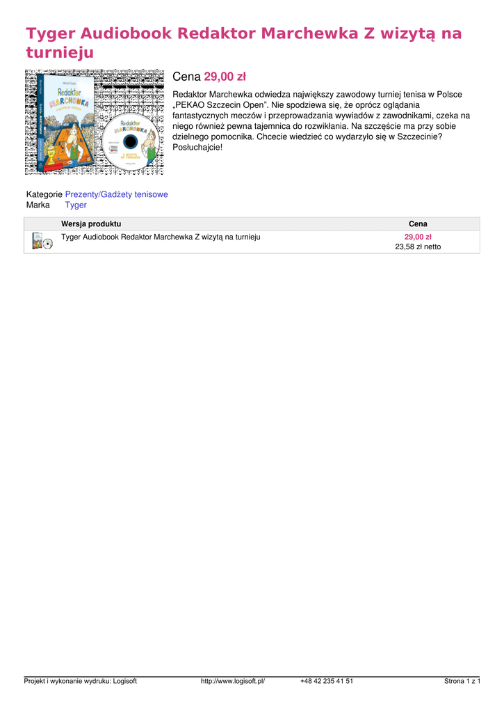 Tyger Audiobook Redaktor Marchewka Z wizytą na turnieju Cena 29,00 zł Redaktor Marchewka odwiedza największy zawodowy turniej tenisa w Polsce „PEKAO Szczecin Open”. Nie spodziewa się, że oprócz oglądania fantastycznych meczów i przeprowadzania wywiadów z zawodnikami, czeka na niego również pewna tajemnica do rozwikłania. Na szczęście ma przy sobie dzielnego pomocnika. Chcecie wiedzieć co wydarzyło się w Szczecinie? Posłuchajcie! Kategorie Prezenty/Gadżety tenisowe Marka Tyger Wersja produktu Cena Tyger Audiobook Redaktor Marchewka Z wizytą na turnieju Projekt i wykonanie wydruku: Logisoft Powered by TCPDF (www.tcpdf.org) http://www.logisoft.pl/ 29,00 zł 23,58 zł netto +48 42 235 41 51 Strona 1 z 1