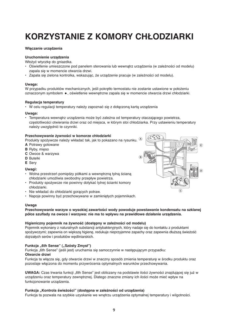 KORZYSTANIE Z KOMORY CHŁODZIARKI Włączanie urządzenia Uruchomienie urządzenia Włożyć wtyczkę do gniazdka. • Oświetlenie umieszczone pod panelem sterowania lub wewnątrz urządzenia (w zależności od modelu) zapala się w momencie otwarcia drzwi. • Zapala się zielona kontrolka, wskazując, że urządzenie pracuje (w zależności od modelu). Uwaga: W przypadku produktów mechanicznych, jeśli pokrętło termostatu nie zostanie ustawione w położeniu oznaczonym symbolem , oświetlenie wewnętrzne zapala się w momencie otwarcia drzwi chłodziarki. • Regulacja temperatury • W celu regulacji temperatury należy zapoznać się z dołączoną kartą urządzenia Uwaga: • Temperatura wewnątrz urządzenia może być zależna od temperatury otaczającego powietrza, częstotliwości otwierania drzwi oraz od miejsca, w którym stoi chłodziarka. Przy ustawieniu temperatury należy uwzględnić te czynniki. Przechowywanie żywności w komorze chłodziarki Produkty spożywcze należy wkładać tak, jak to pokazano na rysunku. A Potrawy gotowane B Ryby, mięso C Owoce & warzywa D Butelki E Sery Uwagi: • Wolna przestrzeń pomiędzy półkami a wewnętrzną tylną ścianą chłodziarki umożliwia swobodny przepływ powietrza. • Produkty spożywcze nie powinny dotykać tylnej ścianki komory chłodziarki. • Nie wkładać do chłodziarki gorących potraw. • Napoje powinny być przechowywane w zamkniętych pojemnikach. Uwaga Przechowywanie warzyw o wysokiej zawartości wody powoduje powstawanie kondensatu na szklanej półce szuflady na owoce i warzywa: nie ma to wpływu na prawidłowe działanie urządzenia. Higieniczny pojemnik na żywność (dostępny w zależności od modelu) Pojemnik wykonany z naturalnych substancji antybakteryjnych, który nadaje się do kontaktu z produktami spożywczymi; zapewnia on większą higienę, redukuje nieprzyjemne zapachy oraz zapewnia dłuższą świeżość dojrzałych serów i produktów wędliniarskich. Funkcja „6th Sense” („Szósty Zmysł”) Funkcja „6th Sense” (jeśli jest) uruchamia się samoczynnie w następującym przypadku: Otwarcie drzwi Funkcja ta włącza się, gdy otwarcie drzwi w znaczny sposób zmienia temperaturę w środku produktu oraz pozostaje włączona do momentu przywrócenia optymalnych warunków przechowywania. UWAGA: Czas trwania funkcji „6th Sense” jest obliczany na podstawie ilości żywności znajdującej się już w urządzeniu oraz temperatury zewnętrznej. Dlatego znaczne zmiany ich ilości może mieć wpływ na funkcjonowanie urządzenia. Funkcja „Kontrola świeżości” (dostępna w zależności od urządzenia) Funkcja ta pozwala na szybkie uzyskanie we wnętrzu urządzenia optymalnej temperatury i wilgotności. 9 JAK URUCHOMIĆ KOMORĘ NISKIEJ TEMPERATURY Komora niskiej temperatury jest typu , lub . W komorach lub można przechowywać mrożonki przez czas podany na opakowaniu. Jeżeli komora niskiej temperatury oznaczona to , można w niej również zamrażać świeżą żywność. Ilość świeżych produktów, jakie można zamrozić w ciągu 24 godzin, jest podana na tabliczce znamionowej. Uwaga: Komora niskiej temperatury może utrzymywać odpowiednią temperaturę do przechowywania żywności nawet w przypadku przerw w zasilaniu. Zaleca się jednak, aby w tym czasie nie otwierać drzwi komory. Jak zamrażać świeżą żywność (tylko w komorze ) Ważne • Świeży produkt przeznaczony do zamrożenia, należy szczelnie zapakować w: folię aluminiową, folię przeźroczystą, szczelne opakowania z tworzywa, pojemniki polietylenowe z pokrywkami, pojemniki zamrażalnikowe, o ile nadają się do zamrażania żywności. • Ułożyć produkty przeznaczone do zamrożenia w przegrodzie górnej, pozostawiając dostateczne odstępy pomiędzy opakowaniami, aby umożliwić swobodny przepływ powietrza. • Aby zamrażanie, gdy do komory zamrażarki zostały włożone produkty, przebiegało w sposób optymalny, należy obrócić pokrętło termostatu o połowę działki w kierunku niższych liczb. • Po 24 godzinach mrożenie jest zakończone. Dla urządzeń z komorą Czas przechowywania świeżej zamrożonej żywności podany jest w tabeli obok. W momencie zakupu mrożonek należy upewnić się, czy: • Opakowanie lub paczka nie są uszkodzone, gdyż jakość produktu może ulec obniżeniu. Jeśli opakowanie jest napęczniałe lub z PRODUKTY MIESIĄCE plamkami wilgoci, oznacza to, że produkt nie był przechowywany w optymalnych warunkach i mógł się zacząć rozmrażać. • Mrożonki należy kupować w końcowej fazie zakupów, a do ich przenoszenia trzeba używać toreb termicznych. • Po powrocie do domu należy niezwłocznie włożyć je do komory niskiej temperatury. • Nie można zamrażać ponownie produktów częściowo rozmrożonych, lecz należy spożyć je w ciągu 24 godzin. • Unikać albo zredukować do minimum wahania temperatury. Przestrzegać daty przydatności do spożycia, podanej na opakowaniu. • Należy zawsze postępować według instrukcji przechowywania mrożonek umieszczonej na opakowaniu. Wytwarzanie kostek lodu • Należy napełnić wodą odpowiednią wanienkę do poziomu 2/3 i umieścić ją w komorze niskiej temperatury. • W celu wyjęcia pojemniczka z lodem przymarzniętego do dna komory niskiej temperatury nie wolno używać ostrych lub kłujących narzędzi. • Aby ułatwić wyjęcie kostek lodu z wanienki, należy ją lekko zgiąć. 10 JAK ODSZRONIĆ I OCZYŚCIĆ CHŁODZIARKĘ Przed przystąpieniem do jakiejkolwiek czynności konserwacji lub czyszczenia należy wyjąć wtyczkę z gniazdka, aby odłączyć urządzenie od zasilania z sieci elektrycznej. Odszranianie chłodziarki następuje całkowicie automatycznie. Faza automatycznego odszraniania ujawnia się poprzez obecność pojedynczych kropel wody na tylnej wewnętrznej ściance urządzenia. Woda pochodząca z odszraniania ścieka samoczynnie do otworu spustowego, zbiera się w pojemniku, sk