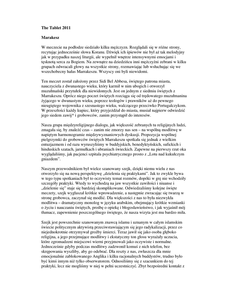 The Tablet 2011 Marakesz W meczecie na podłodze siedziało kilku mężczyzn. Rozglądali się w różne strony, recytując jednocześnie słowa Koranu. Dźwięk ich śpiewów nie był aż tak melodyjny jak w przypadku naszej liturgii, ale wypełnił wnętrze intensywnymi emocjami i tęsknotą serca za Bogiem. Na zewnątrz na dziedzińcu inni mężczyźni zebrani w kilku grupach odwracali głowy na wszystkie strony, rozmawiając lub wsłuchując się we wszechobecny hałas Marrakeszu. Wszyscy oni byli niewidomi. Ten meczet został założony przez Sidi Bel Abbesa, świętego patrona miasta, nauczyciela z dwunastego wieku, który karmił w nim ubogich i otworzył muzułmański przytułek dla niewidomych. Jest on jednym z siedmiu świętych z Marrakeszu. Oprócz niego poczet świętych rozciąga się od trędowatego muzułmanina żyjącego w dwunastym wieku, poprzez teologów i prawników aż do pewnego nieugiętego wojownika z szesnastego wieku, walczącego przeciwko Portugalczykom. W przeszłości każdy kupiec, który przyjeżdżał do miasta, musiał najpierw odwiedzić jego siedem zawij* i grobowców, zanim przystąpił do interesów. Nasza grupa międzyreligijnego dialogu, jak większość zebranych tu religijnych ludzi, zmagała się, by znaleźć czas – zanim nie zmorzy nas sen – na wspólną modlitwę w napiętym harmonogramie międzywyznaniowych dyskusji. Propozycja wspólnej pielgrzymki do grobowców świętych Marrakeszu spotkała się jednak z wielkim entuzjazmem i od razu wyruszyliśmy w buddyjskich, benedyktyńskich, sufickich i hinduskich szatach, jarmułkach i ubraniach świeckich. Zapewne na pierwszy rzut oka wyglądaliśmy, jak pacjenci szpitala psychiatrycznego prosto z „Lotu nad kukułczym gniazdem”. Naszym przewodnikiem był wielce szanowany szejk, dzięki niemu wielu z nas otworzyło się na nową perspektywę „dzielenia się praktykami”. Jak to zwykle bywa w tego typu spotkaniach był to oczywisty temat rozmów, dopóki w grę nie wchodziły szczegóły praktyki. Wtedy to wychodzą na jaw wszystkie zawiłości i niuanse i „dzielenie się” staje się bardziej skomplikowane. Odwiedzaliśmy kolejne święte meczety, szejk wygłaszał krótkie wprowadzenie, a następnie zwracając się twarzą w stronę grobowca, zaczynał się modlić. Dla większości z nas to była niezwykła modlitwa – dramatyczny monolog w języku arabskim, obejmujący krótkie wzmianki o życiu i nauczaniu świętych, prośbę o opiekę i błogosławieństwo, i jak wyjaśnił mój tłumacz, zapewnienie poszczególnego świętego, że nasza wizyta jest mu bardzo miła. Szejk jest powszechnie szanowanym znawcą islamu i uznanym w całym islamskim świecie politycznym aktywistą przeciwstawiającym się jego radykalizacji, przez co niejednokrotnie otrzymywał groźby śmierci. Teraz jawił się jako osoba głęboko religijna, a jego przejmujące modlitwy i ekstatyczny ton głosu wyrażały uczucia, które zgromadzeni miejscowi wierni przyjmowali jako oczywiste i normalne. Jednocześnie gdyby podczas modlitwy zadzwonił komuś z nich telefon, bez skrępowania wyszliby, aby go odebrać. Dla reszty z nas, zwłaszcza dla mnie emocjonalnie zablokowanego Anglika i kilku racjonalnych buddystów, trudno było być kimś innym niż tylko obserwatorem. Odnosiliśmy się z szacunkiem do tej praktyki, lecz nie mogliśmy w niej w pełni uczestniczyć. Zbyt bezpośredni kontakt z czymś, w co nie możesz się całkowicie włączyć sprawia, że twój szacunek zmienia się co najwyżej w tolerancję. Cokolwiek więcej poza tą granicą może przynieść jedynie efekty odwrotne od zamierzonych. Tego wieczoru rozpoczynał się szabat i Żydzi chcieli nam pokazać, jak bardzo jest im drogi ten dzień odpoczynku. Wcześniej rozmawialiśmy o możliwych korzyściach, jakie mogą przynieść nasze rozmowy, np. w formie prostej praktyki dostrzegania świętego czasu i przestrzeni w kulturze zdominowanej przez kult zakupów. Wobec szabatu na nowo stawiliśmy czoła wyzwaniu, by podzielić się tym, co kochamy z ludźmi, którzy mają inne poglądy i nie do końca rozumieją nasze własne duchowe upodobania. Oto nowe pytania dla naszych czasów. Dialog międzyreligijny został zapoczątkowany przez kupców przybywających z różnych stron świata, by sprzedawać swoje wyroby garncarskie, przyprawy czy ubrania. Kiedy siadali razem wokół ogniska w Samarkandzie, wymieniali się nie tylko pomysłami i przekonaniami, lecz także religijnymi praktykami. Żadna religia nie może odciąć się od wpływu, jaki wywierały na nią inne religie poprzez ten dialog naszych przodków. Ale dziś presja nasiliła się, a dialog zmienił się w świadome działania – nieodzowny element ciągłego utrzymywania pokoju w świecie. Dialog nas wzajemnie ubogaca, ale wciąż sprawia trudności, gdyż nie wyczerpuje się on w uczonych dysputach i organizacji podniosłych uroczystości przez poszczególnych przywódców religijnych. Powinien on zstąpić do korzeni poszczególnych tradycji duchowych, tak by poprzez nie można było lepiej poznać swoją własną tradycję. Być może udałoby się nawet stworzyć jakąś uniwersalną praktykę, która byłaby do zaakceptowania przez wszystkich; przyznaję jednak, że nie wiem, jak tego dokonać. Bez wątpienia uniwersalna jest cisza, nie stwarza zagrożenia dla ludzi o otwartych umysłach, jest kojąca i jednocząca. Wracaliśmy do tętniących straganów Marrakeszu, gdzie zewnętrzny chaos zagłuszał ludzkie pragnienie ładu, a małe sklepiki i stragany uginały się od różnych towarów – mis z czerwonymi i pomarańczowymi przyprawami, koszy z ziołami, stosów owoców i przyborów kuchennych. Gryzący dym ze straganów z jedzeniem unosił się wokoło. Tam kupno i sprzedaż zależy od człowieka i jego osobowości, w przeciwieństwie do zmechanizowanych kas w naszych samoobsługowych supermarketach, których towary krzyczą do nas poprzez swój ofensywny marketing i nie