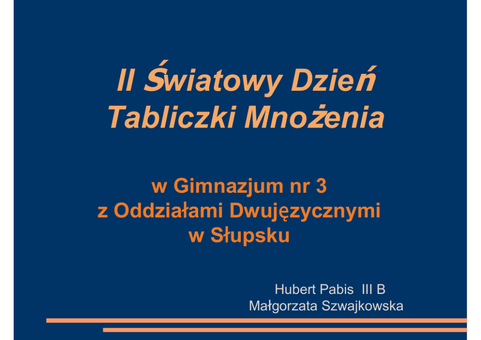 II Światowy Dzień Tabliczki MnoŜenia w Gimnazjum nr 3 z Oddziałłami Dwuję ęzycznymi w Słłupsku Hubert Pabis III B Małgorzata Szwajkowska Trochę o akcji Światowy Dzień Tabliczki MnoŜenia (WMTDay) to bezpłatna akcja edukacyjna. Odbywa się w ostatni piątek września, który w tym roku przypada na 28 dzień miesiąca.Akcja ma na celu zachęcić wszystkich do przypomnienia sobie tabliczki mnoŜenia. Uczniowie, którzy w trakcie wakacji zdąŜyli zapomnieć tabliczkę mnoŜenia, mają okazję nadrobić te zaległości. Dorośli mogą popisać się przed dziećmi doskonałą znajomością trudnych przypadków mnoŜenia. Jak wykazała poprzednia edycja zarówno jedni jak i drudzy świetnie się przy tym bawią. Kraje z całego świata teŜ uczestniczą w tej akcji edukacyjnej , np. Irlandia , Stany Zjednoczone , Portugalia , Nowa Zelandia bądź Austria. Na czym to polega? Na przeprowadzaniu krótkich egzaminów z tabliczki mnoŜenia przez Komisje oraz Patrole Egzaminacyjne. Ich skład tworzą uczniowie pod opieką osoby dorosłej. MoŜliwe są róŜne warianty najczęściej jednak to młodsi uczniowie przepytują starszych kolegów bądź dorosłych zgodnie z mottem: "Młodsi sprawdzają czy starsi tabliczkę mnoŜenia znają". DuŜo emocji wywołują egzaminy przeprowadzane przez Patrole Egzaminacyjne MT. Stroną, która popisuje się znajomością tabliczki mnoŜenia mogą być przypadkowi przechodnie Dodatkowym aspektem są liczne przygotowania uczestników w zakresie transparentów, plakatów czy haseł, informujących o odbywającym się święcie matematycznym. Kto jest organizatorem? 1. Organizator Główny - Wydawnictwo Edukacyjne WKM „Rachmistrz” Andrzej Grabowski, Szczecinek, Polska. 2. Organizatorzy Lokalni - placówki edukacyjne, które organizują obchody Światowego Dnia Tabliczki MnoŜenia na swoim terenie lub w swojej miejscowości. 3. Organizatorzy Rodzinni - osoby, które organizują egzaminy z Tabliczki MnoŜenia w gronie rodzinnym i znajomych. Kto moŜe zostać egzaminatorem lokalnym bądź rodzinnym? KaŜda placówka edukacyjna - szkoła podstawowa, gimnazjum, szkoła średnia oraz organizacje pozarządowe moŜe zostać egzaminatorem lokalnym , natomiast kaŜda osoba moŜe zostać egzaminatorem rodzinnym - jest to świetna okazja do spotkania kilku rodzin z dziećmi. Jak i gdzie przeprowadzane są egzaminy? Wśród metod zaproponowanych przez Głównego Organizatora wyróŜnia się: losowanie pytań, odpowiadanie słowne oraz odpowiedzi na karty matematyczne „Tabliczka MnoŜenia”. Podczas I WMTday 2011 Organizatorzy Lokalni wielokrotnie wykazywali się niezwykłą pomysłowością w wymyślaniu róŜnych ciekawych zabaw, konkursów i zawodów.Miejsce przeprowadzania egzaminów ustala Organizator Lokalny i Rodzinny. Mogą to być: szkoła, park, dom, galeria handlowa, ogródek, wspólne miejsce spotkań. Tegoroczna – II edycja akcji odbędzie się pod hasłem: EDUKACJA-ZABAWA-INTEGRACJA Dlaczego edukacja? Światowy Dzień Tabliczki MnoŜenia to wydarzenie matematyczne, edukujące zarówno młodzieŜ jak i dorosłych w zakresie tabliczki mnoŜenia. Dlaczego zabawa? Edukacja matematyczna jest efektywniejsza gdy jest połączona z zabawą. Akcja dostarcza jej bardzo wiele. Poczynając od przygotowania transparentów, plakatów przez wystrój klas, stanowisk egzaminacyjnych aŜ po samo uczestnictwo w akcji. Wielka frajdą dla uczniów jest egzaminowanie starszych kolegów czy dorosłych. Rola egzaminatora jest dla nich bardzo waŜna. Dlaczego integracja? W organizację tego Dnia zaangaŜowani są nie tylko nauczyciele i uczniowie, ale takŜe ich rodziny. Akcja pozwala na integrację osób starszych z młodszymi oraz tych, którzy wcześniej się nie znali zarówno w trakcie przygotowań do Obchodów WMTDay 2012, jak i w ich trakcie. A teraz trochę o akcji w Słupsku Dnia 28 września 2012 r. uczniowie klasy III B z Gimnazjum r 3 z Oddziałami Dwujęzycznymi w Słupsku wzięli udział w akcji "Młodzi sprawdzają, jak starsi tabliczkę mnoŜenia znają" w ramach II Światowego Dnia Tabliczki MnoŜenia. Pierwsza grupa (pod okiem pani Ewy Siwiec) udała się do Ratusza, druga (wraz z panią Małgorzatą Topką) poszła do siedziby Głosu Pomorza, uczniowie trzeciej i czwartej grupy (pod nadzorem pani Małgorzaty Szwajkowskiej) sprawdzali znajomość mnoŜenia na ulicach miasta, natomiast czwarta grupa, z panią Małgorzatą Korejwo, przepytywała słupszczan w urzędach mieszczących się przy ul. Jana Pawła II. Łącznie odpytano aŜ 122 osoby, z czego 114 razy (93,4%) uczniowie mieli przyjemność wręczenia certyfikatu znajomości tabliczki mnoŜenia. Tak wysoki wynik bez wątpienia świadczy o tym, Ŝe Słupsk bardzo dobrze zna tabliczkę mnoŜenia. Warto takŜe wspomnieć, Ŝe grupy, które udały się do siedziby Głosu Pomorza oraz do Ratusza trafiły na strony internetowe tych instytucji. A oto artykuł , który pojawił się na stronie Głosu Pomorza Komentarze internautów „Bo gimnazjaliści potrafią być mili. A to dobre sprawdzenie własnej pamięci.” Mietek „Szkoda, Ŝe aŜ tyle osób nie było chętnych sprawdzić się z tabliczki mnoŜenia.” Grzegorz „Bardzo fajna akcja. MłodzieŜ sympatyczna. Nic nie było na siłę, zdobyłem certyfikat.” on24 A oto artykuł z serwisu miejskiego: Galeria zdjęć: Koniec