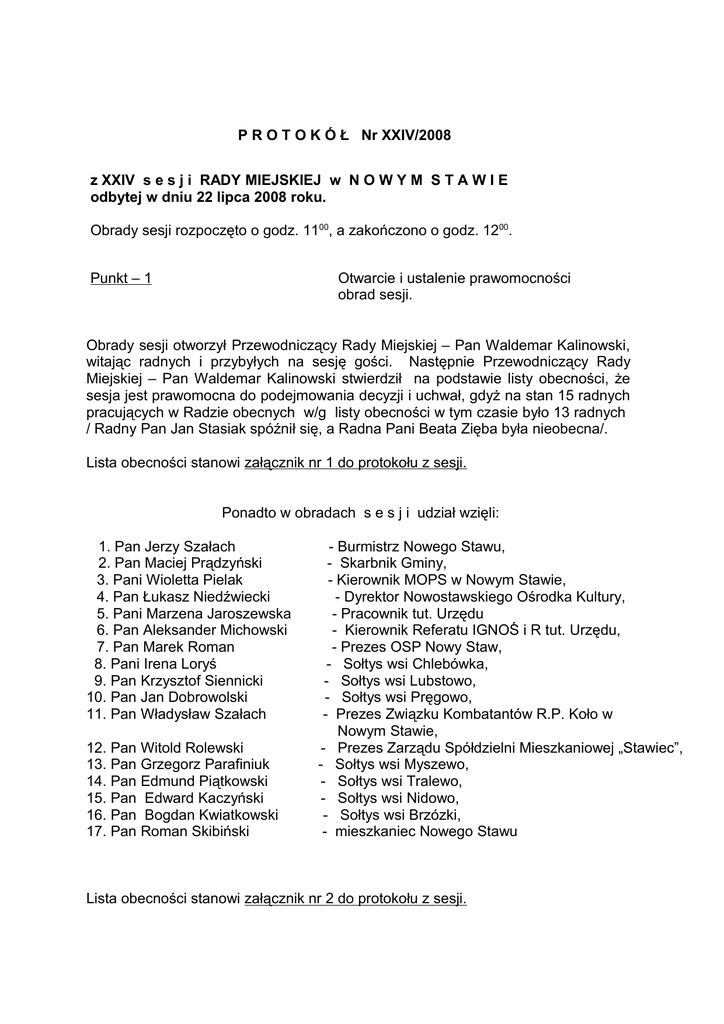 P R O T O K Ó Ł Nr XXIV/2008 z XXIV s e s j i RADY MIEJSKIEJ w N O W Y M S T A W I E odbytej w dniu 22 lipca 2008 roku. Obrady sesji rozpoczęto o godz. 1100, a zakończono o godz. 1200. Punkt – 1 Otwarcie i ustalenie prawomocności obrad sesji. Obrady sesji otworzył Przewodniczący Rady Miejskiej – Pan Waldemar Kalinowski, witając radnych i przybyłych na sesję gości. Następnie Przewodniczący Rady Miejskiej – Pan Waldemar Kalinowski stwierdził na podstawie listy obecności, że sesja jest prawomocna do podejmowania decyzji i uchwał, gdyż na stan 15 radnych pracujących w Radzie obecnych w/g listy obecności w tym czasie było 13 radnych / Radny Pan Jan Stasiak spóźnił się, a Radna Pani Beata Zięba była nieobecna/. Lista obecności stanowi załącznik nr 1 do protokołu z sesji. Ponadto w obradach s e s j i udział wzięli: 1. Pan Jerzy Szałach 2. Pan Maciej Prądzyński 3. Pani Wioletta Pielak 4. Pan Łukasz Niedźwiecki 5. Pani Marzena Jaroszewska 6. Pan Aleksander Michowski 7. Pan Marek Roman 8. Pani Irena Loryś 9. Pan Krzysztof Siennicki 10. Pan Jan Dobrowolski 11. Pan Władysław Szałach 12. Pan Witold Rolewski 13. Pan Grzegorz Parafiniuk 14. Pan Edmund Piątkowski 15. Pan Edward Kaczyński 16. Pan Bogdan Kwiatkowski 17. Pan Roman Skibiński - Burmistrz Nowego Stawu, - Skarbnik Gminy, - Kierownik MOPS w Nowym Stawie, - Dyrektor Nowostawskiego Ośrodka Kultury, - Pracownik tut. Urzędu - Kierownik Referatu IGNOŚ i R tut. Urzędu, - Prezes OSP Nowy Staw, - Sołtys wsi Chlebówka, - Sołtys wsi Lubstowo, - Sołtys wsi Pręgowo, - Prezes Związku Kombatantów R.P. Koło w Nowym Stawie, - Prezes Zarządu Spółdzielni Mieszkaniowej „Stawiec”, - Sołtys wsi Myszewo, - Sołtys wsi Tralewo, - Sołtys wsi Nidowo, - Sołtys wsi Brzózki, - mieszkaniec Nowego Stawu Lista obecności stanowi załącznik nr 2 do protokołu z sesji. 2 Punkt – 2 Zatwierdzenie porządku obrad. Pan Waldemar Kalinowski - Przewodniczący Rady Miejskiej przedstawił Radzie porządek obrad sesji. Do porządku obrad uwag nie zgłoszono w związku z tym Rada w drodze głosowania / 14 osób za, 1 nieobecna/ przyjęła porządek obrad w wersji jak niżej: 1. Otwarcie i ustalenie prawomocności obrad sesji. 2. Zatwierdzenie porządku obrad. 3. Przyjęcie protokołów z XXII i XXIII sesji Rady Miejskiej w Nowym Stawie. 4. Informacja o pracy komisji stałych Rady Miejskiej w Nowym Stawie w okresie międzysesyjnym: 1/ Informacja ze wspólnego posiedzenia Komisji. 5. Interpelacje i zapytania radnych. 6. Podjęcie uchwał Rady Miejskiej w Nowym Stawie – uchwały w sprawie: 1/ zmian w budżecie miasta i gminy na 2008 rok, 2/ zakupu udziałów w Centralnym Wodociągu Żuławskim Spółka z o.o. w Nowym Dworze Gdańskim, 3/ zmiany Uchwały Nr 190/2004 Rady Miejskiej w Nowym Stawie z dnia 14 grudnia 2004 roku w sprawie uchwalenia Wieloletniego Planu Inwestycyjnego Miasta i Gminy Nowy Staw na lata 2005 – 2009, 4/ określenia zasad wnoszenia, cofania i zbywania udziałów i akcji przez Burmistrza Nowego Stawu. 7. Zapytania i wolne wnioski radnych oraz przybyłych na sesję gości. 8. Informacje i komunikaty. 9. Zakończenie obrad sesji. Punkt – 3 Przyjęcie protokołów XXII i XXIII sesji Rady Miejskiej w Nowym Stawie. Do powyższych protokołów uwag nie zgłoszono, w związku z tym zostały przez Radę przyjęte do akceptującej wiadomości. 3 Punkt – 4 Informacja o pracy komisji stałych Rady Miejskiej w Nowym Stawie w okresie międzysesyjnym. p.pkt. 1 Informacja ze wspólnego posiedzenia Komisji. O przedstawienie powyższej informacji Przewodniczący Rady Miejskiej – Pan Waldemar Kalinowski poprosił Przewodniczącego wspólnego posiedzenia - Pana Witolda Nowickiego. Do przedstawionej informacji uwag nie zgłoszono, w związku z tym Przewodniczący Rady Miejskiej uznał, że została przez Radę przyjęta do akceptującej wiadomości - informacja stanowi załącznik nr 3 do protokołu z sesji. Punkt – 5 Interpelacje i zapytania radnych. W powyższym punkcie głos zabrali: Radny Pan Zenon Antys – członek Komisji Gospodarczo – Finansowej: „ Chciałem powrócić do sprawy tej działki, co Pan Skibiński ją miał, gdyż działka ta podobno została zabrana Panu Skibńskiemu i przejęta z powrotem przez gminę. Rosną tam chwasty i chciałbym wiedzieć, czy będzie tam obkoszone.” Burmistrz Nowego Stawu – Pan Jerzy Szałach poinformował, iż musi sprawdzić czy dana umowa dzierżawy na tą działkę w całości, czy w części jest wypowiedziana. „Ponieważ są to tereny przewidziane w palnie zagospodarowania przestrzennego pod rozwój i przemysł. Z tego co pamiętam to firma „Complex” zwracała się o kupno tam dużych terenów pod budowę swojego zaplecza. O ile została wypowiedziana ta działka, to jak najbardziej umowę dzierżawy przywrócę, gdyż firma „Complex” wycofała się z tego. Na chwilę obecną żadnego rozwoju tam nie ma.” Radna Pani Maria Okupna – członek Komisji Gospodarczo – Finansowej dodała: „O ile ja sobie przypominam, na temat tej działki to tam był bardzo wysoki czynsz dzierżawny, bo to były działki pod inwestycje, a nie jako rolne i dlatego Pan Skibiński się z tego wycofał.” Przewodniczący Rady Miejskiej - Pan Waldemar Kalinowski zwrócił się z prośbą o wyjaśnienie powyższej sprawy i ewentualnie zgłoszenie wniosku, do którego Burmistrz Nowego Stawu odniesie się na piśmie. Burmistrz Nowego Stawu – Pan Jerzy Szałach dodał, że pisemnie poinformuje osoby zainteresowane. „Uważam, że ten kawałek ziemi powinien być przeznaczony pod działalność rolniczą do momentu, kiedy się znajdzie znowu inwestor.” 4 Radny Pan Witold Nowicki – Przewodniczący Komisji Gospodarczo – Finansowej : „Jest rzeczą naocznie do stwierdzenia, że i wolą Burmistrza i wolą mieszkańców i wola radnych jest stałe estetyzowanie gminy. I to zaczyna być widać , natomiast jest elementem denerwującym nienadążanie przez je
