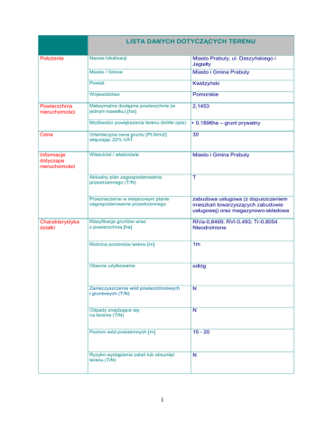 LISTA DANYCH DOTYCZĄCYCH TERENU Położenie Powierzchnia nieruchomości Nazwa lokalizacji Miasto Prabuty, ul. Daszyńskiego i Jagiełły Miasto / Gmina Miasto i Gmina Prabuty Powiat Kwidzyński Województwo Pomorskie Maksymalna dostępna powierzchnia (w jednym kawałku) ha 2,1453 Możliwości powiększenia terenu (krótki opis) + 0,1896ha – grunt prywatny Cena Orientacyjna cena gruntu PLN/m2 włączając 22% VAT 30 Informacje dotyczące nieruchomości Własciciel / właściciele Miasto i Gmina Prabuty Aktualny plan zagospodarowania przestrzennego (T/N) T Przeznaczenie w miejscowym planie zagospodarowania przestrzennego zabudowa usługowa (z dopuszczeniem mieszkań towarzyszących zabudowie usługowej) oraz magazynowo-składowa Klasyfikacja gruntów wraz z powierzchnią ha RIVa-0,8469; RVI-0,493; Tr-0,8054 Nieodrolnione Różnica poziomów terenu m 1m Obecne użytkowanie odłóg Zanieczyszczenia wód powierzchniowych i gruntowych (T/N) N Odpady znajdujące się na terenie (T/N) N Poziom wód podziemnych m 15 - 20 Ryzyko wystąpienia zalań lub obsunięć terenu (T/N) N Charakterystyka działki 1 Ograniczenia budowlane Połączenia transportowe Przeszkody podziemne (T/N) N Przeszkody występujące na powierzchni terenu (T/N) N Istniejące ograniczenia ekologiczne (T/N) N Budynki i zabudowania na terenie (T/N) parterowy budynek użytkowy o pow. 2 2 zabudowy 60m z wagą o pow. 18m Procent dopuszczalnej zabudowy 60% Ograniczenia wysokości budynków m 13 Strefa buforowa m Zróżnicowana wg mpzp Inne, jeśli występują N Droga dojazdowa do terenu (rodzaj drogi i jej szerokość) droga wojewódzka nr 521 Kwidzyn – Iława o szer. 15m oraz droga powiatowa o szer. 10m 30km do nowo budowanego mostu przez Wisłę k/Kwidzyna łączącego autostradę A1 z siecią drogową powiatu kwidzyńskiego. Autostrada / droga krajowa km Istniejąca infrastruktura Kolej km Dworzec PKP Prabuty – 0,2km Bocznica kolejowa km Rampa kolejowa – 0,1km Najbliższe lotnisko międzynarodowe km Gdańsk – 100km Najbliższe miasto wojewódzkie km Gdańsk i Olszyn – 100 Bydgoszcz - 115km Elektryczność na terenie (T/N) N Odległość przyłącza od granicy terenu 2 50m Napięcie 15kV Dostępna moc 8MW Gaz na terenie (T/N) N Odległość przyłącza od granicy działki 50m Wartość kaloryczna 35,982 Średnica rury Stal 100 – niskie ciśnienie PE 250/200 – średnie ciśnienie Dostępna objętość Max 2000 Nm /h 3 Woda na terenie (T/N) N Odległość przyłącza od granicy terenu 50m Dostępna objętość 400m /24h 3 Kanalizacja na terenie (T/N) N Odległość przyłącza od granicy terenu 50m Dostępna objętość 1000 – 1500m /24h Ograniczenie zrzutu ścieków Docelowo 2500m /24h 3 Obecnie 1000m /24h 3 3 Odprowadzenie wód deszczowych na terenie (T/N) N Oczyszczalnia ścieków na terenie bądź w bezpośrednim sąsiedztwie Miejska Oczyszczalnia Ścieków – 2,5km Telefony (T/N) N Odległość przyłącza od granicy terenu 50m Liczba dostępnych linii analogowych Na warunkach lokalnego operatora Liczba dostępnych linii ISDN Na warunkach lokalnego operatora 3 Uwagi Prabuty znajdują się na trasie magistrali kolejowej Warszawa – Gdynia z b. dobrym połączeniem PKP. W Kwidzynie odległym o 20km od Prabut ulokowały swoje zakłady spółki z kapitałem zagranicznym: - International Paper Kwidzyn S.A. (USA) przemysł papierniczy - Sofrel Electronics (Francja) przemysł elektroniczny - Plati Polska (Francja/Włochy) przemysł elektroniczny - BE&K (USA) usługi dla przemysłu - Jabil Circuit Poland (USA) przemysł elektroniczny - Knauf Pack (Niemcy) przemysł chemiczny - BM Polska (Włochy) przemysł chemiczny Osoba przygotowująca ofertę Marta Panasiuk, inspektor ds. inwestycji, promocji i pozyskiwania środków pozabudżetowych, 55 262 41 63, [email protected], angielski – biegle Osoby do kontaktu Krzysztof Wojewódzki, inspektor ds. inwestycji, promocji i pozyskiwania środków pozabudżetowych, 55 262 41 58, [email protected], rosyjski - dobrze Marta Panasiuk, inspektor ds. inwestycji, promocji i pozyskiwania środków pozabudżetowych, 55 262 41 63, [email protected], angielski – biegle Krzysztof Niziałek, Pełnomocnik Burmistrza ds. podatków i opłat lokalnych, 55 262 41 65, [email protected], angielski - dobrze 4