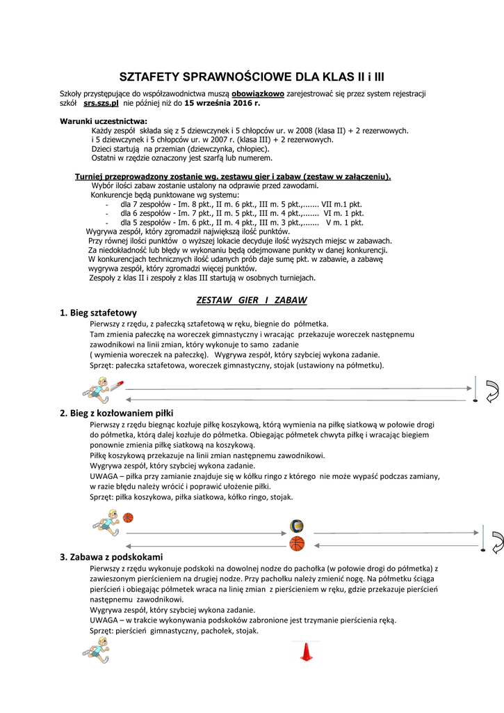 SZTAFETY SPRAWNOŚCIOWE DLA KLAS II i III Szkoły przystępujące do współzawodnictwa muszą obowiązkowo zarejestrować się przez system rejestracji szkół srs.szs.pl nie później niż do 15 września 2016 r. Warunki uczestnictwa: Każdy zespół składa się z 5 dziewczynek i 5 chłopców ur. w 2008 (klasa II) + 2 rezerwowych. i 5 dziewczynek i 5 chłopców ur. w 2007 r. (klasa III) + 2 rezerwowych. Dzieci startują na przemian (dziewczynka, chłopiec). Ostatni w rzędzie oznaczony jest szarfą lub numerem. Turniej przeprowadzony zostanie wg. zestawu gier i zabaw (zestaw w załączeniu). Wybór ilości zabaw zostanie ustalony na odprawie przed zawodami. Konkurencje będą punktowane wg systemu: dla 7 zespołów - Im. 8 pkt., II m. 6 pkt., III m. 5 pkt.,....... VII m.1 pkt. dla 6 zespołów - Im. 7 pkt., II m. 5 pkt., III m. 4 pkt.,....... VI m. 1 pkt. dla 5 zespołów - Im. 6 pkt., II m. 4 pkt., III m. 3 pkt.,....... V m. 1 pkt. Wygrywa zespół, który zgromadził największą ilość punktów. Przy równej ilości punktów o wyższej lokacie decyduje ilość wyższych miejsc w zabawach. Za niedokładność lub błędy w wykonaniu będą odejmowane punkty w danej konkurencji. W konkurencjach technicznych ilość udanych prób daje sumę pkt. w zabawie, a zabawę wygrywa zespół, który zgromadzi więcej punktów. Zespoły z klas II i zespoły z klas III startują w osobnych turniejach. ZESTAW GIER I ZABAW 1. Bieg sztafetowy Pierwszy z rzędu, z pałeczką sztafetową w ręku, biegnie do półmetka. Tam zmienia pałeczkę na woreczek gimnastyczny i wracając przekazuje woreczek następnemu zawodnikowi na linii zmian, który wykonuje to samo zadanie ( wymienia woreczek na pałeczkę). Wygrywa zespół, który szybciej wykona zadanie. Sprzęt: pałeczka sztafetowa, woreczek gimnastyczny, stojak (ustawiony na półmetku). 2. Bieg z kozłowaniem piłki Pierwszy z rzędu biegnąc kozłuje piłkę koszykową, którą wymienia na piłkę siatkową w połowie drogi do półmetka, którą dalej kozłuje do półmetka. Obiegając półmetek chwyta piłkę i wracając biegiem ponownie zmienia piłkę siatkową na koszykową. Piłkę koszykową przekazuje na linii zmian następnemu zawodnikowi. Wygrywa zespół, który szybciej wykona zadanie. UWAGA – piłka przy zamianie znajduje się w kółku ringo z którego nie może wypaść podczas zamiany, w razie błędu należy wrócić i poprawić ułożenie piłki. Sprzęt: piłka koszykowa, piłka siatkowa, kółko ringo, stojak. 3. Zabawa z podskokami Pierwszy z rzędu wykonuje podskoki na dowolnej nodze do pachołka (w połowie drogi do półmetka) z zawieszonym pierścieniem na drugiej nodze. Przy pachołku należy zmienić nogę. Na półmetku ściąga pierścień i obiegając półmetek wraca na linię zmian z pierścieniem w ręku, gdzie przekazuje pierścień następnemu zawodnikowi. Wygrywa zespół, który szybciej wykona zadanie. UWAGA – w trakcie wykonywania podskoków zabronione jest trzymanie pierścienia ręką. Sprzęt: pierścień gimnastyczny, pachołek, stojak. 4. Wyścig pająków przodem Pierwszy z rzędu wykonuje podpór tyłem i porusza się przodem do płotka z woreczkiem na brzuchu (ustawienie płotka w połowie drogi do półmetka). Przechodzi pod płotkiem zostawia woreczek, wstaje i biegiem okrąża półmetek. W drodze powrotnej przechodzi pod płotkiem, zabiera woreczek i trzymając woreczek w ręku dobiega do linii zmiany i przekazuje go następnemu zawodnikowi. Wygrywa zespół, który szybciej wykona zadanie. UWAGA – jeżeli w trakcie wykonywania pajączków woreczek spadnie z brzucha, należy przerwać ćwiczenie, poprawić ułożenie woreczka i dalej kontynuować zadanie. Sprzęt: woreczek, płotek, stojak. 5. Kopnięcie piłki siatkowej do bramki (płotek lub mała bramka do unihokeja). Zawodnicy kolejno z wyznaczonego punktu kopią piłkę siatkową do płotka ustawionego w odległości około 5 m. Wygrywa zespół, który najwięcej razy trafi piłką do płotka (bramki). Sprzęt: piłka siatkowa, płotek (bramka). 5m 6. Slalom z piłką do unihokeja Biegnąc slalomem między pachołkami zawodnik prowadzi piłkę kijem do unihokeja, obiega półmetek i wraca slalomem trzymając piłkę i kij w ręku. Piłkę i kij oddaje na linii zmian następnemu zawodnikowi. Wygrywa zespół, który szybciej wykona zadanie Sprzęt: kij i piłka do unihokeja, 3 pachołki , stojak. 7. Sadzenie ziemniaków Zawodnicy biegnąc do półmetka, sadzą ziemniaki (woreczki) do rozłożonych na trasie trzech pierścieni, a po jego osiągnięciu wracając zbierają ziemniaki (woreczki) i przekazują je na linii zmian następnemu zawodnikowi UWAGA! Woreczek powinien mieć kontakt z pierścieniem. Jeżeli nie ma kontaktu z pierścieniem należy wrócić i poprawić sadzenie ziemniaka. Wygrywa zespół, który szybciej wykona zadanie. Sprzęt: 3 woreczki, 3 pierścienie, stojak. 8. Sztafeta parami Pierwsza para dziewczynka i chłopiec trzymając wspólnie szarfę biegną do półmetka. Po jego obiegnięciu wracają na linię zmian wciąż trzymając szarfę. Szarfę na linii zmian przekazuje następnej parze, która wykonuje zadanie w ten sam sposób. Wygrywa zespół, który szybciej wykona zadanie. Sprzęt: szarfa, stojak. 9. Slalom z piłką lekarską (1 kg.) Pierwszy zawodnik rozpoczyna bieg tocząc piłkę pomiędzy pachołkami do półmetka. Okrążając półmetek wraca na linię zmian slalomem trzymając piłkę w ręku. Piłkę na linii zmian przekazuje następnemu zawodnikowi. Wygrywa zespół, który poprawnie i najszybciej wykona zadanie. Sprzęt: piłka lekarska (1kg), 3 pachołki, stojak. 10. Bieg z pierścieniem. Zawodnik biegnie z pierścieniem w ręku i zakłada go na pachołek, obiega półmetek, w drodze powrotnej zabiera pierścień, który oddaje następnemu zawodnikowi na linii zmian. Wygrywa zespół, który szybciej wykona zadanie. UWAGA! Pachołek znajduje się w połowie drogi do półmetka. Sprzęt: pierś