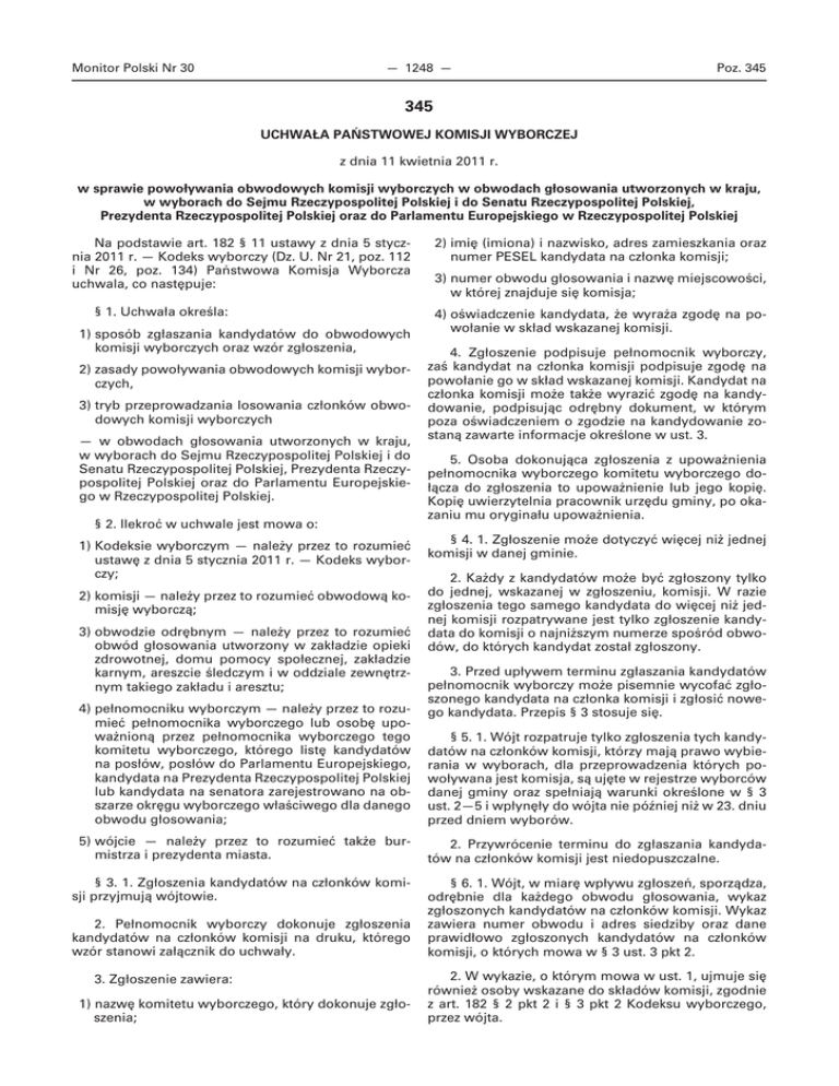 Monitor Polski Nr 30 — 1248 — Poz. 345 345 UCHWAŁA PAŃSTWOWEJ KOMISJI WYBORCZEJ z dnia 11 kwietnia 2011 r. w sprawie powoływania obwodowych komisji wyborczych w obwodach głosowania utworzonych w kraju, w wyborach do Sejmu Rzeczypospolitej Polskiej i do Senatu Rzeczypospolitej Polskiej, Prezydenta Rzeczypospolitej Polskiej oraz do Parlamentu Europejskiego w Rzeczypospolitej Polskiej Na podstawie art. 182 § 11 ustawy z dnia 5 stycznia 2011 r. — Kodeks wyborczy (Dz. U. Nr 21, poz. 112 i Nr 26, poz. 134) Państwowa Komisja Wyborcza uchwala, co następuje: § 1. Uchwała określa: 1) sposób zgłaszania kandydatów do obwodowych komisji wyborczych oraz wzór zgłoszenia, 2) zasady powoływania obwodowych komisji wyborczych, 3) tryb przeprowadzania losowania członków obwodowych komisji wyborczych — w obwodach głosowania utworzonych w kraju, w wyborach do Sejmu Rzeczypospolitej Polskiej i do Senatu Rzeczypospolitej Polskiej, Prezydenta Rzeczypospolitej Polskiej oraz do Parlamentu Europejskiego w Rzeczypospolitej Polskiej. § 2. Ilekroć w uchwale jest mowa o: 1) Kodeksie wyborczym — należy przez to rozumieć ustawę z dnia 5 stycznia 2011 r. — Kodeks wyborczy; 2) komisji — należy przez to rozumieć obwodową komisję wyborczą; 3) obwodzie odrębnym — należy przez to rozumieć obwód głosowania utworzony w zakładzie opieki zdrowotnej, domu pomocy społecznej, zakładzie karnym, areszcie śledczym i w oddziale zewnętrznym takiego zakładu i aresztu; 4) pełnomocniku wyborczym — należy przez to rozumieć pełnomocnika wyborczego lub osobę upoważnioną przez pełnomocnika wyborczego tego komitetu wyborczego, którego listę kandydatów na posłów, posłów do Parlamentu Europejskiego, kandydata na Prezydenta Rzeczypospolitej Polskiej lub kandydata na senatora zarejestrowano na obszarze okręgu wyborczego właściwego dla danego obwodu głosowania; 2) imię (imiona) i nazwisko, adres zamieszkania oraz numer PESEL kandydata na członka komisji; 3) numer obwodu głosowania i nazwę miejscowości, w której znajduje się komisja; 4) oświadczenie kandydata, że wyraża zgodę na powołanie w skład wskazanej komisji. 4. Zgłoszenie podpisuje pełnomocnik wyborczy, zaś kandydat na członka komisji podpisuje zgodę na powołanie go w skład wskazanej komisji. Kandydat na członka komisji może także wyrazić zgodę na kandydowanie, podpisując odrębny dokument, w którym poza oświadczeniem o zgodzie na kandydowanie zostaną zawarte informacje określone w ust. 3. 5. Osoba dokonująca zgłoszenia z upoważnienia pełnomocnika wyborczego komitetu wyborczego dołącza do zgłoszenia to upoważnienie lub jego kopię. Kopię uwierzytelnia pracownik urzędu gminy, po okazaniu mu oryginału upoważnienia. § 4. 1. Zgłoszenie może dotyczyć więcej niż jednej komisji w danej gminie. 2. Każdy z kandydatów może być zgłoszony tylko do jednej, wskazanej w zgłoszeniu, komisji. W razie zgłoszenia tego samego kandydata do więcej niż jednej komisji rozpatrywane jest tylko zgłoszenie kandydata do komisji o najniższym numerze spośród obwodów, do których kandydat został zgłoszony. 3. Przed upływem terminu zgłaszania kandydatów pełnomocnik wyborczy może pisemnie wycofać zgłoszonego kandydata na członka komisji i zgłosić nowego kandydata. Przepis § 3 stosuje się. § 5. 1. Wójt rozpatruje tylko zgłoszenia tych kandydatów na członków komisji, którzy mają prawo wybierania w wyborach, dla przeprowadzenia których powoływana jest komisja, są ujęte w rejestrze wyborców danej gminy oraz spełniają warunki określone w § 3 ust. 2—5 i wpłynęły do wójta nie później niż w 23. dniu przed dniem wyborów. 5) wójcie — należy przez to rozumieć także burmistrza i prezydenta miasta. 2. Przywrócenie terminu do zgłaszania kandydatów na członków komisji jest niedopuszczalne. § 3. 1. Zgłoszenia kandydatów na członków komisji przyjmują wójtowie. § 6. 1. Wójt, w miarę wpływu zgłoszeń, sporządza, odrębnie dla każdego obwodu głosowania, wykaz zgłoszonych kandydatów na członków komisji. Wykaz zawiera numer obwodu i adres siedziby oraz dane prawidłowo zgłoszonych kandydatów na członków komisji, o których mowa w § 3 ust. 3 pkt 2. 2. Pełnomocnik wyborczy dokonuje zgłoszenia kandydatów na członków komisji na druku, którego wzór stanowi załącznik do uchwały. 3. Zgłoszenie zawiera: 1) nazwę komitetu wyborczego, który dokonuje zgłoszenia; 2. W wykazie, o którym mowa w ust. 1, ujmuje się również osoby wskazane do składów komisji, zgodnie z art. 182 § 2 pkt 2 i § 3 pkt 2 Kodeksu wyborczego, przez wójta. Monitor Polski Nr 30 — 1249 — § 7. Jeżeli liczba prawidłowo zgłoszonych kandydatów do składu komisji odpowiada ustawowej liczbie osób, które mogą być powołane w jej skład, komisja jest powoływana w składzie odpowiadającym liczbie zgłoszonych kandydatów. § 8. 1. Jeżeli liczba prawidłowo zgłoszonych kandydatów do składu danej komisji jest większa od ustawowej liczby osób, które mogą być powołane w jej skład, komisja powoływana jest w największym dopuszczalnym składzie, a jej skład ustalany jest w trybie losowania, o którym mowa w art. 182 § 7 Kodeksu wyborczego. 2. Informację o miejscu, dacie i godzinie przeprowadzenia losowania wójt podaje do publicznej wiadomości co najmniej na 2 dni przed dniem losowania, wywieszając stosowne zawiadomienie w swojej siedzibie, w miejscu ogólnodostępnym, oraz umieszczając je w Biuletynie Informacji Publicznej. 3. Losowania członków komisji spośród kandydatów zgłoszonych do danej komisji dokonuje się odrębnie dla każdej komisji. W losowaniu uczestniczy po jednym kandydacie zgłoszonym przez każdego pełnomocnika wyborczego do danej komisji. 4. Losowanie przeprowadza się w ten sposób, że nazwiska kandydatów uczestniczących w losowaniu oznacza się numerami, informując o tym obecnych przy losowaniu. Do jednakowych, 