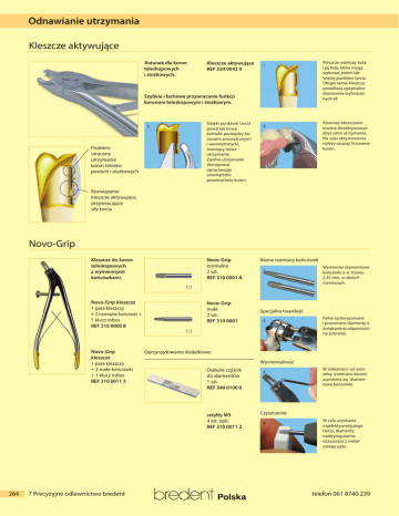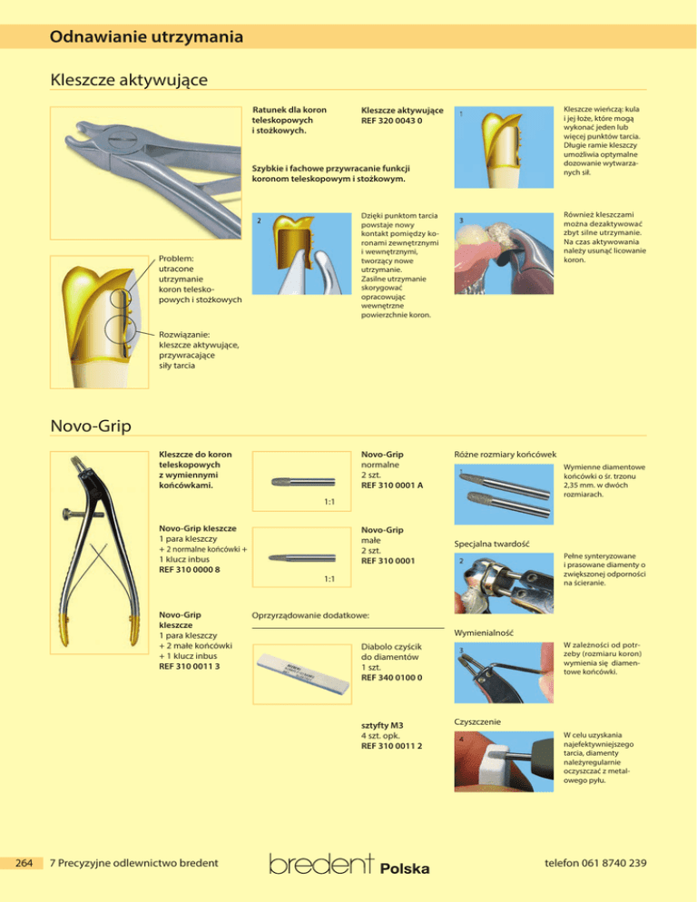 Odnawianie utrzymania Kleszcze aktywujące Ratunek dla koron teleskopowych i stożkowych. Kleszcze aktywujące REF 320 0043 0 Kleszcze wieńczą: kula i jej łoże, które mogą wykonać jeden lub więcej punktów tarcia. Długie ramie kleszczy umożliwia optymalne dozowanie wytwarzanych sił. 1 Szybkie i fachowe przywracanie funkcji koronom teleskopowym i stożkowym. Dzięki punktom tarcia powstaje nowy kontakt pomiędzy koronami zewnętrznymi i wewnętrznymi, tworzący nowe utrzymanie. Zasilne utrzymanie skorygować opracowując wewnętrzne powierzchnie koron. 2 Problem: utracone utrzymanie koron teleskopowych i stożkowych Również kleszczami można dezaktywować zbyt silne utrzymanie. Na czas aktywowania należy usunąć licowanie koron. 3 Rozwiązanie: kleszcze aktywujące, przywracające siły tarcia Novo-Grip Kleszcze do koron teleskopowych z wymiennymi końcówkami. Novo-Grip normalne 2 szt. REF 310 0001 A Różne rozmiary końcówek 1 1:1 Novo-Grip kleszcze 1 para kleszczy + 2 normalne końcówki + 1 klucz inbus REF 310 0000 8 Novo-Grip kleszcze 1 para kleszczy + 2 małe końcówki + 1 klucz inbus REF 310 0011 3 Novo-Grip małe 2 szt. REF 310 0001 7 Precyzyjne odlewnictwo bredent Specjalna twardość 2 1:1 Pełne synteryzowane i prasowane diamenty o zwiększonej odporności na ścieranie. Oprzyrządowanie dodatkowe: Wymienialność Diabolo czyścik do diamentów 1 szt. REF 340 0100 0 sztyfty M3 4 szt. opk. REF 310 0011 2 264 Wymienne diamentowe końcówki o śr. trzonu 2,35 mm. w dwóch rozmiarach. 3 W zależności od potrzeby (rozmiaru koron) wymienia się diamentowe końcówki. Czyszczenie 4 W celu uzyskania najefektywniejszego tarcia, diamenty należyregularnie oczyszczać z metalowego pyłu. telefon 061 8740 239 Odnawianie utrzymania FGP - dopasowane utrzymanie Wysokiej jakości, trwałe, indywidualne, powierzchniowe utrzymanie koron teleskopowych i stożkowych. System indywidualnego dopasowania utrzymania daje lekarzom i technikom całkowicie nowe możliwości w wykonywaniu i naprawianiu utrzymania koron teleskopowych i stożkowych. Długa żywotność i nieskomplikowane wykonanie utrzymania czynią z tego systemu komfortowe i funkcjonalne rozwiązanie dla techników, lekarzy i pacjentów. Zastosowanie systemu FGP Pewność i najwyższa jakość 1 2 kotwiczenia: Dzięki systemowi FGP można odnowić utracone utrzymanie w koronach, w czasie jednej wizyty, bezpośrednio w gabinecie stomatologicznym, bez konieczności wysyłania pracy do laboratorium. System FGP firmy bredent daje właściwej jakości utrzymanie (siły tarcia dwóch powierzchni) przy wykonywaniu koron teleskopowych i stożkowych. Indywidualność i precyzja: 3 Konkretne rozwiązanie szybkość i skuteczność: 4 W trudnych sytuacjach tworzywo może służyć do uszczelnień i podścieleń frezowań. Żadnych kompromisów: Przy wykonywaniu indywidualnych zasuw, oraz odnawianiu utrzymania w starszych pracach, z tworzywa wykonuje się indywidualne, dopasowane i szczelne matryce zamków. 25 lat doświadczeń z systemem FGP Zalety systemu: oszczędność czasu, dzięki fachowemu, szybkiemu wykonaniu niskie koszty związane z wykonaniem pojedyńczej pracy wyeliminowanie pracochłonnego dopasowywania koron wieloletnia sprawność utrzymania protezy Te zalety sprawdzono już u ok. 100 000 pacjentów. Zalety systemu FGP to również wyeliminowanie skurczu i naprężeń odlewów w technice koron teleskopowych i stożkowych, łączonych z protezami szkieletowymi. Utrzymanie przy pomocy systemu FGP zapewnia wielokrotnie dłuższą żywotność i skuteczność protezowania niż w przypadku utrzymania metal - metal. wysoki komfort i funkcjonalność dla pacjenta niskie koszty kombinowanej pracy protetycznej możliwość pracy w środowisku jamy ustnej niezużywające się utrzymanie odporne na osadzanie się płytki nazębnej faks 061 8740 256 7 Precyzyjne odlewnictwo bredent 265 Odnawianie utrzymania FGP - dopasowane utrzymanie Wykonywanie nowych prac z FGP 1 4 7 10 13 Jako blokady przestrzeni dla FGP używa się czapeczek woskowych lub foliowych, Modelowanie koron zewnętrznych wraz z woskową protezą szkieletową. Dzięki zachowaniu przestrzeni pozostaje miejsce na wprowadzenie tworzywa FGP. Po ok. 5 min. suszenia, wyschnięty płyn tworzy cienką warstwę łączącą. Równomiernym naciskiem należy nałożyć pracę na korony wewnętrzne i model. o grubości ścianek ok. 0,2 mm, które się kończą 1 mm powyżej lini szyjki. 2 Odlew szkieletu z jednego stopu metalu. 5 Model gipsowy należy zaizolować specjalnym izolatorem FGP. 8 Tworzywo FGP komponenty A i B miesza się w proporcji 1:1. 11 Spolimeryzowane tworzywo FGP z wyraźnie widoczną szczelnością brzegu przyszyjkowego. 14 Powielony model z masy osłaniającej z zachowanymi przestrzeniami dla tworzywa. 3 Wykończoną protezę szkieletową należy zaakrylować a korony wylicować. 6 Płynem do połączeń maluje się wypiaskowane i oczyszczone wnętrza koron. 9 Wymieszane tworzywo wprowadza się w korony, bez tworzenia blaz i pęcherzy. 12 FGP - system łączy indywidualne, funkcjonalne utrzymanie, z wysokim komfortem użytkowania. 15 Dla lepszego utrzymania Elektroniczne testy porównawcze wyraźnie udowadniają przewagę utrzymania systemem FGP nad tradycyjnym utrzymaniem metal - metal. Tradycyjne utrzymanie metal/metal. Utrzymanie metal/metal z siłą 8 Newton`ów. Utrzymanie FGP tworzywo/metal. Utrzymanie FGP tworzywo/metal z siłą 8 Newton`ów. Z tymi dwoma utrzymaniami została wykonana symulacja zdejmowania i zakładania protezy 21.000 razy, co odpowiada jej ok. 20 letniemu użytkowaniu przez pacjenta. Kontrola pod mikroskopem elektronowym wewnętrzna powierzchnia korony ze stopu złota, w 100 krotnym powiększeniu. Kontrola pod mikroskopem elektronowym wewnętrzna powierzchnia korony z FGP, w 100 krotnym powiększeniu. Wynik: 266 7 Precyzyjne odlewnictwo bredent utrzymanie resztkowe 2 Newton`ów, czyli jeszcze 25 %. Wynik: utrzymanie resztkowe 6 Newt