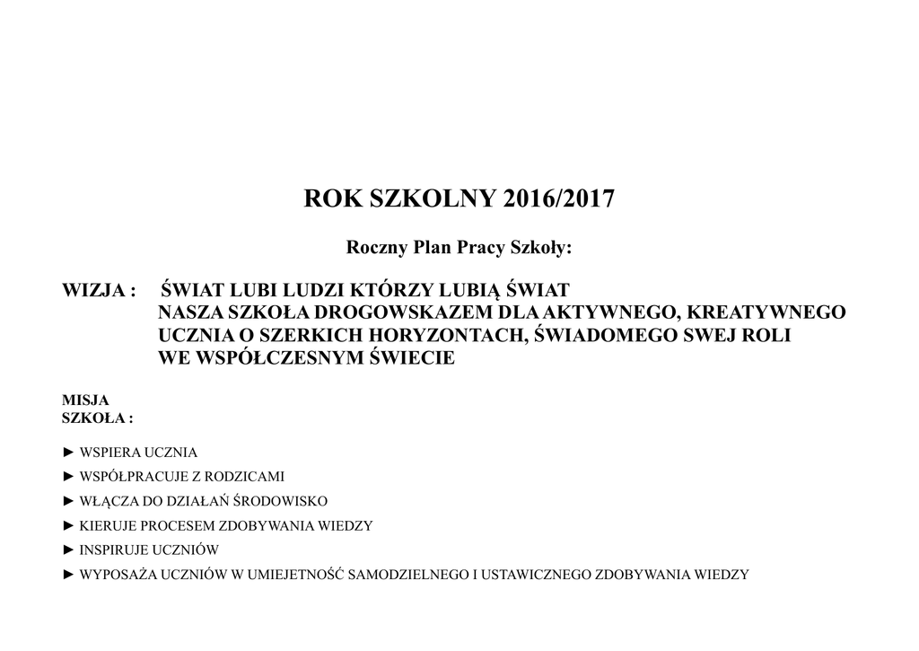 ROK SZKOLNY 2016/2017 Roczny Plan Pracy Szkoły: WIZJA : ŚWIAT LUBI LUDZI KTÓRZY LUBIĄ ŚWIAT NASZA SZKOŁA DROGOWSKAZEM DLA AKTYWNEGO, KREATYWNEGO UCZNIA O SZERKICH HORYZONTACH, ŚWIADOMEGO SWEJ ROLI WE WSPÓŁCZESNYM ŚWIECIE MISJA SZKOŁA : ► WSPIERA UCZNIA ► WSPÓŁPRACUJE Z RODZICAMI ► WŁĄCZA DO DZIAŁAŃ ŚRODOWISKO ► KIERUJE PROCESEM ZDOBYWANIA WIEDZY ► INSPIRUJE UCZNIÓW ► WYPOSAŻA UCZNIÓW W UMIEJETNOŚĆ SAMODZIELNEGO I USTAWICZNEGO ZDOBYWANIA WIEDZY I. Zarządzanie i organizacja. Lp. ZADANIA ODPOWIEDZIALNI TERMIN 1 Przydział obowiązków służbowych. Dyrektor Sierpień/Wrzesień 2 Analiza dokumentacji osobowej nauczycieli pod kątem zgodności przyznanych obowiązków i posiadanego wykształcenia. Dyrektor Sierpień/Wrzesień 3 Opracowanie tygodniowego planu zajęć dydaktycznowychowawczych. Przygotowanie planu dyżurów nauczycieli. Dyrektor M. Mrożek K.Chuda Sierpień/Wrzesień 4 Opracowanie rocznego planu pracy szkoły. Dyrektor Nauczyciele kl.IV-VI sierpień/wrzesień 5 Opracowanie Kalendarza szkoły 2015/16 Nauczyciele kl. I-III 14 września 6 Zmiany w Statucie szkoły, WSO i pso zgodnie z zmianami Zespoły nauczycielskie w u.o.s.o., rozporządzeniami MEN z dnia 10.06.2015, 25.06.2015 14 września 7 REALIZACJA WNIOSKÓW Wdrożenie do realizacji wniosków wynikających z ewaluacji wewnętrznej poprzez włączenie ich w plany pracy;(opracowane wnioski znajdują się w raportach ) Wrzesień Cały rok Wdrożenie do realizacji wniosków z nadzoru pedagogicznego; 1.Z powodu braku godzin na koła zainteresowań realizacja tych zajęć i zespołów wyrównawczych odbędzie się zgodnie z art.42 i dyrektor przydziela nauczycielowi z tego artykułu 1 godzinę tygodniowo. 2. Szkoła zgłosi swoje działania do wybranego programu MEN 3. Dyrektor powoła zespół innowacji pedagogicznych i działań nowatorskich w szkole. Nauczyciele UWAGI 4. Zespół statutowy i WSO przeprowadza ewaluację dokumentów i opracowuje zmiany zgodne z aktualnymi przepisami prawa. 5. Zobowiązuję nauczycieli do większego wykorzystania na lekcjach TIK, tablic interaktywnych oraz do pracy z epodrecznikiem 8 Opracowanie planów -rady pedagogicznej - samorządu uczniowskiego, -zajęć dodatkowych -zajęć korekcyno- kompensacyjnych - pracy wychowawcy klasy, - teczek wychowawców, - pedagoga, - świetlicy, - logopedy, - współpracy z rodzicami, - biblioteki, - dostosowanie planów dydaktycznych do pracy szkoły w tym zaplanowanie działań ukierunkowanych na wzrost efektów kształcenia Wychowawcy klas nauczyciele przedmiotów Pedagog szkolny Nauczyciele świetlicy Logopeda Nauczyciel biblioteki 24 września 9 Organizacja pracy zespołów -opracowanie harmonogramu spotkań na rok szkolny -uwzględnienie w tematyce spotkań wniosków z ewaluacji, nadzoru, wewnętrznego pomiaru dydaktycznego, analizy sprawdzianu zespoły: pomocy psych. ped. zespołu ds. ewaluacji, zespołów wychowawczo dydaktycznych/kl.0-III, IV-VI/ do zmian w Statucie szkoły, do spraw BHP, do zmian wso - opracowanie raportu ze sprawdzianu analiza wyników , wnioski o pracy z uczniami Dyrektor zespół klas 0-III przewodniczący zespołów Nauczyciele 4 września bhp Organizacja i zagospodarowanie sal lekcyjnych( w tym Według przydziału na radzie 10 14 września wso, statut 14 września cały rok wg wykazu składu zespołów 9 września wygospodarowanie miejsc na pozostawianie w szkole podręczników i przyborów szkolnych) sali gimnastycznej, świetlicy, biblioteki Organizacja i zagospodarowanie pomieszczeń : biblioteki, gabinet pedagoga, logopedy, pomieszczenie świetlicowe pedagogicznej sale -wychowawcy klas sala 0- K. Kuc sala 2- K.Chuda/T. Kasprzak sala 3- K. Springer/ L. Prell sala 4 Z.Lewandowska sala 5 M.Mrożek /T. Kasprzak sala 6 IV a D.Chuda sala 10 góra IV b M.Mrożek sala 14 R.Chełma świetlica góra L.Prell, A. Kamińska świetlica 2 H.Piotrowska, J.Gawlak biblioteka R.Chełma logopedia K.Springer A.Kamińska E.Woźniak sala gimn. J. Gawlak cały rok 11 Kontrolowanie realizacji obowiązku szkolnego przez Dyrektor dzieci z rejonu naszej szkoły. wychowawcy ( uaktualnić adresy zamieszkania i zameldowania uczniów Pedagog szkolny , oraz adres szkoły obwodowej) Do 4 września Cały rok 12 Sporządzenie planu nadzoru pedagogicznego i przedstawienie go radzie pedagogicznej do 15 września 2014 Dyrektor 14.09.2016 13 Realizacja zadań z zakresu Rozporządzenia MEN w sprawie nadzoru pedagogicznego z 7 października 2009 roku, oraz z dnia 10 maja 2013 r. rozp. MEN z dnia 6 sierpnia 2015 w sprawie wymagań wobec szkół i placówek Opracowanie harmonogramu działań. Dyrektor Zespół ds. Ewaluacji L. Prell K. Kuc E. Górska Wrzesień II. Dział pracy dydaktycznej. Lp. 1 2 ZADANIA ODPOWIEDZIALNI TERMIN Stworzenie uczniom możliwości poszerzania wiedzy, rozwijania umiejętności oraz wspomagania ich w indywidualnym rozwoju poprzez: a) udział w konkursach przedmiotowych i zawodach sportowych ( na szczeblu szkolnym, gminnym, wojewódzkim , ogólnopolskim); b) uczestnictwo w uroczystościach, apelach szkolnych i pozaszkolnych (wg harmonogramu); c) organizowanie spotkań z ciekawymi ludźmi d) wyjazdy i wycieczki edukacyjne e) lekcje poza szkołą (muzealne, w terenie itp.) Nauczyciele przedmiotów Cały rok Opracowanie planów pracy zajęć dydaktycznowyrównawczych, zajęć logopedycznych i zajęć korekcyjno-kompensacyjnych, rewalidacji Prowadzący nauczyciele 24 września Opracowanie planów pracy kół zainteresowań z uwzględnieniem działań ukierunkowanych na wszechstronny rozwój dziecka. Prowadzący koła nauczyciele 24 wrzesień Wszyscy nauczyciele wychowawcy 4 Zaplanowanie działań zwiększających aktywność uczniów Wszyscy nauczyciele w realizacji zadań dydaktycznych( projekty, wystawy prac, gazetka szkolna, audycje radiowe). Cały rok 6 Wstępne diagnozowanie uczniów w oddziale przedszkolnym a) test „na wejściu” w kl. I Wrzesień 7 K.Kuc R. Chełma Przeprowadzanie wewnętrznego pomiaru d