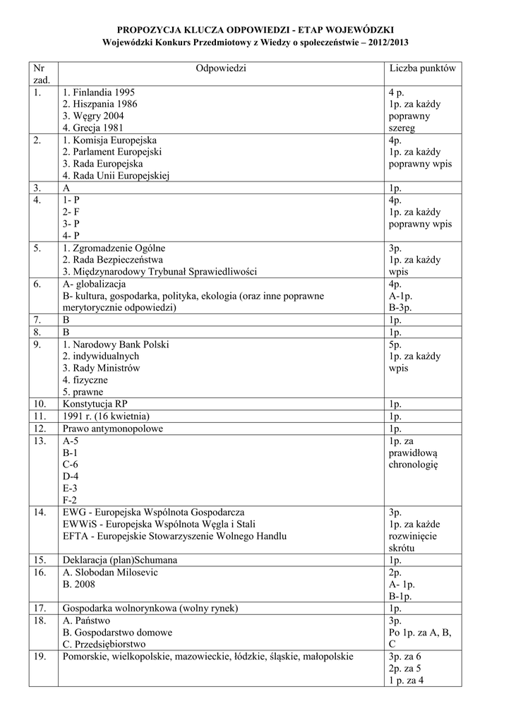 PROPOZYCJA KLUCZA ODPOWIEDZI - ETAP WOJEWÓDZKI Wojewódzki Konkurs Przedmiotowy z Wiedzy o społeczeństwie – 2012/2013 Nr zad. 1. 2. 3. 4. 5. 6. 7. 8. 9. 10. 11. 12. 13. 14. Odpowiedzi 1. Finlandia 1995 2. Hiszpania 1986 3. Węgry 2004 4. Grecja 1981 1. Komisja Europejska 2. Parlament Europejski 3. Rada Europejska 4. Rada Unii Europejskiej A 1- P 2- F 3- P 4- P 1. Zgromadzenie Ogólne 2. Rada Bezpieczeństwa 3. Międzynarodowy Trybunał Sprawiedliwości A- globalizacja B- kultura, gospodarka, polityka, ekologia (oraz inne poprawne merytorycznie odpowiedzi) B B 1. Narodowy Bank Polski 2. indywidualnych 3. Rady Ministrów 4. fizyczne 5. prawne Konstytucja RP 1991 r. (16 kwietnia) Prawo antymonopolowe A-5 B-1 C-6 D-4 E-3 F-2 EWG - Europejska Wspólnota Gospodarcza EWWiS - Europejska Wspólnota Węgla i Stali EFTA - Europejskie Stowarzyszenie Wolnego Handlu 15. 16. Deklaracja (plan)Schumana A. Slobodan Milosevic B. 2008 17. 18. Gospodarka wolnorynkowa (wolny rynek) A. Państwo B. Gospodarstwo domowe C. Przedsiębiorstwo Pomorskie, wielkopolskie, mazowieckie, łódzkie, śląskie, małopolskie 19. Liczba punktów 4 p. 1p. za każdy poprawny szereg 4p. 1p. za każdy poprawny wpis 1p. 4p. 1p. za każdy poprawny wpis 3p. 1p. za każdy wpis 4p. A-1p. B-3p. 1p. 1p. 5p. 1p. za każdy wpis 1p. 1p. 1p. 1p. za prawidłową chronologię 3p. 1p. za każde rozwinięcie skrótu 1p. 2p. A- 1p. B-1p. 1p. 3p. Po 1p. za A, B, C 3p. za 6 2p. za 5 1 p. za 4 20. 21. 22. 23. 24. Razem Rodzaje pieniądza: pełnowartościowy, papierowy (banknoty) i metalowy (monety), bezgotówkowy (czeki), plastikowy (karty płatnicze i kredytowe), elektroniczny D, E, F inflacja A- 1979-1989 B- trwała wolność C- Hamid Karzaj D- 4 A- podaż B- popyt C- budżet państwowy 5p. 1p. za każde wymienienie 3p. 1p. za każe poprawne wskazanie 1p. 4p. Po 1p. za A, B, C, D 3p. Po 1p. za A,B,C 60 p.