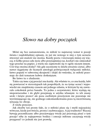 Słowo na dobry początek Mówi się bez zastanowienia, że miłość to najstarszy temat w poezji świata i najdokładniej opisany, że już nic nowego w niej o tym uczuciu stworzyć ani znaleźć nie można. Każdy poeta i wierszopis mniej czy więcej, w kółko przez całe życie albo przynajmniej raz, kochał i nie omieszkał tego przelać na papier, a wielu nie zajmowało się w ogóle niczym innym. Cóż więc można dodać? Ale gdy zaczniemy te dzieła uważnie czytać, albo nawet sięgniemy do licznych antologii poświęconych wyłącznie miłości, łatwo popaść w odwrotną skrajność i dojść do wniosku, że miłość pozostaje do dziś tematem ledwie dotkniętym. Bo łatwo tu o złudzenie. Takie czy inne z jej przeżyć zna każdy. Ale właśnie to, co zna każdy, lubi się powtarzać w stereotypach tak pospolitych, że na tysiąc uczuć i wypowiedzi nie znajdziemy czasem ani jednego zdania, w którym by się zawierało cokolwiek prócz banału. To jedna z oczywistości, które wydają się niepowtarzalne i do głębi przejmują w użytku własnym: to ich znany urok i święte prawo! ale poza osobistym przeżyciem nie pozostaje nic wyróżniającego się, nic godnego zakomunikowania poza tą niezrównaną sytuacją we dwoje. Z wielu przyczyn. Jak choćby ten prosty fakt, że o miłości pisze się i myśli najczęściej wówczas, kiedy jest świeża, prosta i zachwycająca. A jej trudności? Raczej bywają przemilczane albo przeżywający wtedy już przestają pisać o tym poezje! niby że najtypowsze bodźce i emocje miłosne zaczynają wtedy przygasać! co jednak nie jest prawdą. 5 Tak samo rzadziej pojawiają się jako temat mniej typowe rodzaje uczuć miłosnych, a mam tu na myśli nie tylko teksty czy podteksty nie tak częste, jak odcienie np. biseksualne, agresywne, sytuacje i układy niejednoznaczne w społecznym lub indywidualnym odbiorze czy w jakiś inny sposób nie całkiem powszechnie akceptowane. Również i przejawy humoru, dystansu, ironii mogą się tu wydawać nie na miejscu. My jednak nie zamierzamy spłycać w taki sposób olbrzymiego i jakże różnorodnego fenomenu, jakim jest miłość, erotyka, płeć i seks oraz cały ogrom zjawisk, jakie im towarzyszą. Więc także i poniektóre z bardziej prowokacyjnych form wyrazu, zbyt łatwo wyrzucane poza nawias choćby pod pretekstem jakoby ekshibicjonizmu czy pornografii. Oczywiście takie przejawy erotyki muszą stanowić mniejszość i nie zamierzam tu naruszać tych bądź co bądź słusznych proporcji. Co jednak nie znaczy, abyśmy bez zakłamania mogli je całkowicie pomijać udając, że nie istnieją. Tak samo jak rozmaite wynaturzone przejawy płci, chociażby jej fałsz, hipokryzja, sprzedajność i najrozmaitsze formy brutalności. Czy społeczne i obyczajowe, czy po prostu indywidualne. Absurdem byłoby udawanie, że one nie istnieją w tym nadzwyczaj urozmaiconym obrazie. Twórcy też nie mają w tych kwestiach złudzeń. Trzeba więc i te aspekty uwzględnić w tym, co poezja ma o nich do powiedzenia. Nie popadając w obłudę. Nie stwarzając pozorów naiwności. Co najwyżej ograniczając liczbę tych bezlitosnych i często nieprzyjemnych, ambiwalentnych utworów do paru sekwencji, zajmujących tu i tak bez porównania mniej miejsca niż ich rzeczywiste proporcje w ludzkim życiu. To też jeden z powodów, dla których w podtytule tej antologii pojawia się wyraz: kontrowersyjna. Często bowiem wydaje się, że nie po to jest miłość, ażeby o niej opowiadać. Że nie wymaga też analiz i dociekań, aby istniała. I zaczyna się fałszywy pozór, jakoby nie istniała w niej tak olbrzymia różnorodność: jedna z jej podstawowych wartości. Komu zaś przydaje się do jej ozdobienia wiersz miłosny, ten i w poezji erotycznej na ogół nie szuka zwykle niczego poza tym, co i tak wie. Co najogólniej pasuje do ciepłego lub gorącego nastroju, który jego albo ją właśnie ogarnął. Co da się wręczyć jak kwiatuszek i pomoże się tkliwie a piękniej wyjęzyczyć. Tylko takie wymagania stawiali na ogół sobie i swym utworom zakochani poeci i tylko tego się spodziewa najczęściej odbiorca jednej czy drugiej płci. A może i trzeciej lub obu naraz? 6 W takim tylko znaczeniu można słusznie powiedzieć, że świat jest pełen poezji miłosnej. Kiedy postawimy jej większe wymagania, okaże się, że godna uwagi, nie zdawkowa i niebanalna erotyka jest w poezji czymś niesłychanie rzadkim. Zwłaszcza w poezji! Bo w życiu niektórzy jednak potrafią z niej uczynić coś więcej i z miłości swej wydobyć rzeczy niezwykłe; ale to się zachowuje dla siebie. Poeta zaś, kiedy zaczyna kształtować myśli i słowa w sposób właściwy jego niecodziennemu zajęciu, jest już pochłonięty zwykle czymś innym niż bezpośredniość tych doznań bardzo intymnych; i nawet jeśli te przeżycia pozostają bodźcem podskórnie obecnym, ich przetworzenie i splecenie z mnóstwem innych spraw odbywa się tak lawinowo i błyskawicznie, że o krok od miejsca, gdzie kończy się namiętny banał, zaczynają się już rejony, w których erotyki jako takiej trudno się już doszukać. Przynajmniej nie każdemu. Taka wydaje się być ogólna tendencja. Na szczęście nie brak od tej reguły wyjątków. A komplikuje te uczucia i rozumienie ich, ale także wzbogaca je, prosty lecz nie zawsze uświadamiany fakt, że miłość i erotyka to sprawa nie tak jednoznaczna, jak niektórym by się zdawało. Przecież wystarcza przekroczyć nie zawsze uświadamiane granice krajów, narodowości, kultur, obyczajów, a nawet środowiska społecznego, by zaczęły narastać różnice. Często wcale nie błahe. Przecież i to bywa jednym z powodów, dla których mieszane związki równie często utrudniają miłość i wszystkie jej sprawy, jak czynią je czymś rozmaitym, ciekawszym i tym bogatszym. Wbrew pozorom bardzo różna i przez to urozmaicona bywa miłość na pograniczach: polska i niemiecka? francuska? polska