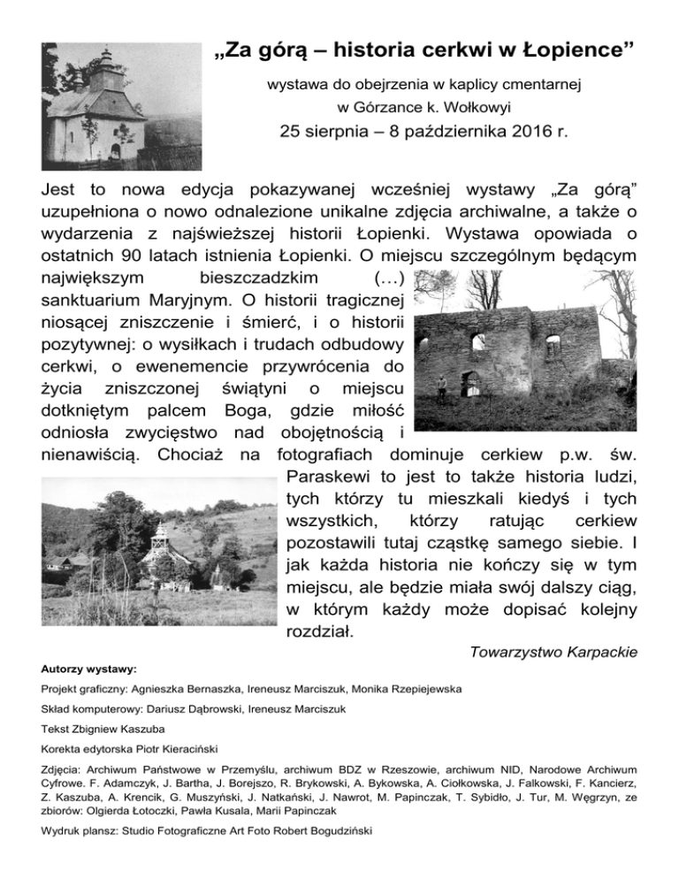 „Za górą – historia cerkwi w Łopience” wystawa do obejrzenia w kaplicy cmentarnej w Górzance k. Wołkowyi 25 sierpnia – 8 października 2016 r. Jest to nowa edycja pokazywanej wcześniej wystawy „Za górą” uzupełniona o nowo odnalezione unikalne zdjęcia archiwalne, a także o wydarzenia z najświeższej historii Łopienki. Wystawa opowiada o ostatnich 90 latach istnienia Łopienki. O miejscu szczególnym będącym największym bieszczadzkim (…) sanktuarium Maryjnym. O historii tragicznej niosącej zniszczenie i śmierć, i o historii pozytywnej: o wysiłkach i trudach odbudowy cerkwi, o ewenemencie przywrócenia do życia zniszczonej świątyni o miejscu dotkniętym palcem Boga, gdzie miłość odniosła zwycięstwo nad obojętnością i nienawiścią. Chociaż na fotografiach dominuje cerkiew p.w. św. Paraskewi to jest to także historia ludzi, tych którzy tu mieszkali kiedyś i tych wszystkich, którzy ratując cerkiew pozostawili tutaj cząstkę samego siebie. I jak każda historia nie kończy się w tym miejscu, ale będzie miała swój dalszy ciąg, w którym każdy może dopisać kolejny rozdział. Towarzystwo Karpackie Autorzy wystawy: Projekt graficzny: Agnieszka Bernaszka, Ireneusz Marciszuk, Monika Rzepiejewska Skład komputerowy: Dariusz Dąbrowski, Ireneusz Marciszuk Tekst Zbigniew Kaszuba Korekta edytorska Piotr Kieraciński Zdjęcia: Archiwum Państwowe w Przemyślu, archiwum BDZ w Rzeszowie, archiwum NID, Narodowe Archiwum Cyfrowe. F. Adamczyk, J. Bartha, J. Borejszo, R. Brykowski, A. Bykowska, A. Ciołkowska, J. Falkowski, F. Kancierz, Z. Kaszuba, A. Krencik, G. Muszyński, J. Natkański, J. Nawrot, M. Papinczak, T. Sybidło, J. Tur, M. Węgrzyn, ze zbiorów: Olgierda Łotoczki, Pawła Kusala, Marii Papinczak Wydruk plansz: Studio Fotograficzne Art Foto Robert Bogudziński