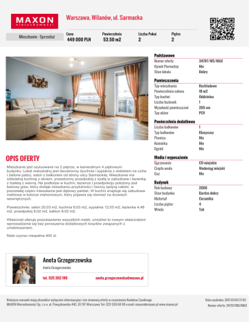 Warszawa, Wilanów, ul. Sarmacka Mieszkanie - Sprzedaż Cena 449 000 PLN Powierzchnia 53.50 m2 Liczba Pokoi 2 Piętro 2 Podstawowe Numer oferty 34797/MS/MAX Rynek Pierwotny Nie Stan lokalu Dobry Pomieszczenia Typ mieszkania Rozkładowe Powierzchnia salonu 18 m2 Typ kuchni Oddzielna Liczba łazienek 1 Wysokość pomieszczeń 265 cm Typ okien PCV Powierzchnia dodatkowa Liczba balkonów 1 Typ balkonów Klasyczny Piwnica Nie Komórka Nie Ogród Nie OPIS OFERTY Media i wyposażenie Mieszkanie jest usytuowane na 2 piętrze, w kameralnym 4 piętrowym budynku. Lokal mieszkalny jest dwustronny (kuchnia i sypialnia z widokiem na ciche i zielone patio), salon z balkonem od strony ulicy Sarmackiej. Mieszkanie ma oddzielną kuchnię z oknem, przestronny przedpokój z szafą w zabudowie i łazienkę z toaletą z wanną. Na podłodze w kuchni, łazience i przedpokoju położony jest beżowy gres, który dodaje mieszkaniu przytulności i tworzy spójną całość, w pozostałej części mieszkania jest dębowy parkiet. W kuchni znajduje się zabudowa meblowa w kolorze mahoniowym, który pojawia się również na drzwiach wewnętrznych. Ogrzewanie CO miejskie Ciepła woda Wodociąg miejski Gaz Nie Powierzchnie: salon 20,03 m2, kuchnia 9,03 m2, sypialnia 12,03 m2, łazienka 4,48 m2, przedpokój 8,02 m2, balkon 8,02 m2. Budynek Rok budowy 2006 Stan budynku Bardzo dobry Materiał Ceramika Liczba pięter 4 Winda Tak Właściciel oferuje pozostawienie wszystkich mebli, umożliwi to nowym właścicielom wprowadzenie się bez ponoszenia dodatkowych kosztów związanych z umeblowaniem. Niski czynsz niespełna 400 zł. Aneta Grzegorzewska Aneta Grzegorzewska tel. 525 262 190 [email protected] Niniejsze warunki mają charakter wyłącznie informacyjny i nie stanowią oferty w rozumieniu Kodeksu Cywilnego. MAXON Nieruchomości Sp. z o o. ul. Powązkowska 44C, 01-797 Warszawa Tel: (22) 530 60 00 e-mail: [email protected] www.maxon.pl Data wydruku: 2017-03-03 17:43 Numer oferty: 34797/MS/MAX