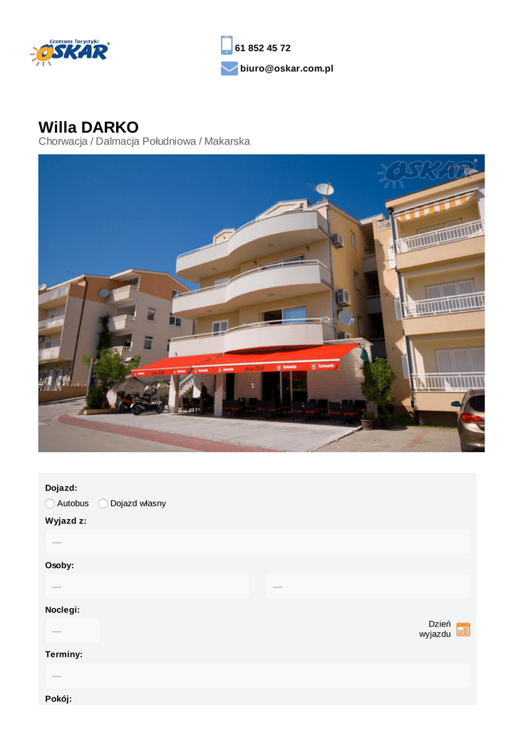 61 852 45 72 [email protected] Willa DARKO Chorwacja / Dalmacja Południowa / Makarska Dojazd: Autobus Dojazd własny Wyjazd z: Osoby: Noclegi: Dzień wyjazdu Terminy: Pokój: Wyżywienie: Najtańsza oferta Styczniowe Rabaty zniżka 20% cena katalogowa do 6 marca 2017: 1444,00 zł do 6 marca 2017: 433,20 zł do 3 kwietnia 2017: 0,00 zł do 3 kwietnia 2017: 1010,80 zł Suma: 1444,00 zł Suma: 1444,00 zł Opis oferty Miejscowość Atuty Wycieczki bliskość plaży fakultatywne aneks kuchenny w każdym studio balkony z widokiem na morze lub góry Opinie atmosfera, sprzyjająca integracji! doskonała Położenie Willa znajduje się w dzielnicy Zelenka, w odległości 600 m od morza. Na dole budynku znajduje się nowocześnie urządzony cafe-bar OSCAR wyposażony w TV, rzutnik, maszyny do gier, który jest doskonałym miejscem do spotkań oraz wieczornych integracji. Zakwaterowanie Studia dwu i trzyosobowe z łazienkami składające się z pokoju połączonego z aneksem kuchennym. Wszystkie studia posiadają balkon lub taras, część z nich jest z widokiem na morze lub na morze i góry. Dostępne opcje zakwaterowania studio 2 osobowe studio 3 osobowe dokwaterowanie (brak możliwości) / studio 1 osobowe (dopłata) Dostępne opcje wyżywienia we własnym zakresie śniadania obiadokolacje śniadania i obiadokolacje Pakiet KOMFORT gwarancja wyboru miejsca w autokarze napoje w autokarze w cenie (6 x do wyboru: kawa, herbata, zimny napój 0,2l) cena: 50 zł/os Pakiet PRESTIGE gwarancja wyboru miejsca w autokarze napoje w autokarze w cenie (6 x do wyboru: kawa, herbata, zimny napój 0,2l) pierwszeństwo wejścia na pokład autokaru nadbagaż 5 kg w cenie suchy prowiant na drogę powrotną cena: 100 zł/os Opieka / Animacje dla dzieci Opieka nad dzieckiem połączona z animacją czasu wolnego prowadzona przez osobę posiadającą odpowiednie kwalifikacje oraz uprawnienia. Możliwość wykupienia na miejscu u rezydenta pakietów opieki / animacji dla dzieci wg wybranej opcji dla dzieci w wieku od 3 do 12 lat: - 3 dniowy pakiet dzienny w cenie 20 euro; zajęcia to plażowanie oraz gry zespołowe (siatkówka plażowa, piłka nożna plażowa, podchody itd.); obowiązuje w godz. 10:00 - 17:00; deklaracja u rezydenta na miejscu i rezerwacja 3 wybranych dni, którymi ma być objęty pakiet opiekuńczo/animacyjny - 1 dniowy pakiet wieczorny w cenie 15 euro; zajęcia dostosowywane do wieku i liczby osób; obowiązuje w godz. 20-00 - 24-00; deklaracja u rezydenta na miejscu i rezerwacja wybranego dnia oferta obowiązuje w miesiącach lipiec i sierpień Warunki promocji FIRST MINUTE www.oskar.com.pl/zalaczniki/warunki_promocji Karta Dużej Rodziny www.oskar.com.pl/zalaczniki/karta_duzej_rodziny Ubezpieczenie Warunki ubezpieczenia Bezpieczne Podróże Signal Iduna dokument do pobrania www.oskar.com.pl/zalaczniki/owu Warunki ubezpieczenia Kosztów Imprezy Turystycznej Signal Iduna dokument do pobrania www.oskar.com.pl/zalaczniki/owurg Turystyczny Fundusz Gwarancyjny W związku z powołaniem do życia w dniu 26.11.2016 Turystycznego Funduszu Gwarancyjnego każdy klient Biura Podróży Oskar zobowiązany jest do zapłaty kwoty w wysokości 10zł/os. przy każdorazowej rezerwacji imprezy turystycznej (obowiązuje od dnia 26.11.2016). Kwota przeznaczona na Turystyczny Fundusz Gwarancyjny zostanie automatycznie doliczona do wartości rezerwacji (w momencie jej dokonania). Wyjątkiem są imprezy turystyczne odbywające się w krajach posiadających granicę z Rzeczpospolitą Polską. Składka nie jest przychodem biura. Udogodnienia Widok na morze Animacje dla dzieci Regulowane fotele Tacki Nowoczesna flota Zawodowy kierowca Pasy bezpieczeństwa Toaleta w autokarze Podnóżki Dla rodzin z dziećmi Wi-Fi Lodówka AGD RTV Bez paszportu Spokojna okolica Region nadmorski Program ramowy Dzień 1 Wyjazd z Polski zgodnie z rozkładem jazdy autokarów. Przejazd przez Czechy, Słowację, Węgry. Dzień 2 Przyjazd do Makarskiej w godzinach przedpołudniowych. Czas wolny. Zakwaterowanie od godz. 12:00. Dzień 3-10 Pobyt na miejscu. Możliwość korzystania z dodatkowych wycieczek fakultatywnych, np. Dubrownik, Split i Trogir, Park Narodowy Krka, Jeziora Plitvickie, Medugorije + Mostar, Rejs statkiem na Hvar i Brac - Fish Picnic, Park Przyrody Biokovo. Dzień 11 Wykwaterowanie do godziny 09:00. Czas wolny. Wyjazd do Polski w godzinach popołudniowych (ok. godz. 15:00). Przejazd przez Węgry, Słowację, Czechy. Dzień 12 Przyjazd do Polski. Orientacyjne godziny powrotu do poszczególnych miast zgodnie z rozkładem jazdy autokarów. Cena obejmuje przejazd autokarem klasy LUX (klimatyzacja, cafe - bar, DVD, WC) zakwaterowanie: 9 noclegów w Willi DARKO opiekę pilota w czasie podróży opieka rezydenta na miejscu oferta obejmuje sprzątanie początkowe i końcowe; w czasie pobytu sprzątanie we własnym zakresie wyżywienie wg wybranej opcji ubezpieczenie KL 10000 euro, NNW 10000 zł, bagaż (utrata 500 zł) Cena nie obejmuje Dopłaty wymagane na miejscu opłata klimatyczna 10 euro/os; dzieci do 12 lat płacą 50% - płatne u pilota w autokarze Dopłaty opcjonalne ubezpieczenie od chorób przewlekłych i nowotworowych KL 20000 euro, NNW 10000 zł, bagaż (utrata 500 zł): 160 zł/os ubezpieczenie od kosztów rezygnacji: 3,5% wartości rezerwacji Informacje dodatkowe dokumenty: paszport lub dowód osobisty (zgodnie z obowiązującymi przepisami) zaleca się wyrobienie karty EKUZ aneks kuchenny o podstawowym wyposażeniu (lodówka, kuchenka gazowa lub elektryczna, garnki, naczynia, sztućce) należy posiadać własne ręczniki i środki czystości Chcesz wiedzieć szybciej? Polub nas na facebooku Wycieczki fakultatywne 35 € /os. Park Przyrody Biokovo 75 € /os. Park Narodowy Jeziora Plitvickie 40 € /os. Split + Trogir 50 € /os. Park Narodowy Wodospady Rzeki Krka + Sibenik 40 € /os. Dubrownik OSKAR Sp. z o.o. pl.Wolności 2/4c, 61-738 Poznań Potrzebujesz pomocy? Zadzwoń lub napisz: 61 852 45 72 [email protected] Zadzwoń Pr