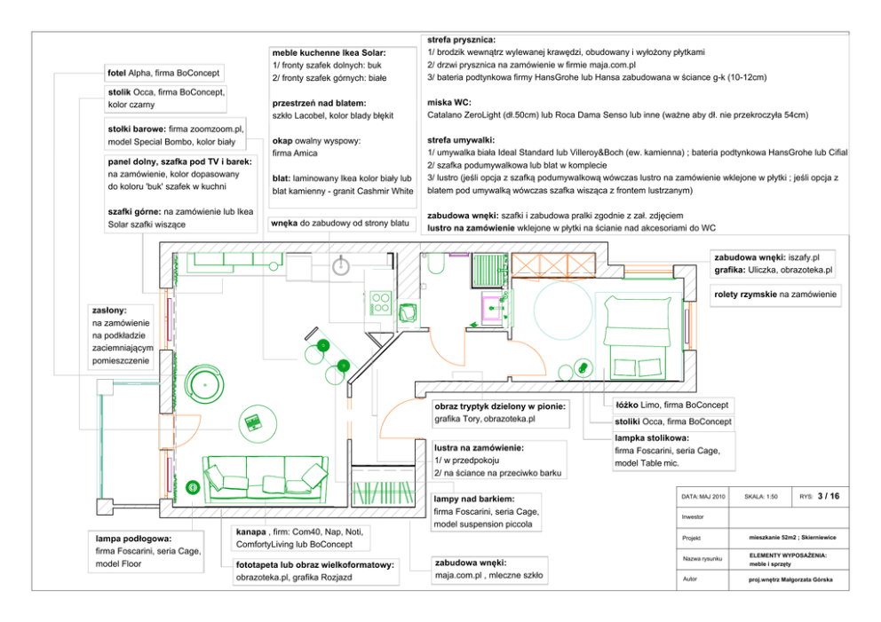 fotel Alpha, firma BoConcept stolik Occa, firma BoConcept, kolor czarny stołki barowe: firma zoomzoom.pl, model Special Bombo, kolor biały panel dolny, szafka pod TV i barek: na zamówienie, kolor dopasowany do koloru 'buk' szafek w kuchni szafki górne: na zamówienie lub Ikea Solar szafki wiszące meble kuchenne Ikea Solar: 1/ fronty szafek dolnych: buk 2/ fronty szafek górnych: białe strefa prysznica: 1/ brodzik wewnątrz wylewanej krawędzi, obudowany i wyłożony płytkami 2/ drzwi prysznica na zamówienie w firmie maja.com.pl 3/ bateria podtynkowa firmy HansGrohe lub Hansa zabudowana w ściance g-k (10-12cm) przestrzeń nad blatem: szkło Lacobel, kolor blady błękit miska WC: Catalano ZeroLight (dł.50cm) lub Roca Dama Senso lub inne (ważne aby dł. nie przekroczyła 54cm) okap owalny wyspowy: firma Amica strefa umywalki: 1/ umywalka biała Ideal Standard lub Villeroy&Boch (ew. kamienna) ; bateria podtynkowa HansGrohe lub Cifial 2/ szafka podumywalkowa lub blat w komplecie 3/ lustro (jeśli opcja z szafką podumywalkową wówczas lustro na zamówienie wklejone w płytki ; jeśli opcja z blatem pod umywalką wówczas szafka wisząca z frontem lustrzanym) blat: laminowany Ikea kolor biały lub blat kamienny - granit Cashmir White wnęka do zabudowy od strony blatu zabudowa wnęki: szafki i zabudowa pralki zgodnie z zał. zdjęciem lustro na zamówienie wklejone w płytki na ścianie nad akcesoriami do WC zabudowa wnęki: iszafy.pl grafika: Uliczka, obrazoteka.pl rolety rzymskie na zamówienie zasłony: na zamówienie na podkładzie zaciemniającym pomieszczenie obraz tryptyk dzielony w pionie: grafika Tory, obrazoteka.pl lustra na zamówienie: 1/ w przedpokoju 2/ na ściance na przeciwko barku lampa podłogowa: firma Foscarini, seria Cage, model Floor kanapa , firm: Com40, Nap, Noti, ComfortyLiving lub BoConcept fototapeta lub obraz wielkoformatowy: obrazoteka.pl, grafika Rozjazd lampy nad barkiem: firma Foscarini, seria Cage, model suspension piccola zabudowa wnęki: maja.com.pl , mleczne szkło łóżko Limo, firma BoConcept stoliki Occa, firma BoConcept lampka stolikowa: firma Foscarini, seria Cage, model Table mic. DATA: MAJ 2010 SKALA: 1:50 RYS: 3 / 16 Inwestor Projekt mieszkanie 52m2 ; Skierniewice Nazwa rysunku ELEMENTY WYPOSAŻENIA: meble i sprzęty Autor proj.wnętrz Małgorzata Górska