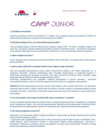 1. Jak długo trwa podróż? Jedziemy autokarami. Podróż trwa około 4,5 - 5 godzin. Czas przejazdu zależy od warunków na drodze. W trakcie jazdy przewidziane są postoje na wyznaczonych parkingach. 2. Którędy przebiega trasa i czy można dosiąść się po drodze? Trasa przebiega drogą na Ostrów Mazowiecką następnie drogą nr 667 na Łomże, następnie drogą nr 63 przez Pisz do Giżycka. Istnieje możliwość dosiadki po drodze w okolicach Łomży . Informację o dosiadaniu się po drodze należy zgłosić do pracownika BOK nie później niż na trzy dni przed planowanym wyjazdem. 3. Gdzie znajduje się Camp ? Camp położony jest w położony jest w Krainie Wielkich Jezior Mazurskich, na obrzeżu Puszczy Boreckiej w gminie Kruklanki. 4. Komu można oddać leki i pieniądze dziecka? Komu zgłosić uwagi nt dziecka? Leki oraz pieniądze (kieszonkowe) można oddać kierownikowi autokaru. Leki należy zapakować np.: w podpisany woreczek i dołączyć dawkowanie leku. Pieniądze przekazujemy w podpisanej kopercie z dodatkową instrukcją jak wydawać je dziecku, jeśli takie zastrzeżenia Państwo macie. Wszelkie uwagi dotyczące dziecka najlepiej przekazać drogą mailową do biura. Informacje przekazywane przy autokarze najlepiej przygotować w formie pisemnej i przekazać kierownikowi autokaru, żeby w momencie wyjazdu nie tracić czasu na szczegółowe opowiadania. UWAGA! Na obóz przyjmowane są dzieci zdrowe. Jeśli dziecko w dniu wyjazdu jest chore ( ma gorączkę, przyjmuje leki) prosimy o dowóz dziecka kilka dni później. Prosimy również o sprawdzenie głowy dziecka pod kątem wszawicy. To pozwoli na uniknięcie rozprzestrzeniania się chorób zakaźnych i wszy wśród innych uczestników. 5. Czy można zgłosić, aby znające się dzieci były razem w autokarze i w pokoju? Prośby o wspólne zakwaterowanie w pokoju i/lub w autokarze zgłaszamy do biura najpóźniej na 2 tygodnie przed rozpoczęciem obozu. Nie możemy zagwarantować spełnienia próśb zgłaszanych w ostatniej chwili, ponieważ dzieci są rozlokowywane zarówno w autokarach jak i w pokojach jeszcze przed wyjazdem. 6. Jak należy przygotować prowiant? Organizator nie przewiduje żadnych ciepłych posiłków w trakcie drogi. W drodze dojazdowej do Ośrodka dzieci prowiant zabierają z domu – sugerujemy, aby wyglądał podobnie jak ten, który otrzymują na obozie (dwie kanapki, drożdżówka, owoc, słodki batonik, woda mineralna). Prosimy o wykluczenie słodkich napoi gazowanych, „sztucznych i barwionych” słodyczy oraz chipsów. Zaraz po przyjeździe na miejsce dzieci jedzą obiad. Prowiant na drogę powrotną przygotowuje obozowa stołówka. 7. W jaki sposób dzieci są przydzielane do pokoi i grup zajęciowych? Dzieci są przydzielane do pokoi i grup zajęciowych przez kierownika danej grupy wiekowej. Kierownik bierze pod uwagę płeć, wiek oraz w miarę możliwości sugestie rodziców. Uwagi dotyczące zakwaterowania lub grup zajęciowych należy zgłosić do pracownika biura obsługi klienta nie później niż na dwa tygodnie przed rozpoczęciem obozu. Uwagi przesłane w późniejszym terminie są zwykle trudne do uwzględnienia. Grupy zajęciowe mogą się różnić od grup zakwaterowania: w jednym pokoju mogą mieszkać osoby należące do różnych grup zajęciowych. Co za tym idzie (ale też rzadko się zdarza), inny wychowawca chodzi z dziećmi na zajęcia a inny opiekuje się pokojem. Jeśli nawet dojdzie do takiej sytuacji to, są to wychowawcy z jednej grupy wiekowej dobrze znani dzieciom. 8. Na jaką pomoc mogą liczyć dzieci i młodzież? Najprościej mówiąc na każdą. Najmłodsze dzieci mają na Campie przeróżne troski. Niektóre są drobne, jak samodzielne ubranie czy toaleta wieczorna, inne znacznie poważniejsze, jak kłopoty z zaśnięciem, tęsknota za rodzicami czy nieporozumienia z kolegami i koleżankami. Wychowawcy pracujący na Campie posiadają takie kompetencje, by radzić sobie ze wszystkimi takimi sytuacjami: doradzają oni w doborze odpowiedniego ubrania, uczą nastawiać odpowiednią temperaturę wody w kranie, a dziewczynkom pomagają myć i czesać włosy, jeśli jest taka potrzeba. Podstawą życia campowego jest solidna integracja na początku obozu (przeprowadzana w grupie za pomocą gier i zabaw nastawionych na poznanie i polubienie się), a także wyjątkowa atmosfera podczas trwania całego obozu, co zapobiega kłótniom i nieporozumieniom między dziećmi. Kadra ma także wyjątkowe sposoby na tęsknotę najmłodszych campowiczów. Są to przede wszystkim: wieczorne czytanie, przy którym dużo maluchów usypia (a to ogranicza wieczorne rozmowy telefoniczne, przy których najmłodsi najczęściej się rozklejają), specjalne maskotki „leczące” tęsknotę, badziki (znaczki) dla „lodołamaczy” przełamujących swoje lęki i inne formy. 9.Jak wygląda standardowy dzień zajęć na Campie? Standartowy dzień na Campie Junior wygląda następująco: Ok. 7.00 pobudka i poranna toaleta Ok. 8.00 - 9.00 śniadanie Do obiadu dwa bloki zajęciowe trwające ok. 1,5 godziny Ok. 13.00 – 14.00 obiad Do kolacji dwa bloki zajęciowe trwające ok. 1,5 godziny Ok. 18. 00 – 19.00 kolacja 19.30 zajęcia wieczorne, zabawy, ognisko, dyskoteka itp. 21.30 lub 22.00 cisza nocna 10. Jak wyglądają i jak długo trwają posiłki? Co w przypadku niejadków? Posiłki trwają ok. 30 minut. Dzięki szwedzkiemu stołowi zazwyczaj nie ma większych problemów z niejadkami, bo każde dziecko znajduje coś dla siebie. W trudniejszych sytuacjach, z dziećmi podpisywane są kontrakty, które zachęcają do zjedzenia odpowiedniej i pożywnej porcji, by potem móc zjeść np. coś słodkiego. Zazwyczaj jednak nie trzeba uciekać się do takich sposobów, ponieważ aktywność fizyczna dzieci podczas codziennych zajęć sprawia, że same chętnie jedzą. 11. Czy jest możliwość realizacji diety lub przestrzegania zastrzeżeń dietetycznych? Dzieci ze specjalnymi potrzebam