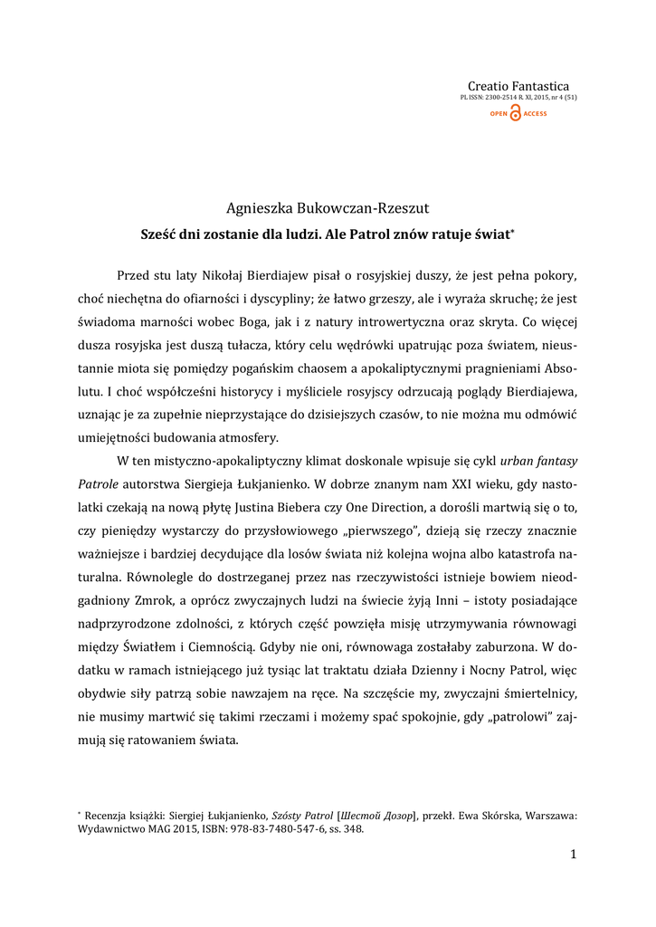 Creatio Fantastica PL ISSN: 2300-2514 R. XI, 2015, nr 4 (51) Agnieszka Bukowczan-Rzeszut Sześć dni zostanie dla ludzi. Ale Patrol znów ratuje świat* Przed stu laty Nikołaj Bierdiajew pisał o rosyjskiej duszy, że jest pełna pokory, choć niechętna do ofiarności i dyscypliny; że łatwo grzeszy, ale i wyraża skruchę; że jest świadoma marności wobec Boga, jak i z natury introwertyczna oraz skryta. Co więcej dusza rosyjska jest duszą tułacza, który celu wędrówki upatrując poza światem, nieustannie miota się pomiędzy pogańskim chaosem a apokaliptycznymi pragnieniami Absolutu. I choć współcześni historycy i myśliciele rosyjscy odrzucają poglądy Bierdiajewa, uznając je za zupełnie nieprzystające do dzisiejszych czasów, to nie można mu odmówić umiejętności budowania atmosfery. W ten mistyczno-apokaliptyczny klimat doskonale wpisuje się cykl urban fantasy Patrole autorstwa Siergieja Łukjanienko. W dobrze znanym nam XXI wieku, gdy nastolatki czekają na nową płytę Justina Biebera czy One Direction, a dorośli martwią się o to, czy pieniędzy wystarczy do przysłowiowego „pierwszego”, dzieją się rzeczy znacznie ważniejsze i bardziej decydujące dla losów świata niż kolejna wojna albo katastrofa naturalna. Równolegle do dostrzeganej przez nas rzeczywistości istnieje bowiem nieodgadniony Zmrok, a oprócz zwyczajnych ludzi na świecie żyją Inni – istoty posiadające nadprzyrodzone zdolności, z których część powzięła misję utrzymywania równowagi między Światłem i Ciemnością. Gdyby nie oni, równowaga zostałaby zaburzona. W dodatku w ramach istniejącego już tysiąc lat traktatu działa Dzienny i Nocny Patrol, więc obydwie siły patrzą sobie nawzajem na ręce. Na szczęście my, zwyczajni śmiertelnicy, nie musimy martwić się takimi rzeczami i możemy spać spokojnie, gdy „patrolowi” zajmują się ratowaniem świata. Recenzja książki: Siergiej Łukjanienko, Szósty Patrol [Шестой Дозор], przekł. Ewa Skórska, Warszawa: Wydawnictwo MAG 2015, ISBN: 978-83-7480-547-6, ss. 348. * 1 Potencjalny Armagedon skupi się oczywiście na jednym nieszczęśniku, Antonie Gorodeckim – Jasnym Innym pilnującym, aby Ciemność nie złamała warunków umowy i nie naruszyła równowagi. Czytelnicy mieli okazję poznać go po raz pierwszy w Nocnym Patrolu, a w szóstym tomie cyklu Anton jest już doświadczonym i wprawnym magiem, doskonale obeznanym z niuansami swojej pracy – w tym z biurokracją, jaka wiąże się z funkcjonowaniem obydwu Patroli. Zmienił się, dojrzał i dorósł do swojej misji – a to bardzo dobrze, bo idealizm w jego pracy nie jest wskazany. Oprócz wspaniałej kariery ma kochającą rodzinę: żonę Swietłanę (również Inną służącą w Patrolu) i córkę Nadieżdę – czarodziejkę Absolutną, a więc mającą teoretycznie nieograniczoną moc i zdolną do mierzenia się z każdym Innym na świecie, poza tym zaś będącą zupełnie zwyczajną czternastolatką, która czeka na nową płytę ulubionego artysty i umawia się z chłopakiem niekoniecznie pasującym według jej ojca do wizerunku przyszłego zięcia. Dość ustabilizowanym życiem Gorodeckich wstrząsa seria tajemniczych ataków na ludzi w Moskwie, bo właśnie tam toczy się akcja Szóstego Patrolu. Podobnie jak w poprzednich tomach cyklu, również i w tym wszystko zaczyna się od Ciemnych łamiących warunki traktatu. Tym razem niezarejestrowany wampir atakuje ludzi, ale ich nie zabija, co jest raczej nietypowe dla tych istot. Okazuje się, że działa według schematu, próbując przekazać wiadomość Antonowi, a ten musi rozwiązać zagadkę, zanim zginie więcej osób. Tymczasem wszyscy prorocy na świecie wieszczą nadchodzący Armagedon. Gorodecki ma bardzo niewiele czasu, by zrozumieć swoją rolę i zapobiec katastrofie. Sam na pewno nie podoła zadaniu, bo proroctwo wyraźnie mówi o tajemniczym „Szóstym Patrolu”, a wszyscy wokół nabierają wody w usta – albo faktycznie nic nie wiedzą. Zagrożenie rośnie, grunt pali się pod nogami, zaś tajemnicza siła zdaje się nastawać na jego rodzinę… Przelane nie na darmo, spalone nie na próżno. Nadszedł pierwszy czas, dwóch stanie w ciele i otworzą drzwi... Trzy ofiary za czwartym razem; pięć dni zostanie dla Innych, sześć dni zostanie dla ludzi. Dla tych, którzy staną na drodze, nie zostanie nic. Szósty Patrol jest martwy. Piąta Siła zniknęła. Czwarta nie zdążyła. Trzecia Siła nie wierzy, druga Siła się boi, pierwsza jest zmęczona 1. Trzeba przyznać Łukjanience, że do świata jego powieści wkracza się z łatwością i trudno się od niego oderwać. Zmrok od razu nas pochłania, a przygody Jasnych i 1 Tamże, s. 77 2 Ciemnych toczących ze sobą kilkusetletnią grę o wpływy są niezwykle wciągające. Wyraziści bohaterowie są jednocześnie barwni i bardzo ludzcy, z całym bagażem wad i doświadczeń, jakie może posiąść ktoś, kto przez całe stulecia zmaga się z trudną misją walki o utrzymanie równowagi między antagonistycznymi siłami. Są zgorzkniali, cyniczni, zabawni, niejednoznaczni, rozdarci. Każdy z nich ma swoją historię, dźwiga emocjonalny bagaż, chowa skryte urazy. Niektórzy przeżyli osobiste tragedie. W szóstym tomie serii, choć wierni czytelnicy zdążyli już doskonale poznać większość z nich, nadal można dowiedzieć się kilku zaskakujących rzeczy. A nowi czytelnicy, dla których ten tom będzie pierwszą przygodą z cyklem (lub autorem), z pewnością zapragną poznać bohaterów lepiej. Szósty Patrol nie zaskakuje w stosunku do reszty serii zbyt wieloma rozwiązaniami, ale nie można tej pozycji nazwać wtórną. Łukjanienko stosuje znany swoim czytelnikom, sprawdzony sposób prowadzenia narracji, w której akcja pędzi wartko, przeplatana jedynie gdzieniegdzie refleksjami bohatera (dywagacje nad tolerancją dla – nomen omen – inności w paryskiej taksówce są przezabawne, podobnie