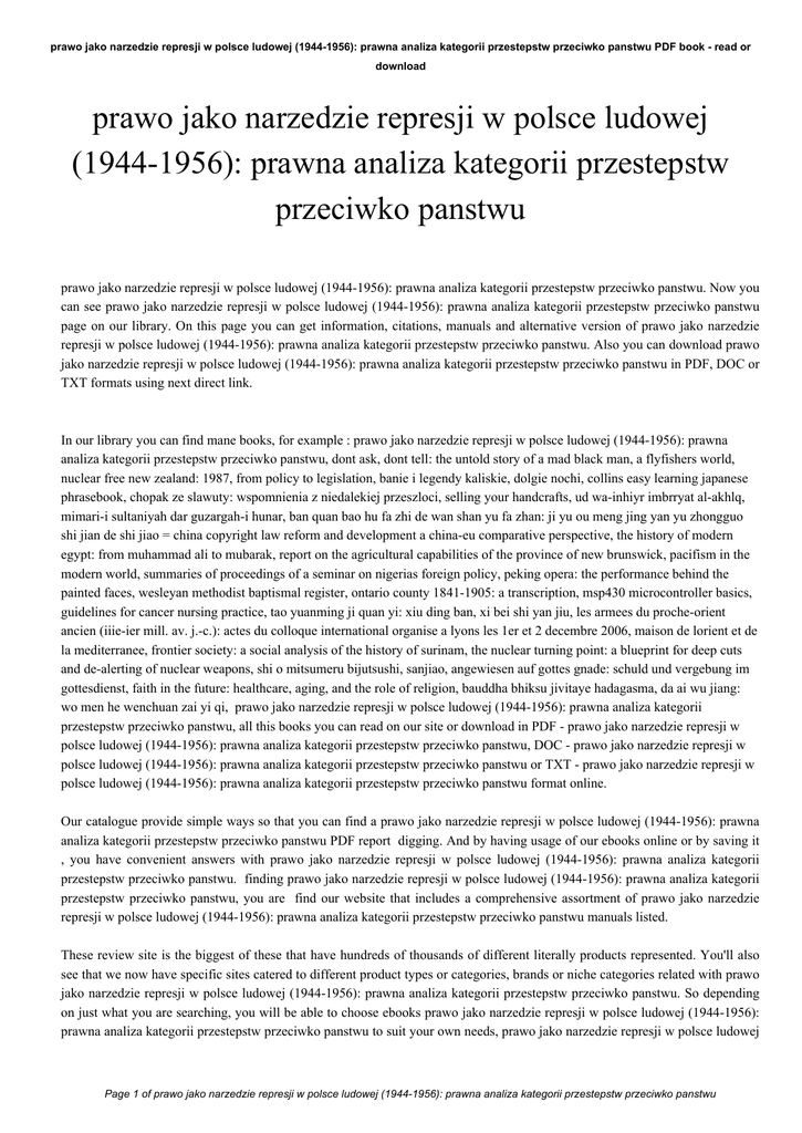 prawo jako narzedzie represji w polsce ludowej (1944-1956): prawna analiza kategorii przestepstw przeciwko panstwu PDF book - read or download prawo jako narzedzie represji w polsce ludowej (1944-1956): prawna analiza kategorii przestepstw przeciwko panstwu prawo jako narzedzie represji w polsce ludowej (1944-1956): prawna analiza kategorii przestepstw przeciwko panstwu. Now you can see prawo jako narzedzie represji w polsce ludowej (1944-1956): prawna analiza kategorii przestepstw przeciwko panstwu page on our library. On this page you can get information, citations, manuals and alternative version of prawo jako narzedzie represji w polsce ludowej (1944-1956): prawna analiza kategorii przestepstw przeciwko panstwu. Also you can download prawo jako narzedzie represji w polsce ludowej (1944-1956): prawna analiza kategorii przestepstw przeciwko panstwu in PDF, DOC or TXT formats using next direct link. In our library you can find mane books, for example : prawo jako narzedzie represji w polsce ludowej (1944-1956): prawna analiza kategorii przestepstw przeciwko panstwu, dont ask, dont tell: the untold story of a mad black man, a flyfishers world, nuclear free new zealand: 1987, from policy to legislation, banie i legendy kaliskie, dolgie nochi, collins easy learning japanese phrasebook, chopak ze slawuty: wspomnienia z niedalekiej przeszloci, selling your handcrafts, ud wa-inhiyr imbrryat al-akhlq, mimari-i sultaniyah dar guzargah-i hunar, ban quan bao hu fa zhi de wan shan yu fa zhan: ji yu ou meng jing yan yu zhongguo shi jian de shi jiao = china copyright law reform and development a china-eu comparative perspective, the history of modern egypt: from muhammad ali to mubarak, report on the agricultural capabilities of the province of new brunswick, pacifism in the modern world, summaries of proceedings of a seminar on nigerias foreign policy, peking opera: the performance behind the painted faces, wesleyan methodist baptismal register, ontario county 1841-1905: a transcription, msp430 microcontroller basics, guidelines for cancer nursing practice, tao yuanming ji quan yi: xiu ding ban, xi bei shi yan jiu, les armees du proche-orient ancien (iiie-ier mill. av. j.-c.): actes du colloque international organise a lyons les 1er et 2 decembre 2006, maison de lorient et de la mediterranee, frontier society: a social analysis of the history of surinam, the nuclear turning point: a blueprint for deep cuts and de-alerting of nuclear weapons, shi o mitsumeru bijutsushi, sanjiao, angewiesen auf gottes gnade: schuld und vergebung im gottesdienst, faith in the future: healthcare, aging, and the role of religion, bauddha bhiksu jivitaye hadagasma, da ai wu jiang: wo men he wenchuan zai yi qi, prawo jako narzedzie represji w polsce ludowej (1944-1956): prawna analiza kategorii przestepstw przeciwko panstwu, all this books you can read on our site or download in PDF - prawo jako narzedzie represji w polsce ludowej (1944-1956): prawna analiza kategorii przestepstw przeciwko panstwu, DOC - prawo jako narzedzie represji w polsce ludowej (1944-1956): prawna analiza kategorii przestepstw przeciwko panstwu or TXT - prawo jako narzedzie represji w polsce ludowej (1944-1956): prawna analiza kategorii przestepstw przeciwko panstwu format online. Our catalogue provide simple ways so that you can find a prawo jako narzedzie represji w polsce ludowej (1944-1956): prawna analiza kategorii przestepstw przeciwko panstwu PDF report digging. And by having usage of our ebooks online or by saving it , you have convenient answers with prawo jako narzedzie represji w polsce ludowej (1944-1956): prawna analiza kategorii przestepstw przeciwko panstwu. finding prawo jako narzedzie represji w polsce ludowej (1944-1956): prawna analiza kategorii przestepstw przeciwko panstwu, you are find our website that includes a comprehensive assortment of prawo jako narzedzie represji w polsce ludowej (1944-1956): prawna analiza kategorii przestepstw przeciwko panstwu manuals listed. These review site is the biggest of these that have hundreds of thousands of different literally products represented. You'll also see that we now have specific sites catered to different product types or categories, brands or niche categories related with prawo jako narzedzie represji w polsce ludowej (1944-1956): prawna analiza kategorii przestepstw przeciwko panstwu. So depending on just what you are searching, you will be able to choose ebooks prawo jako narzedzie represji w polsce ludowej (1944-1956): prawna analiza kategorii przestepstw przeciwko panstwu to suit your own needs, prawo jako narzedzie represji w polsce ludowej Page 1 of prawo jako narzedzie represji w polsce ludowej (1944-1956): prawna analiza kategorii przestepstw przeciwko panstwu prawo jako narzedzie represji w polsce ludowej (1944-1956): prawna analiza kategorii przestepstw przeciwko panstwu PDF book - read or download (1944-1956): prawna analiza kategorii przestepstw przeciwko panstwu. Page 2 of prawo jako narzedzie represji w polsce ludowej (1944-1956): prawna analiza kategorii przestepstw przeciwko panstwu