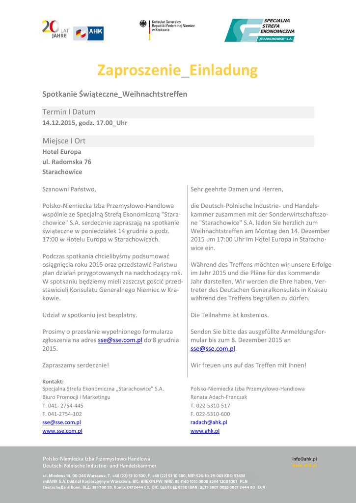 Zaproszenie_Einladung Spotkanie Świąteczne_Weihnachtstreffen Termin I Datum 14.12.2015, godz. 17.00_Uhr Miejsce I Ort Hotel Europa ul. Radomska 76 Starachowice Szanowni Państwo, Sehr geehrte Damen und Herren, Polsko-Niemiecka Izba Przemysłowo-Handlowa wspólnie ze Specjalną Strefą Ekonomiczną "Starachowice" S.A. serdecznie zapraszają na spotkanie świąteczne w poniedziałek 14 grudnia o godz. 17:00 w Hotelu Europa w Starachowicach. die Deutsch-Polnische Industrie- und Handelskammer zusammen mit der Sonderwirtschaftszone "Starachowice" S.A. laden Sie herzlich zum Weihnachtstreffen am Montag den 14. Dezember 2015 um 17:00 Uhr im Hotel Europa in Starachowice ein. Podczas spotkania chcielibyśmy podsumować osiągnięcia roku 2015 oraz przedstawić Państwu plan działań przygotowanych na nadchodzący rok. W spotkaniu będziemy mieli zaszczyt gościć przedstawicieli Konsulatu Generalnego Niemiec w Krakowie. Während des Treffens möchten wir unsere Erfolge im Jahr 2015 und die Pläne für das kommende Jahr darstellen. Wir werden die Ehre haben, Vertreter des Deutschen Generalkonsulats in Krakau während des Treffens begrüßen zu dürfen. Udział w spotkaniu jest bezpłatny. Die Teilnahme ist kostenlos. Prosimy o przesłanie wypełnionego formularza zgłoszenia na adres [email protected] do 8 grudnia 2015. Senden Sie bitte das ausgefüllte Anmeldungsformular bis zum 8. Dezember 2015 an [email protected]. Zapraszamy serdecznie! Wir freuen uns auf das Treffen mit Ihnen! Kontakt: Specjalna Strefa Ekonomiczna „Starachowice” S.A. Biuro Promocji i Marketingu T. 041- 2754-445 F. 041-2754-102 [email protected] www.sse.com.pl Polsko-Niemiecka Izba Przemysłowo-Handlowa Renata Adach-Franczak T. 022-5310-517 F. 022-5310-600 [email protected] www.ahk.pl Zgłoszenie_Anmeldung Spotkanie Świąteczne_Weihnachtstreffen 14.10.2015, godz. 17.00_Uhr Hotel Europa Radomska 76 Starachowice Potwierdzenie udziału prosimy przesłać do dnia 08.12.2015 na numer faksu lub mailem: Bitte senden Sie Ihre Anmeldung bis zum 08.12.2015 an die u.g. Faxnummer oder per E-Mail: +48 41 2754102 [email protected] Proszę o podanie następujących danych: Bitte geben Sie folgende Daten an: Firma ………………………………………………………………………………………………………………………………………………………………. Imię i nazwisko_Vor- und Nachname ………………………………………………………………………………………………………………………………………………………………. Stanowisko_Position ………………………………………………………………………………………………………………………………………………………………. E-Mail ………………………………………………………………………………………………………………………………………………………………. Telefon ………………………………………………………………………………………………………………………………………………………………. Ulica, numer, kod i miejscowość _ Straße, Nummer, PLZ, Ort ………………………………………………………………………………………………………………………………………………………………. Data i podpis, Datum und Unterschrift …………………………………………………………..………….…… ……………………………………………………………………………..