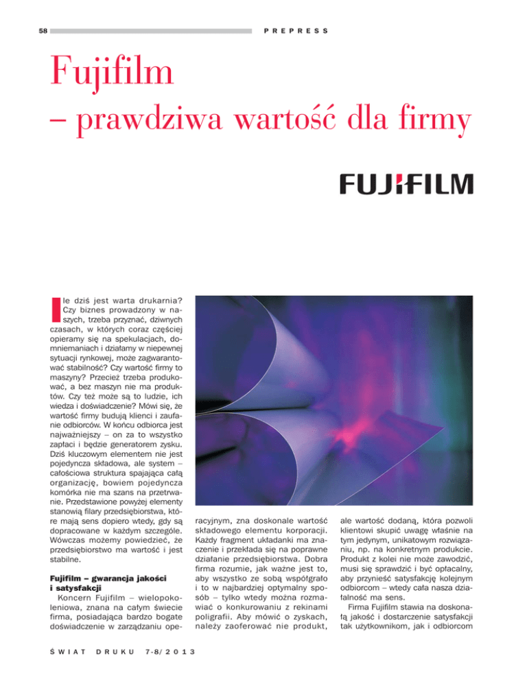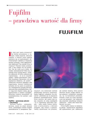 58 P R E P R E S S Fujifilm – prawdziwa wartość dla firmy I le dziś jest warta drukarnia? Czy biznes prowadzony w naszych, trzeba przyznać, dziwnych czasach, w których coraz częściej opieramy się na spekulacjach, domniemaniach i działamy w niepewnej sytuacji rynkowej, może zagwarantować stabilność? Czy wartość firmy to maszyny? Przecież trzeba produkować, a bez maszyn nie ma produktów. Czy też może są to ludzie, ich wiedza i doświadczenie? Mówi się, że wartość firmy budują klienci i zaufanie odbiorców. W końcu odbiorca jest najważniejszy – on za to wszystko zapłaci i będzie generatorem zysku. Dziś kluczowym elementem nie jest pojedyncza składowa, ale system – całościowa struktura spajająca całą organizację, bowiem pojedyncza komórka nie ma szans na przetrwanie. Przedstawione powyżej elementy stanowią filary przedsiębiorstwa, które mają sens dopiero wtedy, gdy są dopracowane w każdym szczególe. Wówczas możemy powiedzieć, że przedsiębiorstwo ma wartość i jest stabilne. Fujifilm – gwarancja jakości i satysfakcji Koncern Fujifilm – wielopokoleniowa, znana na całym świecie firma, posiadająca bardzo bogate doświadczenie w zarządzaniu opeŚ W I A T D R U K U 7-8/ 2 0 1 3 racyjnym, zna doskonale wartość składowego elementu korporacji. Każdy fragment układanki ma znaczenie i przekłada się na poprawne działanie przedsiębiorstwa. Dobra firma rozumie, jak ważne jest to, aby wszystko ze sobą współgrało i to w najbardziej optymalny sposób – tylko wtedy można rozmawiać o konkurowaniu z rekinami poligrafii. Aby mówić o zyskach, należy zaoferować nie produkt, ale wartość dodaną, która pozwoli klientowi skupić uwagę właśnie na tym jedynym, unikatowym rozwiązaniu, np. na konkretnym produkcie. Produkt z kolei nie może zawodzić, musi się sprawdzić i być opłacalny, aby przynieść satysfakcję kolejnym odbiorcom – wtedy cała nasza działalność ma sens. Firma Fujifilm stawia na doskonałą jakość i dostarczenie satysfakcji tak użytkownikom, jak i odbiorcom 59 P R E P R E S S • nie potrzebujemy wywoływarki, dzięki czemu oszczędzamy setki godzin pracy rocznie, eliminując także koszt sprzątania i utrzymania. końcowym. Produkty koncernu zawsze powstają z wykorzystaniem najnowszych, ekologicznych technologii i dają gwarancję niezawodności. Niezależnie od tego, czy są to formy drukowe, chemia, czy maszyna, logotyp Fujifilm zapewnia jakość i wartość dodaną. Jest to szczególnie ważne w czasach, kiedy optymalizacja produkcji staje się standardem, a nie, jak kiedyś – obiecywaną, nigdy nie urzeczywistnioną wizją. Brillia HD PRO-T3 – jak działać PRO-oszczędnie i PRO-ekologicznie Sztandarowym produktem koncernu Fujifilm, pozwalającym osiągać doskonałe wyniki w dziale prepress, jest offsetowa płyta bezprocesowa PRO T3. W erze urządzeń cyfrowych forma drukowa jest jednym z elementów utrzymujących rentowność zleceń realizowanych w technologii offsetowej. Brillia HD PRO-T3 to płyta termiczna, która po naświetleniu nie wymaga żadnych procesów wykończeniowych, takich jak wywoływanie, i trafia prosto z naświetlarki do maszyny drukującej. Zapewnia ona doskonałą jakość i wydajność procesu druku, podobnie jak inne płyty cyfrowe dla wszystkich typów drukowania komercyjnego. Płyta z powodzeniem daje sobie radę z obrazami wykonanymi zarówno przy użyciu rastra stochastycznego, jak i hybrydowego. Gwarantuje również bardzo krótki czas naświetlania, a zaraz po opuszczeniu naświetlarki może zostać założona na maszynę drukującą. Istotny jest fakt, że odbitka nakładowa jest osiągalna tak jak przy zastosowaniu konwencjonalnej płyty offsetowej. Czas wypłukiwania miejsc niedrukujących można pominąć, dzięki innowacyjnej technologii Fine Particle Dispersion (FPD). Ta wysoko zaawansowana technologia mikrodyspersji nie pozwala na zmianę warunków nawilżania i nie ma wpływu na jakość druku – nie zmienia konduktywności ani pH, a zbędne elementy emulsji są usuwane na kilku pierwszych wydrukowanych arkuszach. PRO-T3, ze względu na jej sposób wykonywania, jest płytą najbardziej przyjazną dla środowiska i co najważniejsze, również najbardziej efektywną. Eliminując proces wywoływania w wywoływarce nie zużywamy energii, wody i chemii, a także nie wytwarzamy odpadów. PRO-T3 nie wykorzystuje środków chemicznych i gumy, więc koszt z tym związany ulega redukcji. Płyta nie potrzebuje wody, co przyczynia się do oszczędności. Nie potrzebuje też samej wywoływarki, dzięki czemu zmniejsza się emisja dwutlenku węgla lub zostaje wyeliminowany koszt inwestycji. Obróbka płyty nie przysparza odpadów – ogranicza to zanieczyszczenie środowiska, nie ma też materiałów wysyłanych na składowiska czy do utylizacji. Płyta PRO T3 firmy Fujifilm daje odpowiedź na pytanie, jak działać PRO-oszczędnie i PRO-ekologicznie: • oszczędzamy pieniądze redukując chemikalia • znacząco obniżamy rachunki za elektryczność i wodę • zmniejszamy koszt wywozu i utylizacji odpadów Brillia HD PRO-V – innowacyjna technologia fioletowa Innowacyjne rozwiązania są zastosowane również w przypadku płyt naświetlanych w technologii fioletowej. Brillia HD PRO-V to jedna z najnowszych płyt Fujifilm, mających na celu uproszczenie procesu w przygotowalni poprzez mniejszą ilość zużywanej chemii. Dzięki temu urządzenia do wywoływania wymagają rzadszej konserwacji, a dział prepress produkuje mniej odpadów niż jego konwencjonalny konkurent. Ponadto nie jest już potrzebna obecność regeneratora, a zatem nie występuje problem z codziennym monitorowanie pH oraz konduktywności kąpieli – sprawność systemu „lo-chem” zapewnia jedynie kilka mililitrów czystej wody dziennie. Dzięki wysokiej polimeryzacji i czułości płyt Fujifilm, Brillia HD PRO-V zapewnia również doskonałe wyniki jakościowe, gwarantując odwzoro