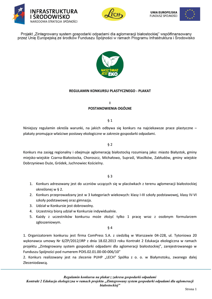 REGULAMIN KONKURSU PLASTYCZNEGO - PLAKAT I POSTANOWIENIA OGÓLNE §1 Niniejszy regulamin określa warunki, na jakich odbywa się konkurs na najciekawsze prace plastyczne – plakaty promujące właściwe postawy ekologiczne w zakresie gospodarki odpadami. §2 Konkurs ma zasięg regionalny i obejmuje aglomerację białostocką rozumianą jako: miasto Białystok, gminy miejsko-wiejskie Czarna-Białostocka, Choroszcz, Michałowo, Supraśl, Wasilków, Zabłudów, gminy wiejskie Dobrzyniewo Duże, Gródek, Juchnowiec Kościelny. §3 1. Konkurs adresowany jest do uczniów uczących się w placówkach z terenu aglomeracji białostockiej określonej w § 2. 2. Konkurs przeprowadzany jest w 3 kategoriach wiekowych: klasy I-III szkoły podstawowej, klasy IV-VI szkoły podstawowej oraz gimnazja. 3. Udział w Konkursie jest dobrowolny. 4. Uczestnicy biorą udział w Konkursie indywidualnie. 5. Każdy z uczestników konkursu może złożyć tylko 1 pracę wraz z osobnym formularzem zgłoszeniowym. §4 1. Organizatorem konkursu jest firma ComPress S.A. z siedzibą w Warszawie 04-228, ul. Tytoniowa 20 wykonawca umowy Nr 6/ZP/2012/JRP z dnia 18.02.2013 roku Kontrakt 2 Edukacja ekologiczna w ramach projektu „Zintegrowany system gospodarki odpadami dla aglomeracji białostockiej”, zarejestrowanego w Funduszu Spójności pod numerem POIS.02.01.00-00-006/10” 2. Konkurs realizowany jest na zlecenie PUHP „LECH” Spółka z o. o. w Białymstoku, zwanego dalej Zleceniodawcą. Regulamin konkursu na plakat z zakresu gospodarki odpadami Kontrakt 2 Edukacja ekologiczna w ramach projektu „Zintegrowany system gospodarki odpadami dla aglomeracji białostockiej” Strona 1 §5 Warunkiem uczestnictwa w Konkursie jest przesłanie do jego organizatora – firmy ComPress S.A.: pracy konkursowej –na adres podany w par. 4 w terminie od 18.02.2014 do dnia 05.03.2014 wraz z formularzem zgłoszeniowym stanowiącym Załącznik nr 1 do niniejszego Regulaminu. §6 Prace konkursowe będą oceniane odrębnie w każdej kategorii wiekowej określonej w § 3 pkt. 2. §7 1. W każdej kategorii wiekowej zostaną przyznane I, II oraz III miejsce oraz wyróżnienie. 2. Laureaci zostaną uhonorowani nagrodami o wartościach – I miejsce 500 zł, II miejsce – 400 zł, III miejsce – 300 zł, wyróżnienie – 100 zł. II CELE KONKURSU §8 Celami Konkursu są: a) b) c) d) uświadomienie znaczenia segregacji odpadów, kształtowanie poczucia odpowiedzialności za stan środowiska, kształtowanie postaw pro-ekologicznych, zachęcanie do segregacji odpadów. III ZAKRES TEMATYCZNY KONKURSU §9 Tematyka prac konkursowych musi uwzględniać kwestie związane z gospodarką odpadami. §10 Pracę należy wykonać wg poniższych wymagań: 1. Format pracy – A4, 2. Technika pracy - dowolna, 3. Na odwrocie podpisać imieniem i nazwiskiem autora oraz kategorią wiekową. Regulamin konkursu na plakat z zakresu gospodarki odpadami Kontrakt 2 Edukacja ekologiczna w ramach projektu „Zintegrowany system gospodarki odpadami dla aglomeracji białostockiej” Strona 2 §11 W Konkursie będzie oceniana: a) Poprawność merytoryczna pracy, b) Wartości edukacyjne, c) Pomysłowość i oryginalność pracy. §12 Praca musi spełniać wszystkie warunki regulaminu. IV PRZEBIEG KONKURSU §13 Konkurs odbywa się dla uczniów placówek oświatowych z aglomeracji białostockiej, określonej w §2, którzy prześlą pracę – plakat, wraz z formularzem zgłoszeniowym, stanowiącym Załącznik nr 1 do niniejszego Regulaminu, na adres Organizatora – ComPress S.A., ul. Tytoniowa 20, 04-228 Warszawa, z dopiskiem na kopercie „Konkurs plastyczny”. §14 Prace można przesyłać w terminie 18.02.2014 – 05.03.2014 (Liczy się data stempla pocztowego). Prace przesłane przed lub po tym terminie nie będą oceniane. Na kopercie należy zamieścić informację „Konkurs ekologiczny - plakat”. §15 Ocena nadesłanych prac i rozstrzygnięcie Konkursu nastąpi w terminie do 30.04.2014 r. §16 1. Finał Konkursu wraz z uroczystością wręczenia nagród nastąpi w maju lub czerwcu 2014 roku. 2. Zawiadomienie o dokładnym terminie Finału Konkursu będzie przesłane osobiście każdemu laureatowi. 3. Lista laureatów Konkursu oraz data wręczenia nagród zostaną opublikowane na stronie internetowej www.czystaenergia.bialystok.pl oraz zakładce www.odpady.bialystok.pl/eko-konkurs do dnia 05.05.2014 r. Regulamin konkursu na plakat z zakresu gospodarki odpadami Kontrakt 2 Edukacja ekologiczna w ramach projektu „Zintegrowany system gospodarki odpadami dla aglomeracji białostockiej” Strona 3 §17 Informacji na temat Konkursu udziela: Magdalena Kaczorowska-Dołowy, Konsultant ds. gospodarki odpadami oraz edukacji ekologicznej, ComPress S.A. Tel. 694 911 622, e-mail: [email protected]. V PRACA KOMISJI KONKURSOWEJ §18 1. Komisja Konkursowa składać się będzie z 3 osób – trenerów edukacji ekologicznej. 2. Komisję powołuje organizator konkursu - firma ComPress. 3. Termin i sposób pracy Komisji ustala jej Przewodniczący. 4. Komisja rozpoczyna pracę od zweryfikowania zgodności formalnej nadesłanych zgłoszeń z Regulaminem Konkursu. 5. Prawo interpretacji zapisów niniejszego regulaminu w sytuacjach wątpliwych przysługuje Przewodniczącemu Komisji Konkursowej. 6. Komisja ocenia prace, zgodnie z kryteriami, stanowiącymi Załącznik 2 do niniejszego Regulaminu. 7. Komisja sporządza protokół oceny przesłanych prac. §19 Autorom nadesłanych prac nie przysługuje odwołanie od decyzji Komisji. VI POSTANOWIENIA KOŃCOWE §20 Prawa autorskie 1. Laureaci konkursu przeniosą na Organizatora autorskie prawa majątkowe do utworów powstałych podczas konkursu na plakat dotyczący gospodarki odpadami. Przeniesienie praw autorskich nastąpi z chwilą wysłania pracy do organizatora konkursu. 2. Przeniesienie autorskich praw majątkowych do utworów, o których mowa w ust. 1 następuje bez ograniczenia co do terytorium, czasu oraz liczby egzemplarzy w zakr