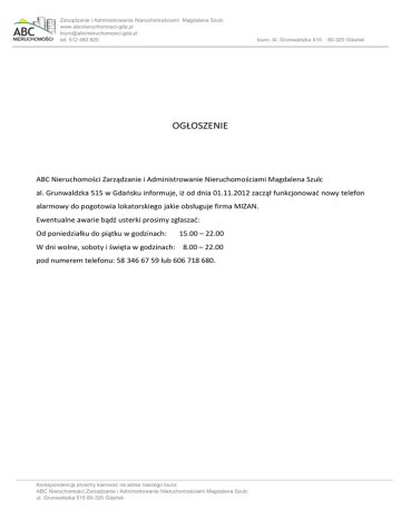 Zarządzanie i Administrowanie Nieruchomościami Magdalena Szulc www.abcnieruchomosci-gda.pl [email protected] tel. 512 492 820 biuro: Al. Grunwaldzka 515 80-320 Gdańsk OGŁOSZENIE ABC Nieruchomości Zarządzanie i Administrowanie Nieruchomościami Magdalena Szulc al. Grunwaldzka 515 w Gdaosku informuje, iż od dnia 01.11.2012 zaczął funkcjonowad nowy telefon alarmowy do pogotowia lokatorskiego jakie obsługuje firma MIZAN. Ewentualne awarie bądź usterki prosimy zgłaszad: Od poniedziałku do piątku w godzinach: 15.00 – 22.00 W dni wolne, soboty i święta w godzinach: 8.00 – 22.00 pod numerem telefonu: 58 346 67 59 lub 606 718 680. Korespondencję prosimy kierować na adres naszego biura: ABC Nieruchomości Zarządzanie i Administrowanie Nieruchomościami Magdalena Szulc ul. Grunwaldzka 515 80-320 Gdańsk
