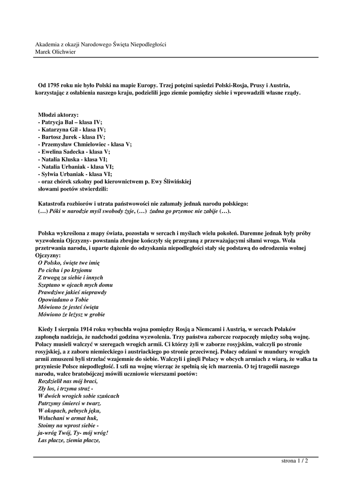 Akademia z okazji Narodowego Święta Niepodległości Marek Olichwier Od 1795 roku nie było Polski na mapie Europy. Trzej potężni sąsiedzi Polski-Rosja, Prusy i Austria, korzystając z osłabienia naszego kraju, podzielili jego ziemie pomiędzy siebie i wprowadzili własne rządy. Młodzi aktorzy: - Patrycja Bal – klasa IV; - Katarzyna Gil - klasa IV; - Bartosz Jurek - klasa IV; - Przemysław Chmielowiec - klasa V; - Ewelina Sadecka - klasa V; - Natalia Kluska - klasa VI; - Natalia Urbaniak - klasa VI; - Sylwia Urbaniak - klasa VI; - oraz chórek szkolny pod kierownictwem p. Ewy Śliwińskiej słowami poetów stwierdzili: Katastrofa rozbiorów i utrata państwowości nie załamały jednak narodu polskiego: (…) Póki w narodzie myśl swobody żyje, (…) żadna go przemoc nie zabije (…). Polska wykreślona z mapy świata, pozostała w sercach i myślach wielu pokoleń. Daremne jednak były próby wyzwolenia Ojczyzny- powstania zbrojne kończyły się przegraną z przeważającymi siłami wroga. Wola przetrwania narodu, i uparte dążenie do odzyskania niepodległości stały się podstawą do odrodzenia wolnej Ojczyzny: O Polsko, święte twe imię Po cichu i po kryjomu Z trwogą za siebie i innych Szeptano w ojcach mych domu Prawdziwe jakieś nieprawdy Opowiadano o Tobie Mówiono że jesteś święta Mówiono że leżysz w grobie Kiedy I sierpnia 1914 roku wybuchła wojna pomiędzy Rosją a Niemcami i Austrią, w sercach Polaków zapłonęła nadzieja, że nadchodzi godzina wyzwolenia. Trzy państwa zaborcze rozpoczęły między sobą wojnę. Polacy musieli walczyć w szeregach wrogich armii. Ci którzy żyli w zaborze rosyjskim, walczyli po stronie rosyjskiej, a z zaboru niemieckiego i austriackiego po stronie przeciwnej. Polacy odziani w mundury wrogich armii zmuszeni byli strzelać wzajemnie do siebie. Walczyli i ginęli Polacy w obcych armiach z wiarą, że walka ta przyniesie Polsce niepodległość. I szli na wojnę wierząc że spełnią się ich marzenia. O tej tragedii naszego narodu, walce bratobójczej mówili uczniowie wierszami poetów: Rozdzielił nas mój braci, Zły los, i trzyma straż W dwóch wrogich sobie szańcach Patrzymy śmierci w twarz. W okopach, pełnych jęku, Wsłuchani w armat huk, Stoimy na wprost siebie ja-wróg Twój, Ty- mój wróg! Las płacze, ziemia płacze, strona 1 / 2 Akademia z okazji Narodowego Święta Niepodległości Marek Olichwier świat cały w ogniu drży, W dwóch wrogich sobie szańcach stoimy ja i ty. Zmagania wojenne trwały ponad cztery lata i zakończyły się klęską Niemiec i Austrii oraz rewolucją w Rosji. Przywódcy tych państw uznali prawo narodu polskiego do niepodległości. Polska po ponad stu dwudziestu latach niewoli pojawiła się znów na mapach świata. Spełniły się marzenia Polaków, kochających swą Ojczyznę, pragnących dla niej żyć, pracować: (…) Ziemio ojczysta, ziemio jasna, nie będę powalonym drzewem. Codziennie mocniej w ciebie wrastam radością, smutkiem, dumą, gniewem Nie będę jak zerwana nić. Odrzucam pusto brzmiące słowa. Można nie kochać cię - i żyć, ale nie można owocować. Post scriptum wypowiedzianych wierszy, zaśpiewanych pieśni były słowa piosenki Jana Pietrzaka: Żeby Polska była Polską. Długotrwałe brawa widzów były podziękowaniem dla aktorów za ich występ. strona 2 / 2