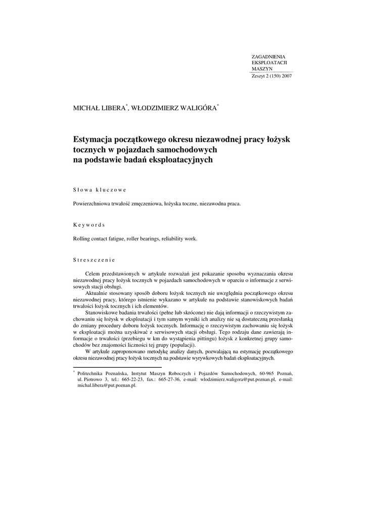 Estymacja początkowego okresu niezawodnej pracy łożysk tocznych … 109 ZAGADNIENIA EKSPLOATACJI MASZYN Zeszyt 2 (150) 2007 MICHAŁ LIBERA*, WŁODZIMIERZ WALIGÓRA* Estymacja początkowego okresu niezawodnej pracy łożysk tocznych w pojazdach samochodowych na podstawie badań eksploatacyjnych Słowa kluczowe Powierzchniowa trwałość zmęczeniowa, łożyska toczne, niezawodna praca. Keywords Rolling contact fatigue, roller bearings, reliability work. Streszczenie Celem przedstawionych w artykule rozważań jest pokazanie sposobu wyznaczania okresu niezawodnej pracy łożysk tocznych w pojazdach samochodowych w oparciu o informacje z serwisowych stacji obsługi. Aktualnie stosowany sposób doboru łożysk tocznych nie uwzględnia początkowego okresu niezawodnej pracy, którego istnienie wykazano w artykule na podstawie stanowiskowych badań trwałości łożysk tocznych i ich elementów. Stanowiskowe badania trwałości (pełne lub skrócone) nie dają informacji o rzeczywistym zachowaniu się łożysk w eksploatacji i tym samym wyniki ich analizy nie są dostateczną przesłanką do zmiany procedury doboru łożysk tocznych. Informację o rzeczywistym zachowaniu się łożysk w eksploatacji można uzyskiwać z serwisowych stacji obsługi. Tego rodzaju dane zawierają informacje o trwałości (przebiegu w km do wystąpienia pittingu) łożysk z konkretnej grupy samochodów bez znajomości liczności tej grupy (populacji). W artykule zaproponowano metodykę analizy danych, pozwalającą na estymację początkowego okresu niezawodnej pracy łożysk tocznych na podstawie wyrywkowych badań eksploatacyjnych. * Politechnika Poznańska, Instytut Maszyn Roboczych i Pojazdów Samochodowych, 60-965 Poznań, ul. Piotrowo 3, tel.: 665-22-23, fax.: 665-27-36, e-mail: [email protected], e-mail: [email protected]. M. Libera, W. Waligóra 110 1. Wprowadzenie Procedury doboru łożysk tocznych w węzłach maszyn i urządzeń są praktycznie niezmienne od chwili sprecyzowania ich przez A. Palmgrena już w latach 40. ubiegłego wieku. Zakładają one, że trwałość tych łożysk (warunkowana zjawiskami zmęczenia powierzchniowego) opisywana jest dwuparametrowym rozkładem Weibulla, mimo iż już wcześniej ten uczony stwierdził, że do tego opisu stosowany winien być rozkład trójparametrowy. W trójparametrowym rozkładzie Weibulla zakłada się, że każdy badany element ma pewien początkowy okres niezawodnej pracy. Wydaje się, że w procedurze doboru łożysk tocznych do węzłów maszyn ten początkowy okres niezawodnej pracy winien być uwzględniony. Jednakże dla opracowania takiej procedury należy przede wszystkim poznać wartość tego początkowego okresu. Producenci łożysk tocznych kontrolują swoje produkty m.in. poprzez ocenę ich trwałości wyznaczonej w trakcie badań stanowiskowych. Badania takie nie uwzględniają rzeczywistych warunków pracy łożysk tocznych. Aby uzyskać w pełni wiarygodne informacje, należy dokonać obserwacji łożysk tocznych podczas ich rzeczywistej eksploatacji. Celem przedstawionych w artykule rozważań jest pokazanie sposobu wyznaczania początkowego okresu niezawodnej pracy w pojazdach samochodowych w oparciu o informacje możliwe do uzyskania z serwisowych stacji obsługi. W stacjach tych można otrzymać dane o powierzchniowej trwałości zmęczeniowej łożysk tocznych, ale tylko tych, w których to zmęczenie wystąpiło. Nie jest natomiast znana liczba wszystkich pracujących w pojazdach samochodowych łożysk tocznych 2. Dobór łożysk tocznych w pojazdach samochodowych Podstawą obliczeń wielkości łożyska tocznego jest zależność między żądaną trwałością L, katalogową nośnością dynamiczną (ruchową) C i rzeczywistym obciążeniem łożyska F opisana wzorem (1): C L= F p (1) w którym: L C F p – – – – zakładana trwałość łożyska w milionach obrotów [mln obr], nośność dynamiczna (wg katalogu) [N], równoważne obciążenie dynamiczne [N], wykładnik potęgowy: dla łożysk kulkowych p = 3, a dla wałeczkowych p = 10/3. Estymacja początkowego okresu niezawodnej pracy łożysk tocznych … 111 Nośność dynamiczna podana w katalogu dla poszczególnych łożysk jest obciążeniem, przy którym 90% spośród badanych łożysk wykona co najmniej 1 milion obrotów. Procedura doboru łożysk tocznych przodujących producentów poza nośnością dynamiczną do równania trwałości wprowadza jeszcze dodatkowe współczynniki zależne od oczekiwanego poziomu niezawodności a1, rodzaju materiału a2 i warunków tarcia a3 [1] C Lna = a1a 2 a3 F p (2) gdzie: Lna – trwałość zmodyfikowana (efektywna) [mln obr], indeks n oznacza różnicę między niezawodnością wymaganą i 100-procentową, a1 – współczynnik niezawodności, a2 – współczynnik materiałowy, a3 – współczynnik zależny od warunków pracy (szczególnie od smarowania). Tabela 1. Wartości współczynnika niezawodności dla różnych poziomów niezawodności [1] Table. 1. Reliability factor a1 [1] Niezawodność φ % 90 95 96 97 98 99 100 Lna L10a L5a L4a L3a L2a L1a L0 a1 1 0,62 0,53 0,44 0,33 0,21 ..... W zależności od założonego poziomu niezawodności zmniejsza się efektywna trwałość łożyska (dla 90% a1 = 1), co przedstawiono w tab. 1. Dane z powyższej tabeli (poza ostatnią kolumną) zawarte są w większości katalogów łożysk tocznych, a wartości współczynnika a1 obliczone są na podstawie rozkładu dwuparametrowego Weibulla. Tylko nieliczne publikacje [2] podają wartość współczynnika a1 dla niezawodności 100%. Jest to wartość oszacowana przez Weibulla równa 0,05. 3. Początkowy okres niezawodnej pracy łożysk tocznych Okres zdatności prawidłowo zaprojektowanych i eksploatowanych węzłów tocznych determinuje zjawisko powierzchniowej trwałości zmęczeniowej. Tak więc przekonanie użytkowników, że do pewnego okresu pracy łożyska toczne M. Libera, W. Waligóra 112 muszą być niezawodne, jest uza