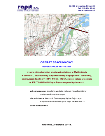 32-400 Myślenice, Rynek 28 Tel. (12) 274 30 60 www.rapit.com.pl OPERAT SZACUNKOWY REPERTORIUM NR 186/2014 wycena nieruchomości gruntowej położonej w Myślenicach w obrębie 1, zabudowanej budynkiem bazy magazynowo - handlowej, obejmującej działki nr 1494/1, 1494/3, 1494/4, objętej księgą wieczystą nr KR1Y/00049941/4 Sądu Rejonowego w Myślenicach cel opracowania: określenie wartości rynkowej nieruchomości w postępowaniu egzekucyjnym zleceniodawca: Komornik Sądowy przy Sądzie Rejonowym w Myślenicach Ewelina Łącka, sygn. akt KM 564/13 autor opracowania: Myślenice, 29 sierpnia 2014 r. Wycena nieruchomości, KR1Y/00049941/4, Myślenice obręb 1, dz. 1494/1, 1494/3, 1494/4 Autor opracowania: Tomasz Lehman strona 2/27 WYCIĄG Z OPERATU SZACUNKOWEGO Rep. Nr 186/2014 Określenie nieruchomości: Myślenice obręb 1, gmina i powiat Myślenice, woj. małopolskie, działki ewidencyjne nr 1494/1, 1494/3 i 1494/4, objęte KW nr KR1Y/00049941/4 Wydziału Ksiąg Wieczystych Sądu Rejonowego w Myślenicach, zabudowane budynkiem bazy magazynowo – handlowej przy ulicy Kazimierza Wielkiego Rodzaj nieruchomości: nieruchomość gruntowa zabudowana 2 Opis nieruchomości: działki o łącznej powierzchni 4076 m , stanowiące funkcjonalną całość, ogrodzone w całości, w przeważającej części z nawierzchnią z kostki betonowej; na działce numer 1494/3 posadowiony jest budynek produkcyjnomagazynowy o kubaturze 1569 m3, budynek o konstrukcji szkieletowej mieszanej, ściany z bloczków PGS, dach kryty papą Cel wyceny: opis i oszacowanie wartości rynkowej nieruchomości w postępowaniu egzekucyjnym Właściciel nieruchomości: Przemysław Solarz syn Bogusława i Ewy w całości Metoda wyceny: podejście dochodowe, metoda inwestycyjna, technika kapitalizacji prostej; podejście porównawcze, metoda korygowania ceny średniej Data określenia wartości rynkowej: 29 sierpnia 2014 r. Wartość rynkowa nieruchomości aktualna (WR): 1 045 000 zł słownie złotych: jeden milion czterdzieści pięć tysięcy Opracował: Data sporządzenia operatu: 29 sierpnia 2014 r. Biuro Nieruchomości „RAPIT” s.c., Myślenice sierpień 2014 r. Wycena nieruchomości, KR1Y/00049941/4, Myślenice obręb 1, dz. 1494/1, 1494/3, 1494/4 Autor opracowania: Tomasz Lehman strona 3/27 Spis treści I. Część ogólna ......................................................................................... 4 1. Przedmiot i zakres wyceny ............................................................... 4 2. Stan prawny ..................................................................................... 4 3. Zleceniodawca ................................................................................ 6 4. Cel wyceny ...................................................................................... 6 5. Daty wyceny .................................................................................... 6 6. Podstawa formalno - prawna ........................................................... 6 7. Źródła informacji .............................................................................. 7 8. Metodyka wyceny ............................................................................ 7 II. Opis nieruchomości ............................................................................ 10 1. Lokalizacja ...................................................................................... 10 2. Przeznaczenie nieruchomości ……….............................................. 10 3. Działki gruntu ................................................................................. 11 4. Budynek produkcyjno - magazynowy ............................................. 12 III. Wycena nieruchomości gruntowej zabudowanej ........................... 13 1. Analiza rynku ................................................................................... 13 2. Wycena nieruchomości ………..…………………………................... 15 IV. Wycena nieruchomości gruntowej niezabudowanej ....................... 21 1. Analiza rynku ................................................................................... 21 2. Arkusz wyceny ………………..…………………………..................... 24 V. Wycena części składowych nieruchomości ……….......................... 25 VI. Wynik końcowy .................................................................................. 26 VII. Klauzule i zastrzeżenia ..................................................................... 27 VIII. Załączniki .......................................................................................... 27 Biuro Nieruchomości „RAPIT” s.c., Myślenice sierpień 2014 r. Wycena nieruchomości, KR1Y/00049941/4, Myślenice obręb 1, dz. 1494/1, 1494/3, 1494/4 Autor opracowania: Tomasz Lehman strona 4/27 I. CZĘŚĆ OGÓLNA. I.1. Przedmiot i zakres wyceny. Przedmiotem niniejszej wyceny jest nieruchomość gruntowa zabudowana składająca się z działek ewidencyjnych nr 1494/1, nr 1494/3 i nr 1494/4 o łącznej powierzchni 0,4076 ha obręb 1 Myślenice, objęta KW nr KR1Y/00049941/4 Wydziału Ksiąg Wieczystych Sądu Rejonowego w Myślenicach. Zakresem opracowania objęto prawo własności nieruchomości w granicach ewidencyjnych działek nr 1494/1, 1494/3 i 1494/4 ze wszystkimi częściami składowymi. I.2. Stan prawny. Sąd Rejonowy w Myślenicach Wydział Ksiąg Wieczystych prowadzi księgę wieczystą nr KR1Y/00049941/4 dla nieruchomości położonej w Myślenicach w obrębie 1, gmina i powiat Myślenice, województwo małopolskie, składającej się z działek ewidencyjnych nr 1494/1, 1494/3 i 1494/4 o łącznej powierzchni 0,4076 ha wraz z budynkiem bazy magazynowohandlowej przy ulicy Kazimierza Wielkiego na działkach nr 1494/3 i 1494/4. Właścicielem tej nieruchomości ujawnionym w księdze wieczystej jest Przemysław Solarz syn Bogusława i Ewy (Pesel 64042712190) w całości, na podstawie umowy darowizn