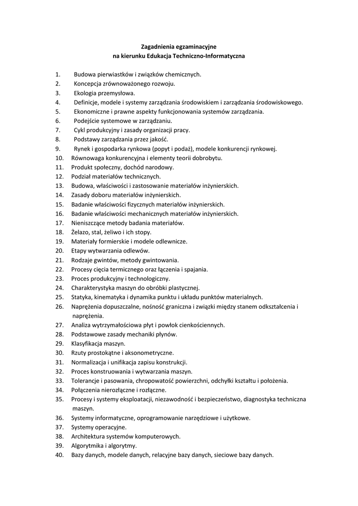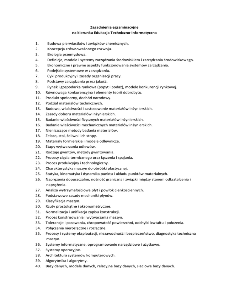 Zagadnienia egzaminacyjne na kierunku Edukacja Techniczno-Informatyczna 1. 2. 3. 4. 5. 6. 7. 8. 9. 10. 11. 12. 13. 14. 15. 16. 17. 18. 19. 20. 21. 22. 23. 24. 25. 26. 27. 28. 29. 30. 31. 32. 33. 34. 35. 36. 37. 38. 39. 40. Budowa pierwiastków i związków chemicznych. Koncepcja zrównoważonego rozwoju. Ekologia przemysłowa. Definicje, modele i systemy zarządzania środowiskiem i zarządzania środowiskowego. Ekonomiczne i prawne aspekty funkcjonowania systemów zarządzania. Podejście systemowe w zarządzaniu. Cykl produkcyjny i zasady organizacji pracy. Podstawy zarządzania przez jakość. Rynek i gospodarka rynkowa (popyt i podaż), modele konkurencji rynkowej. Równowaga konkurencyjna i elementy teorii dobrobytu. Produkt społeczny, dochód narodowy. Podział materiałów technicznych. Budowa, właściwości i zastosowanie materiałów inżynierskich. Zasady doboru materiałów inżynierskich. Badanie właściwości fizycznych materiałów inżynierskich. Badanie właściwości mechanicznych materiałów inżynierskich. Nieniszczące metody badania materiałów. Żelazo, stal, żeliwo i ich stopy. Materiały formierskie i modele odlewnicze. Etapy wytwarzania odlewów. Rodzaje gwintów, metody gwintowania. Procesy cięcia termicznego oraz łączenia i spajania. Proces produkcyjny i technologiczny. Charakterystyka maszyn do obróbki plastycznej. Statyka, kinematyka i dynamika punktu i układu punktów materialnych. Naprężenia dopuszczalne, nośność graniczna i związki między stanem odkształcenia i naprężenia. Analiza wytrzymałościowa płyt i powłok cienkościennych. Podstawowe zasady mechaniki płynów. Klasyfikacja maszyn. Rzuty prostokątne i aksonometryczne. Normalizacja i unifikacja zapisu konstrukcji. Proces konstruowania i wytwarzania maszyn. Tolerancje i pasowania, chropowatość powierzchni, odchyłki kształtu i położenia. Połączenia nierozłączne i rozłączne. Procesy i systemy eksploatacji, niezawodność i bezpieczeństwo, diagnostyka techniczna maszyn. Systemy informatyczne, oprogramowanie narzędziowe i użytkowe. Systemy operacyjne. Architektura systemów komputerowych. Algorytmika i algorytmy. Bazy danych, modele danych, relacyjne bazy danych, sieciowe bazy danych. 41. 42. 43. 44. 45. 46. 47. 48. 49. 50. 51. 52. 53. 54. 55. 56. 57. 58. 59. 60. 61. 62. 63. 64. 65. 66. 67. 68. 69. 70. 71. 72. Programowanie proceduralne i obiektowe. Język programowania: składnia języka i struktura programu. Grafika komputerowa: grafika wektorowa i rastrowa, formaty plików graficznych, transformacje, oprogramowanie użytkowe (edytory graficzne), kompresja, barwa w grafice komputerowej. Urządzenia systemu multimedialnego: monitory, drukarki, karty graficzne, telewizyjne, frame grabber, skanery, kamery, aparaty cyfrowe, karty dźwiękowe – budowa i działanie. Prezentacje multimedialne: zasady projektowania i oprogramowanie. Sieci komputerowe: klasyfikacje, architektura, protokoły. Tworzenie stron WWW. Bezpieczeństwo i ochrona zasobów sieci komputerowych. Systemy zdalnego nauczania z wykorzystaniem sieci komputerowych. Systemy komputerowego wspomagania: projektowania, wytwarzania i projektowania materiałowego Sztuczna inteligencja. Metody reprezentacji wiedzy i mechanizmy wnioskowania. Sztuczne sieci neuronowe i algorytmy gentyczne. Systemy ekspertowe. Metody pozyskiwania wiedzy. Obwody elektryczne prądu stałego i przemiennego. Moc i energia w obwodach jednofazowych i trójfazowych. Maszyny elektryczne i transformatory. Arytmetyka cyfrowa i funkcje logiczne. Przedmiot, stanowienia i formułowanie celów dydaktycznych (taksonomia celów, operacjonalizacja celów). Strategia kształcenia wielostronnego, struktura i ogniwa procesu nauczania-uczenia się. Typy i rodzaje zadań technicznych i ich rola w procesie kształcenia techniki i informatyki. Kontrola w procesie dydaktycznym – przedmiot i dziedziny kontroli, funkcje, formy i metody kontroli. Pomiar osiągnięć szkolnych, ocena jej właściwości dydaktycznych. Skala ocen i jej interpretacja. Nowoczesne techniki nauczania wspomagane cyfrowymi mediami. Klasyfikacja czynników niebezpiecznych, szkodliwych i uciążliwych w środowisku pracy. Zarządzanie warunkami pracy. Zadania fizjologii pracy. Antropometria w kształtowaniu warunków pracy Podstawowe mierniki zmęczenia psychicznego i fizycznego. Pojęcie materialnego środowiska pracy. Metody ocen ergonomicznych. Zadania służb bhp. Prawna ochrona pracy.