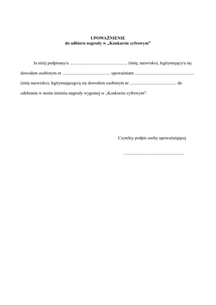 UPOWAŻNIENIE do odbioru nagrody w „Konkursie cyfrowym” Ja niżej podpisany/a ..................................................... (imię, nazwisko), legitymujący/a się dowodem osobistym nr ............................................ upoważniam ....................................................... (imię nazwisko), legitymującego/ą się dowodem osobistym nr ........................................... do odebrania w moim imieniu nagrody wygranej w „Konkursie cyfrowym”. Czytelny podpis osoby upoważniającej ........................................................