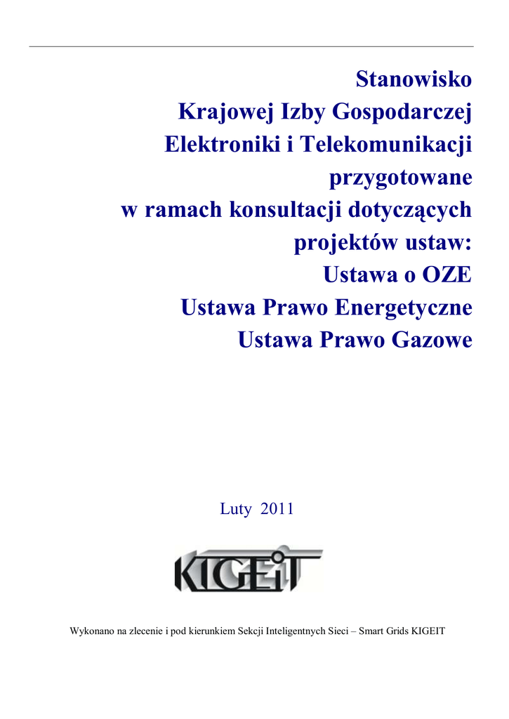 Stanowisko Krajowej Izby Gospodarczej Elektroniki i Telekomunikacji przygotowane w ramach konsultacji dotyczących projektów ustaw: Ustawa o OZE Ustawa Prawo Energetyczne Ustawa Prawo Gazowe Luty 2011 Wykonano na zlecenie i pod kierunkiem Sekcji Inteligentnych Sieci – Smart Grids KIGEIT Spis treści Spis treści 1 Podsumowanie .................................................................................................................... 5 2 Założenia i prognozy strategiczne...................................................................................... 7 3 Koszty całkowite energii z OZE....................................................................................... 10 3.1 Magazyny energii ................................................................................................................. 11 3.2 Domowa instalacja wiatrowa ................................................................................................ 12 3.3 Domowa instalacja fotowoltaiczna ....................................................................................... 12 3.4 Instalacje hybrydowe ............................................................................................................ 13 3.5 Źródła CHP .......................................................................................................................... 13 3.6 Motoryzacja elektryczna ....................................................................................................... 13 3.7 Znaczenie technologii OZE i mikroinstalacji dla polskiego przemysłu ICT........................... 13 3.8 Oczekiwania infrastrukturalne .............................................................................................. 14 4 Poprawki i uzupełnienia do projektu ustawy o OZE ...................................................... 15 5 Poprawki i uzupełnienia do ustawy Prawo energetyczne ............................................... 18 3 Przedmowa Przedmowa 22 maja 20011 roku przy Krajowej Izbie Gospodarczej Elektroniki i Telekomunikacji (KIGEiT) powstała Sekcja Inteligentnych Sieci – „Smart Grid” (SIS-SG). Niniejsze opracowanie stanowi syntezę podglądów podmiotów zrzeszonych w SIS-SG. Podmioty te zatrudniają łącznie ponad 14 tys. pracowników i mają obroty przekraczające 7,6 mld zł rocznie. Pismami KIGEiT 876/07/2011 z dnia 13.07.2011, KIGEiT 42/01/2012 z dnia 12.12.2012 oraz KIGEiT 67/01/2012 z dnia 18.01.2012 zgłosiliśmy nasze zainteresowanie uczestnictwem w procesie konsultacji społecznych we wszelkich sprawach związanych z strategią rozwoju rynku energii. Podstawą prawną jest treść art. 4 ustawy o izbach gospodarczych z dnia 30 maja 1989 roku (tekst jednolity Dz. U. z 2009 r. Nr 84 poz. 710). Ostateczny kształt aktów prawnych dotyczących odnawialnych źródeł energii, prawa energetycznego i gazowego wpłynie istotnie na rozwój polskiego przemysłu ICT, którego znaczenie i wielkość jest faktem mało znanym administracji centralnej. W związku z tym informujemy, że przedsiębiorstwa ICT: mają moce produkcyjne w zakresie OZE o potencjale ok. 1GW rocznie w samych panelach fotowoltaicznych, dysponują technologią i sprzętem do modernizacji technicznej sieci energetycznych, są zainteresowane świadczeniem usług telematycznych dla sektora energetycznego oraz konsumentów energii, eksportują wyroby za ponad 30 mld euro, a polski przemysł elektroniczny ma dodatni wynik w bilansie handlu zagranicznego Nasze cele strategiczne związane z transformację technologiczną energetyki to: zachowanie dodatniego bilansu w handlu wyrobami elektronicznymi poprzez stworzenie warunków do rozwoju produkcji i eksportu wyrobów elektroniki energetycznej i odnawialnych źródeł energii, stworzenie warunków funkcjonowania energetyki i przedsiębiorstw ICT, w ramach których transformacja energetyki będzie stanowiła lokomotywę pobudzającą rozwój całej gospodarki, a nie stanie się problemem narodowym związanym z kosztami implementacji dyrektyw energetycznych i wymogów środowiskowych. Cele te można osiągnąć poprzez: stworzenie warunków motywujących (biznesowo) przedsiębiorstwa sieciowe do modernizacji systemów przesyłu i dystrybucji energii poprzez pełną implementację rozwiązań ICT (budowa warstwy teleinformatycznej Smart Grids w oparciu o potencjał produkcyjny i intelektualny polskiego przemysłu ICT), szybkie otworzenie rynku zbytu dla mikroinstalacji energetycznych poprzez zniesienie ograniczeń w zakresie instalacji i stworzenie warunków prawnych sprzyjających inwestycjom w dwukierunkowe inteligentne sieci energetyczne (Smart Grids), uniezależnienie rynku pomiarów od rynku dystrybucji, sprzedaży i produkcji energii jako rozwiązania koniecznego dla likwidacji konfliktu interesów pomiędzy imperatywem oszczędzania energii i biznesu polegającego w swej istocie na produkcji i sprzedaży energii, koncentrację środków przeznaczonych na wzrost innowacyjności na projektach uruchomienia produkcji elektroniki energetycznej, urządzeń automatyki przemysłowej dla dwukierunkowych sieci Smart Grids, odnawialnych źródeł energii, oprogramowania systemowego i wyrobów podnoszących efektywność energetyczną systemów i instalacji odbiorców energii. Zwracamy uwagę, że warunkiem utrzymania tempa rozwoju gospodarczego Polski jest zachowanie konkurencyjności gospodarki poprzez utrzymanie konkurencyjności w produkcji energii. Modernizacja energetyki systemowej i realizacja programu jądrowego związana będzie głównie z importem, natomiast w zakresie energetyki rozproszonej/rozsianej opartej na OZE możemy stać się centrum produkcyjnym Europy. 4 Podsumowanie 1 Podsumowanie W ramach konsultacji społecznych i środowiskowych dotyczących pakietu projektów trzech ustaw (ustawy o OZE, Prawa Energetycznego i Prawa Gazowego) KIGEiT zgłasza propozycje zmian do projektów ustaw z uzasadnionym przekonaniem, że powinny: 1) prowadzić do p