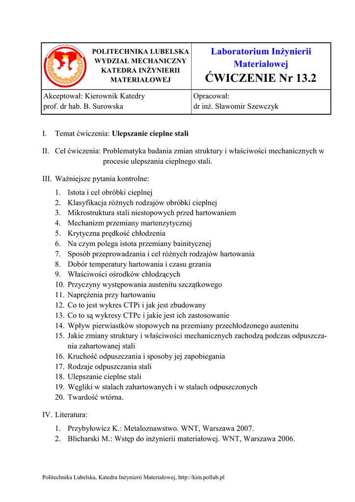 POLITECHNIKA LUBELSKA WYDZIAŁ MECHANICZNY KATEDRA INŻYNIERII MATERIAŁOWEJ Akceptował: Kierownik Katedry prof. dr hab. B. Surowska I. Laboratorium Inżynierii Materiałowej ĆWICZENIE Nr 13.2 Opracował: dr inż. Sławomir Szewczyk Temat ćwiczenia: Ulepszanie cieplne stali II. Cel ćwiczenia: Problematyka badania zmian struktury i właściwości mechanicznych w procesie ulepszania cieplnego stali. III. Ważniejsze pytania kontrolne: 1. 2. 3. 4. 5. 6. 7. 8. 9. 10. 11. 12. 13. 14. 15. 16. 17. 18. 19. 20. Istota i cel obróbki cieplnej Klasyfikacja różnych rodzajów obróbki cieplnej Mikrostruktura stali niestopowych przed hartowaniem Mechanizm przemiany martenzytycznej Krytyczna prędkość chłodzenia Na czym polega istota przemiany bainitycznej Sposób przeprowadzania i cel różnych rodzajów hartowania Dobór temperatury hartowania i czasu grzania Właściwości ośrodków chłodzących Przyczyny występowania austenitu szczątkowego Naprężenia przy hartowaniu Co to jest wykres CTPi i jak jest zbudowany Co to są wykresy CTPc i jakie jest ich zastosowanie Wpływ pierwiastków stopowych na przemiany przechłodzonego austenitu Jakie zmiany struktury i właściwości mechanicznych zachodzą podczas odpuszczania zahartowanej stali Kruchość odpuszczania i sposoby jej zapobiegania Rodzaje odpuszczania stali Ulepszanie cieplne stali Węgliki w stalach zahartowanych i w stalach odpuszczonych Twardość wtórna. IV. Literatura: 1. Przybyłowicz K.: Metaloznawstwo. WNT, Warszawa 2007. 2. Blicharski M.: Wstęp do inżynierii materiałowej. WNT, Warszawa 2006. Politechnika Lubelska, Katedra Inżynierii Materiałowej, http://kim.pollub.pl 3. Praca zbior. pod red. A. Werońskiego: Ćwiczenia laboratoryjne z inżynierii materiałowej. Wyd. Politechniki Lubelskiej, Lublin 2002. 4. Dobrzański L. A.: Podstawy kształtowania struktury i własności materiałów metalowych. Wyd. Politechniki Śląskiej, Gliwice 2007. 5. Blicharski M.: Inżynieria materiałowa, stal. WNT, Warszawa 2004. 6. Praca zbior. pod red. W. Lutego: Poradnik inżyniera. Obróbka cieplna stopów żelaza. WNT, Warszawa 1977. V. Przebieg ćwiczenia: 1. Materiały i urządzenia do badań 1.1. Próbki stalowe o wymiarach φ30x10 mm w ilości 2 sztuk wykonane ze stali w gatunku: C45, C55, C80U, C105U, 100Cr6, 28Mn6, 34Cr4, 41Cr4, 42CrMo4, 36CrNiMo4, 56Si7 lub inne wg wskazań prowadzącego 1.2. Piec elektryczny komorowy typu LAC-PK10 do hartowania i 2 piece do odpuszczania – piece należy wstępnie nagrzać przed ćwiczeniami 1.3. Twardościomierz Brinella i Rockwella 1.4. Wanny hartownicze z wodą i olejem 1.5. Rękawice hartownicze, kleszcze kowalskie, fartuch ochronny 1.6. Szlifierka stołowa, papiery ścierne 1.7. Karty materiałowe lub normy, kserokopie wykresów CTPc lub CTPi dla obrabianych gatunków stali. 2. Przebieg badań Przed rozpoczęciem ćwiczenia student obowiązkowo zapoznaje się z zaleceniami instrukcji BHP. Prowadzący zajęcia sprawdza opanowanie wiadomości podanych w instrukcji BHP i znajomość problematyki badawczej. Po dopuszczeniu do wykonania ćwiczenia należy wykonać następujące czynności: 2.1. Pobrać od prowadzącego zajęcia próbki do badań 2.2. Określić temperaturę hartowania badanych próbek w oparciu o wykres Fe-Fe3C i porównać z temperaturą zalecaną w kartach materiałowych lub normach, przeanalizować ewentualne różnice 2.3. Podgrzać piec do wymaganej temperatury hartowania 2.4. Obliczyć czas grzania próbek w zależności od ich wymiarów (dla stosowanych pieców laboratoryjnych przyjmujemy 2 do 2,5 minut czasu grzania na 1 mm grubości przekroju) 2.5. Zbadać twardość próbek przed hartowaniem 2.6. Nagrzać próbki w piecu do hartowania. Następnie obie próbki, w zależności od obrabianego gatunku stali oziębić w oleju lub w wodzie Uwaga: a) przy obsłudze pieców używać sprzęt ochrony osobistej: fartuch ochronny, rękawice hartownicze, kleszcze kowalskie © Copyright by S. Szewczyk, Lublin University of Technology, 2016 2 b) podczas ładowania i wyjmowania próbek z pieca elektrycznego należy chwilowo wyłączyć dopływ prądu – nie dotyczy to pieców, które posiadają wyłącznik drzwiowy c) po zanurzeniu próbki w ośrodku chłodzącym (olej, woda) należy przez około 60 ÷ 90 sekund poruszać próbkę tak, aby przez cały czas stykała się z nienagrzaną warstwą cieczy chłodzącej 2.7. Przeszlifować obie powierzchnie próbek na szlifierce stołowej (wykonywać w okularach ochronnych) oraz na papierach ściernych, a następnie oznaczyć w sposób trwały 2.8. Zbadać twardość próbek po hartowaniu – wykonać trzy pomiary dla każdej próbki i obliczyć wartość średnią 2.9. Na wykresie CTPc lub CTPi dla obrabianego gatunku stali, nanieść krzywe prędkości chłodzenia dla zastosowanych ośrodków chłodzących oraz podać nazwy otrzymanych struktur. 2.10. Jedną z próbek zahartowanych w oleju (lub w wodzie) odpuścić w temperaturze 200°C, a drugą w temperaturze 600°C, czas grzania 1 godzina 2.11. Zbadać twardość próbek po odpuszczaniu. 3. Opracowanie sprawozdania Sprawozdanie z przeprowadzonych badań powinno zawierać: 3.1. Cel badań, przedmiot badań, spis literatury 3.2. Uzasadnienie doboru temperatury hartowania oraz obliczenie czasu grzania 3.3. Uzasadnienie doboru temperatury odpuszczania 3.4. Wykreślne przedstawienie w układzie temperatura – czas, przeprowadzonych zabiegów obróbki cieplnej 3.5. Wykres CTPc lub CTPi z naniesionymi krzywymi prędkości chłodzenia dla zastosowanych ośrodków chłodzących 3.6. Tabelaryczne zestawienie wyników pomiarów twardości (HBW, HRC, HV) wszystkich próbek z podaniem nazwy otrzymanych struktur 3.7. Wykres zmian twardości badanych próbek w funkcji temperatury odpuszczania 3.8. Wnioski dotyczące wpływu ulepszania cieplnego na strukturę i właściwości badanego gatunku stali. 4. Materiały uzupełniające 4.1. Karty materiałowe badanych gatunków stali © Copyright by S. S