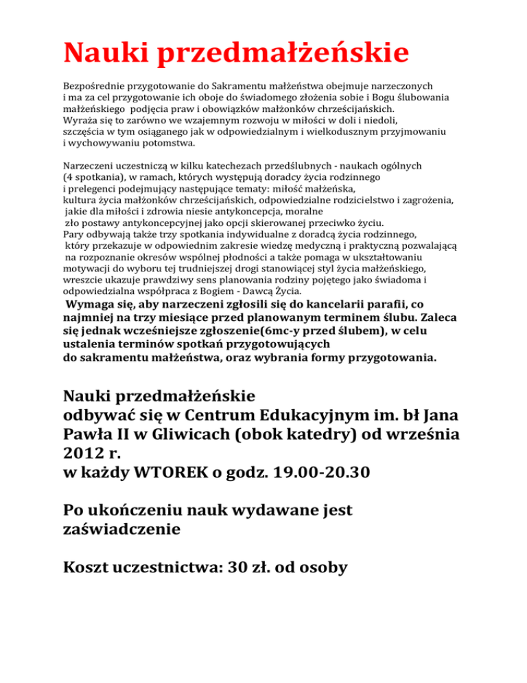 Nauki przedmałżeńskie Bezpośrednie przygotowanie do Sakramentu małżeństwa obejmuje narzeczonych i ma za cel przygotowanie ich oboje do świadomego złożenia sobie i Bogu ślubowania małżeńskiego podjęcia praw i obowiązków małżonków chrześcijańskich. Wyraża się to zarówno we wzajemnym rozwoju w miłości w doli i niedoli, szczęścia w tym osiąganego jak w odpowiedzialnym i wielkodusznym przyjmowaniu i wychowywaniu potomstwa. Narzeczeni uczestniczą w kilku katechezach przedślubnych - naukach ogólnych (4 spotkania), w ramach, których występują doradcy życia rodzinnego i prelegenci podejmujący następujące tematy: miłość małżeńska, kultura życia małżonków chrześcijańskich, odpowiedzialne rodzicielstwo i zagrożenia, jakie dla miłości i zdrowia niesie antykoncepcja, moralne zło postawy antykoncepcyjnej jako opcji skierowanej przeciwko życiu. Pary odbywają także trzy spotkania indywidualne z doradcą życia rodzinnego, który przekazuje w odpowiednim zakresie wiedzę medyczną i praktyczną pozwalającą na rozpoznanie okresów wspólnej płodności a także pomaga w ukształtowaniu motywacji do wyboru tej trudniejszej drogi stanowiącej styl życia małżeńskiego, wreszcie ukazuje prawdziwy sens planowania rodziny pojętego jako świadoma i odpowiedzialna współpraca z Bogiem - Dawcą Życia. Wymaga się, aby narzeczeni zgłosili się do kancelarii parafii, co najmniej na trzy miesiące przed planowanym terminem ślubu. Zaleca się jednak wcześniejsze zgłoszenie(6mc-y przed ślubem), w celu ustalenia terminów spotkań przygotowujących do sakramentu małżeństwa, oraz wybrania formy przygotowania. Nauki przedmałżeńskie odbywać się w Centrum Edukacyjnym im. bł Jana Pawła II w Gliwicach (obok katedry) od września 2012 r. w każdy WTOREK o godz. 19.00-20.30 Po ukończeniu nauk wydawane jest zaświadczenie Koszt uczestnictwa: 30 zł. od osoby