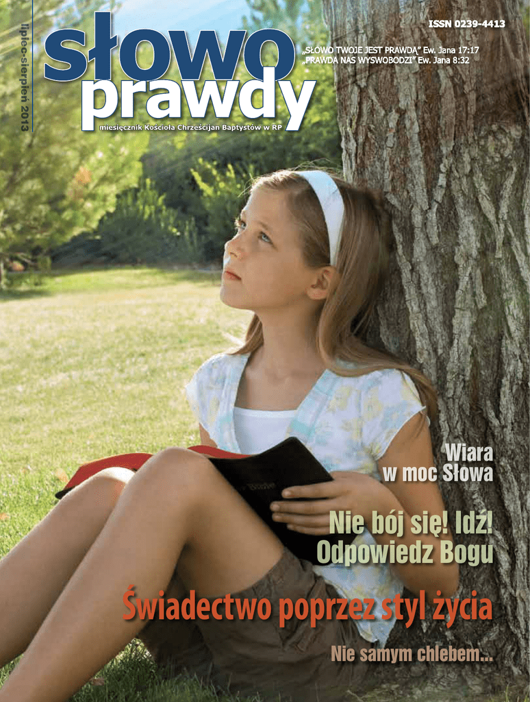 lipiec-sierpień 2013 Wiara w moc Słowa Nie bój się! Idź! Odpowiedz Bogu Świadectwo poprzez styl życia Nie samym chlebem... Spis treści: s. 3 Wiara w moc Słowa – Włodek Tasak s. 5 Wielkanocne śniadanie – Mikołaj Rykowski s. 6 Chrzest Wiary. Katowice s. 7 Zakończenie roku akademickiego 2012/2013 w WBST w Warszawie s. 8 Chrzest w Warszawie – Eugeniusz Kondraciuk s. 10 Trzy przekłady Nowego Testamentu – Konstanty Wiazowski s. 13 Nie bój się! Idź! Odpowiedz Bogu! – Mateusz Wichary s. 16 Świadectwo poprzez styl życia – Ryszard Tyśnicki s. 18 Wiara, nadzieja i miłość – sposoby niesienia pomocy homoseksualistom – Konstanty Wiazowski s. 22 Jest mnóstwo dróg, które prowadzą na zatracenie – Agata Kołaczyk s. 23 Chrzest we Wrocławiu – Ryszard Tyśnicki s. 24 Minikonferencja Kobiet – Iwona Willma s. 26 Filozofujący chrześcijanie – Janusz Kucharczyk s. 28 Nie samym chlebem… – Alina Woźniak s. 30 Inspirujące symbole – Aneta Krzywicka s. 32 Cudzołożnica – Beata Jaskuła-Tuchanowska s. 33 Chrześcijanie, którzy zmienili świat (1) – Glenn Sunshine s. 35 Dla dzieci – Nela i Zbyszek Kłapa s. 31 Wiadomości z kancelarii Kościoła – Dawid Breuer s. 33 Wiadomości ze świata – Konstanty Wiazowski MIESIĘCZNIK SŁOWO PRAWDY - ORGAN PRASOWY KOŚCIOŁA CHRZEŚCIJAN BAPTYSTÓW W RP Ukazuje się od 1925 r. Rocznik LXXXVIII: 2013 r. Nr 7-8 (lipiec-sierpień) • ISSN 0239-4413 KOLEGIUM REDAKCYJNE: Mateusz Wichary (Redaktor Naczelny), Dawid Breuer, Aneta Krzywicka, Paweł Krzywicki, Danuta Marcyniak, Agnieszka Nadolna, Ryszard Tyśnicki, Konstanty Wiazowski. Adres redakcji i administracji: ul. Waliców 25, 00-865 Warszawa, tel./fax: 022 624 27 83 e-mail: [email protected], www.dlajezusa.pl (dział Materiały) Kontakt w sprawach reklamy: [email protected] Ofiary za pismo prosimy kierować na konto Kościoła Chrześcijan Baptystów: ING Bank Śląski 20105010541000002317496905. Materiałów nie zamawianych Redakcja nie zwraca i zastrzega sobie prawo dokonywania zmian w treści i w tytule nadesłanych tekstów. Redakcja nie odpowiada za treść ogłoszeń. SKŁAD I OPRACOWANIE GRAFICZNE: Aneta i Paweł Krzywiccy (Projekt okładki z wykorzystaniem fotografii z kolekcji Fotolia) DRUK I OPRAWA: KOMPAS II, Waliców 25, Warszawa Numer zamknięto: 09 sierpnia 2013 r. KAZANIE OD REDAKCJI Słowo, Boży plan i nasza misja Bóg ma plan. Te słowa są tak oklepane, że rzadko kiedy jeszcze myślimy nad ich sensem. Zazwyczaj mówiąc je mamy na myśli Boże oczekiwania: Bóg oczekuje od grzeszników, że się nawrócą. Pogodzą z Nim. Dlatego umarł Chrystus. Dlatego Ewangelia jest głoszona. Bóg ma więc pewien plan: coś zrobił, aby coś innego mogło zaistnieć. Czy jednak takie wyłącznie ewangelizacyjne podejście wyczerpuje Boży plan? Nie sądzę. Wtedy jedynym, na co Bóg ma plan, byłoby nawrócenie grzeszników. A co dalej? Co z tego nawrócenia ma wynikać? Cokolwiek? Nie ma to większego znaczenia? No nie. Bóg ma plan znacznie szerszy. Fakt, nawrócenie jest jego częścią. Ale ani nie jest najważniejszą, ani ostatnią. Jest częścią konieczną, fakt. Ale Bóg ma dla nas plan na całe życie. W Efezjan 1:4 czytamy, że wybrał nas (zaplanował nas), abyśmy byli święci i nienaganni przed Jego obliczem. Oto Boży plan, dla którego nawrócenie jest jedynie środkiem. To świętość i nienaganność w Jego obecności! To plan nie tylko na doczesność, ale i wieczność. Cóż więc, jako święci i nienaganni mamy robić? Mamy być Jemu posłuszni. A Jego wolą jest obecnie wprowadzanie zmian w otaczającym nas świecie. Mamy być inni, aby ową inność mnożyć. Królestwo Boże to sprawiedliwość, pokój i radość w Duchu Świętym. Tam, gdzie wkracza Bóg, wkracza Jego przemiana. A my w tym Bożym planie mamy uczestniczyć. Stąd potrzeba znajomości Jego woli i posłuszeństwa, wierności temu, czego od nas oczekuje. I stąd również główna myśl tego numeru: Słowo i misja. Słowo i rozwój Kościoła. Jak one się łączą? Jak być świętym, ale nie dla siebie, ale dla Boga, by wywierać właściwy wpływ? O tym zarówno w kazaniu brata Tasaka, zachęcającym do ufności i posłuszeństwa Słowu, rozważaniu brata Tyśnickiego o zapominanej czasem roli świadectwa, w rozważaniu o duchowej diecie siostry Woźniak i podobnym, o symbolach, siostry Krzywickiej. O Słowie i jego znaczeniu również w artykule o trzech współczesnych przekładach Nowego Testamentu, oraz w rozważaniu jak ono wpływa na rozwiązanie konkretnego współczesnego problemu – homoseksualizmu. Natomiast moje rozważanie zachęca do właściwej postawy, aby być użytym i użytecznym dla Boga. O mocy Słowa przekonują liczne świadectwa. Przede wszystkim ze zborowych chrztów – w Katowicach, Warszawie i Wrocławiu. Ale również z zakończenia roku akademickiego w WBST, które zakończyło się wyjątkowo dużą ilością obronionych licencjatów, co bardzo zachęca. Dodatkowo świadectwo z historii – tym razem wiek XIX i romantyzm; świadectwo wielkanocne z Katowic i konferencji kobiet z Torunia oraz wiadomości ze świata i wiadomości z działania Przewodniczącego Kościoła, który miał zaszczyt odwiedzić wiele wspaniałych miejsc w Polsce, potwierdzają prawdziwość słów Pana Jezusa: patrzcie, jestem z Wami – gdy idziecie i czynicie uczniami wszystkie narody – po wszystkie dni, aż do skończenia świata. Jest. Możemy oglądać jego wspaniałe działanie. Niech będzie Mu za to chwała! Drogi Panie, który nas nie zostawiasz, ale jesteś pośród nas; który zostawiłeś nam swoje pełne mocy Słowo; który czuwasz nad swoim planem i realizujesz go poprzez tak potężne procesy dziejowe jak i małe szczegóły naszego życia; który żyjesz i królujesz na wieki wieków, daj nam, w miłości Twego Ojca i mocy Twego Ducha, łaskę trwania przy Tobie, bycia użytecznym i oglądania chwały Twego działania pośród nas, i b