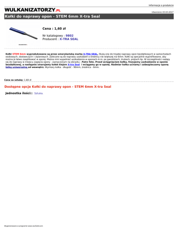 Informacje o produkcie Utworzono 03-03-2017 Kołki do naprawy opon - STEM 6mm X-tra Seal Cena : 1,60 zł Nr katalogowy : 9802 Producent : X-TRA SEAL Kołki STEM 6mm wyprodukowane są przez amerykańską markę X-TRA SEAL, Służą one do trwałej naprawy opon bezdętkowych w samochodach osobowych, dostawczych i ciężarowych. Zalecane są do naprawy uszkodzeń o średnicy nie większej niż 6mm. Kołki są specjalnie wyprofilowane, aby można je łatwo zaaplikować w oponę. Można nimi wypełniać uszkodzenia w oponach m.in. po gwożdziach, śrubach, prętach itp. W szczególności nadają się do naprawy w miejscu zagięcia opony - zaznaczonym na obrazku - Patrz foto. Przed wciągnięciem kołka, frezujemy uszkodzenie w oponie bezdętkowej, a następnie smarujemy kołek klejem X-tra Seal i wciągamy go w oponę. Nadmiar kołka ucinamy i zabezpieczamy oponę łatką uniwersalną od wewnątrz. Wymiary kołka : długość - 90mm, średnica - 6mm. Cena za sztukę: 1.60 zł Dostępne opcje Kołki do naprawy opon - STEM 6mm X-tra Seal Jednostka ilości:: Sztuka. Wygenerowano w programie www.oscGold.com