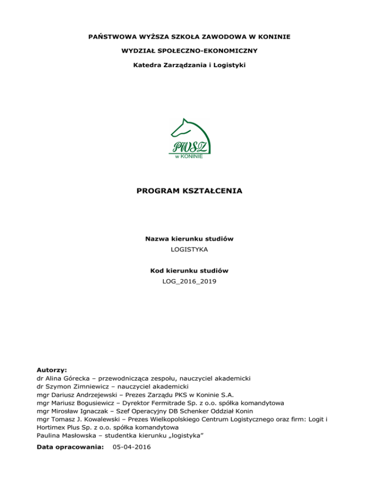 PAŃSTWOWA WYŻSZA SZKOŁA ZAWODOWA W KONINIE WYDZIAŁ SPOŁECZNO-EKONOMICZNY Katedra Zarządzania i Logistyki PROGRAM KSZTAŁCENIA Nazwa kierunku studiów LOGISTYKA Kod kierunku studiów LOG_2016_2019 Autorzy: dr Alina Górecka – przewodnicząca zespołu, nauczyciel akademicki dr Szymon Zimniewicz – nauczyciel akademicki mgr Dariusz Andrzejewski – Prezes Zarządu PKS w Koninie S.A. mgr Mariusz Bogusiewicz – Dyrektor Fermitrade Sp. z o.o. spółka komandytowa mgr Mirosław Ignaczak – Szef Operacyjny DB Schenker Oddział Konin mgr Tomasz J. Kowalewski – Prezes Wielkopolskiego Centrum Logistycznego oraz firm: Logit i Hortimex Plus Sp. z o.o. spółka komandytowa Paulina Masłowska – studentka kierunku „logistyka” Data opracowania: 05-04-2016 1. Ogólna charakterystyka kierunku studiów 1.1. Podstawowe informacje Poziom kształcenia Profil kształcenia Forma studiów Liczba semestrów Tytuł zawodowy uzyskiwany przez absolwenta Obszar kształcenia Dziedzina nauki Dyscyplina naukowa studia pierwszego stopnia praktyczny stacjonarne (SS) i niestacjonarne (SN) 6 licencjat nauki społeczne nauki ekonomiczne, nauki społeczne, nauki prawne ekonomia (dyscyplina wiodąca), finanse, nauki o zarządzaniu, towaroznawstwo, nauki o bezpieczeństwie, nauki o obronności, psychologia, socjologia, prawo 1.2. Koncepcja kształcenia Studia pierwszego stopnia o profilu praktycznym na kierunku „logistyka” prowadzi Katedra Zarządzania i Logistyki (KZL) PWSZ w Koninie. W Polsce istnieje wyraźna potrzeba kształcenia na poziomie studiów wyższych osób wszechstronnie przygotowanych do odpowiedniego i zarazem skutecznego zarządzania procesami logistycznymi zachodzącymi w gospodarce, czyli procesami planowania, sterowania, realizowania i kontroli przestrzenno-czasowego przemieszczania określonych zasobów (towarów, usług, informacji). Wiedza, umiejętności i kompetencje osób z wykształceniem wyższym w zakresie logistyki są szczególnie ważne w czasach ciągłych zmian, niepewności i ogromnej konkurencji. W praktyce przedsiębiorstw charakterystyczne jest stosowanie logistyki na coraz większą skalę oraz z coraz większymi efektami w zarządzaniu całym przedsiębiorstwie. Dotyczy to nie tylko dużych przedsiębiorstw, ale także w coraz większym stopniu małych i średnich przedsiębiorstw. Z dnia na dzień rośnie potrzeba systemowego traktowania i kształtowania funkcji procesów i instrumentów logistycznych. Wprowadzenie logistyki do przedsiębiorstw, choć praktycznie jest już ona w prawie w każdym z nich, oznacza nie tylko przyjęcie nowych rozwiązań technologiczno-organizacyjnych, ale również umożliwienie unowocześnienia i usprawnienia przepływu dóbr i procesów informacyjnych. W zależności od realizacji faz przepływu zasobów wyróżnia się następujące podsystemy logistyki: • podsystem logistyczny w sferze zaopatrzenia (przepływ surowców, materiałów, części zamiennych od dostawców do magazynów zaopatrzeniowych i przyjęcia w przedsiębiorstwie, aż po bezpośrednią dostawę do procesu produkcji), • podsystem logistyczny w sferze produkcji (przepływ surowców, materiałów, części zamiennych, półfabrykatów i wyrobów gotowych pomiędzy magazynami zaopatrzeniowymi i magazynami wyrobów gotowych), • podsystem logistyczny w sferze dystrybucji (przepływ wyrobów gotowych między magazynami zbytu i klientami na rynku zbytu, jak również bezpośrednio z produkcji do finalnych odbiorców). Możliwości zatrudnienia dla absolwenta studiów na kierunku „logistyka” są niezwykle szerokie. Może on podjąć pracę zarówno w centrach logistycznych oraz firmach spedycyjnych i transportowych, jak również w każdym przedsiębiorstwie i instytucji, w której występuje konieczność optymalizacji gospodarowania (wykorzystywania zasobów, ich zabezpieczania i przechowywania). Do jego zadań będzie bowiem należało m.in. planowanie, organizowanie, kierowanie i kontrola przemieszczania się określonych zasobów (towarów, usług, informacji) od producenta (hurtownika, sprzedawcy, usługodawcy) do klienta (przedsiębiorcy, konsumenta) z wykorzystaniem informacji płynących z rynku w celu optymalizacji korzyści wynikających z wymiany dla wszystkich jej uczestników. Absolwent kierunku studiów „logistyka” może więc podjąć pracę na następujących stanowiskach: • specjalista ds. organizacji i planowania produkcji, • specjalista ds. zaopatrzenia, transportu i magazynowania, • specjalista do spraw doskonalenia organizacji, • specjalista do spraw organizacji i rozwoju przemysłu, • specjalista do spraw organizacji i rozwoju transportu, • specjalista transportu wewnętrznego i magazynowania, • specjalista do spraw marketingu i handlu, • specjalista do spraw logistyki. Ogólne cele kształcenia na kierunku „logistyka”: • uzyskanie kompleksowej wiedzy z zakresu nauk ekonomicznych oraz kształtowanie krytycznego rozumienia podstaw teoretycznych wiedzy o zjawiskach i procesach logistycznych, • kształcenie umiejętności planowania, formułowania, identyfikowania i rozwiązywania zadań, w tym o charakterze praktycznym (zawodowym), 2 • • • • doskonalenie umiejętności komunikowania się z uczestnikami procesu pracy, prowadzenia negocjacji, podejmowania decyzji, korzystania z różnych źródeł informacji do wykonywania zadań zawodowych, przygotowanie absolwentów do rozwoju kariery zawodowej zarówno w dużych organizacjach o zasięgu międzynarodowym, jak i w małych i średnich przedsiębiorstwach, wykorzystujących umiejętności analitycznego myślenia i kreowania sprawnego przepływu materiałów, towarów i usług, kształtowanie wrażliwości etycznej i społecznej, otwartości na racje innych, zaangażowania i poczucia odpowiedzialności w środowisku pracy i poza nim, uświadomienie idei samokształcenia oraz rozwinięcie umiejętności uczenia się przez całe życie oraz potrzeby rozwoju osobi