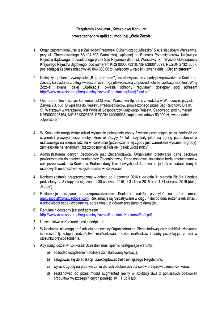 Regulamin konkursu „Kwasolowy Konkurs” prowadzonego w aplikacji mobilnej „Wolę Zozole” 1. Organizatorem konkursu jest Zakładów Przemysłu Cukierniczego „Mieszko” S.A. z siedzibą w Warszawie, przy ul. Chrzanowskiego 8B (04-392 Warszawa), wpisanej do Rejestru Przedsiębiorców Krajowego Rejestru Sądowego, prowadzonego przez Sąd Rejonowy dla m.st. Warszawy, XIII Wydział Gospodarczy Krajowego Rejestru Sądowego, pod numerem KRS 0000073310, NIP 6390010391, REGON 273243857, posiadającej kapitał zakładowy 40 866 000,00 zł (wpłacony w całości), zwana dalej „Organizatorem”. 2. Niniejszy regulamin, zwany dalej „Regulaminem”, określa wyłącznie zasady przeprowadzenia Konkursu. Zasady korzystania z usług świadczonych drogą elektroniczną za pośrednictwem aplikacji mobilnej „Wolę Zozole”, zwanej dalej „Aplikacją” określa odrębny regulamin dostępny pod adresem http://www.maxusshare.pl/regulaminy/zozole/RegulaminaplikacjiFinal.pdf 3. Operatorem technicznym konkursu jest Maxus - Warszawa Sp. z o.o z siedzibą w Warszawie, przy ul. Żaryna 2B, bud. D wpisana do Rejestru Przedsiębiorców, prowadzonego przez Sąd Rejonowy Dla m. St. Warszawy w warszawie, XIII Wydział Gospodarczy Krajowego Rejestru Sądowego, pod numerem KRS0000225194, NIP 5213329726, REGON 140008036, kapitał zakładowy 50 000 zł, zwana dalej „Operatorem”. 4. W Konkursie mogą wziąć udział wyłącznie pełnoletnie osoby fizyczne posiadające pełną zdolność do czynności prawnych oraz osoby, które ukończyły 13 lat i uzyskały pisemną zgodę przedstawiciela ustawowego na wzięcie udziału w Konkursie (przedłożenie tej zgody jest warunkiem wydania nagrody), zamieszkałe na terytorium Rzeczypospolitej Polskiej (dalej: „Uczestnicy”). 5. Administratorem danych osobowych jest Zleceniodawca. Organizator przetwarza dane osobowe powierzone mu do przetwarzania przez Zleceniodawcę. Dane osobowe Uczestnika będą przetwarzane w celu przeprowadzenia Konkursu. Podanie danych osobowych jest dobrowolne, jednak niepodanie danych osobowych uniemożliwia wzięcie udziału w Konkursie. 4 Konkurs zostanie przeprowadzony w dniach od 1 czerwca 2016 r. do dnia 31 sierpnia 2016 r. i będzie podzielony na 3 etapy miesięczne - 1-30 czerwca 2016, 1-31 lipca 2016 oraz 1-31 sierpnia 2016 (dalej: „Etapy”). 5 Reklamacje związane z przeprowadzeniem Konkursu należy przesyłać na adres email: [email protected]. Reklamacje są rozpatrywane w ciągu 7 dni od dnia złożenia reklamacji, a odpowiedzi będą udzielane na adres email, z którego przesłano reklamację. 6 Regulamin dostępny jest pod adresem http://www.maxusshare.pl/regulaminy/zozole/RegulaminKonkursuFinal.pdf 7 Uczestnictwo w Konkursie jest nieodpłatne. 8 W Konkursie nie mogą brać udziału pracownicy Organizatora ani Zleceniodawcy oraz najbliżsi członkowie ich rodzin, tj. zstępni, rodzeństwo, małżonkowie, rodzice małżonków i osoby pozostające z nimi w stosunku przysposobienia. 9 Aby wziąć udział w Konkursie Uczestnik musi spełnić następujące warunki: a) posiadać urządzenie mobilne z zainstalowaną Aplikacją, b) zalogować się do aplikacji i zaakceptować treść niniejszego Regulaminu, c) wyrazić zgodę na przetwarzanie danych osobowych dla celów przeprowadzenia Konkursu, d) zeskanować po przez moduł augmented reality w Aplikacji dwa z poniższych opakowań produktów wyszczególnionych poniżej: IV + I lub II lub III i. Zozole_Muss_Pomarańcza_Cytryna 75g -> http://www.maxusshare.pl/regulaminy/zozole/img/Zozole_muss_pomarancza_cytryna_ torebka_75g.png ii. Zozole_Muss_Cola_Torebka 75g -> http://www.maxusshare.pl/regulaminy/zozole/img/Zozole_musss_cola_torebka_75g.pn g iii. Muss Jabłko_Wisnia_Truskawka_Torebka 75g -> http://www.maxusshare.pl/regulaminy/zozole/img/Zozole_musss_jablko_wisnia_truska wka_torebka_75g.png iv. Zozole Kwasole Torba -> http://www.maxusshare.pl/regulaminy/zozole/img/zozolekwasole-torba.png e) wykonać zadanie konkursowe zgodnie z postanowieniami punktu 11 poniżej. f) Mieć dostęp do internetu – być online. Tylko wtedy możliwe jest zapisanie wyników gracza w rankingu. Powyższe warunki powinny zostać spełnione łącznie. 10 Zadaniem Uczestnika jest zdobycie jak największej liczby punktów w grze konkursowej dostępnej w Aplikacji w ramach systemu naliczania punktów opisanego w punkcie 11 11 Sposób naliczania punktów: a) W rankingu może znaleźć się osoba która ukończyła co najmniej jeden level spośród 8.łącznie na dwóch planetach i zebrała wszystkie wskazówki na co najmniej jednym levelu, poprawnie odpowiedziała na pytanie quizowe. b) O pozycji w rankingu decyduje: Ilość zebranych punktów (owoców). Na każdej planszy jest 65 owoców. Za każdy owoc przyznawany jest 1 punkt Czas przejścia planszy (od rozpoczęcia do zebrania exitu) Czas przejścia quizu Ilość zebranych punktów w Quizie: za Quiz użytkownik dostaje 50 punktów. Za każdą błędną odpowiedź traci 25 punktów quizowych. Jeśli za pierwszym razem odpowie poprawnie dostaje cała pulę 50 punktów, jeśli za drugim razem odpowie poprawnie dostaje 25 punktów. Nie otrzymuje punktów jeśli poprawna odpowiedź jest jego ostatnim wyborem. c) Aplikacja będzie sumowała wyniki z każdej planszy oraz z Quizu (punkty z planszy + punkty z Quizu+ czas przejścia planszy + czas przejścia Quizu), w ten sposób obliczany jest wynik gracza czyli: suma punktów uzyskanych w danym czasie. d) Wynikiem w rankingu jest suma punktów zebranych we wszystkich planszach oraz czas przejścia gry. O pozycji w rankingu decyduje liczba punktów oraz czas w jakim zostały one uzyskane. e) Jeśli zdarzy się, że dwie osoby będą miały wynik identyczny co do milisekundy, to wyżej w rankingu będzie osoba która pierwsza zdobyła dany wynik (kryterium daty). f) Po przejściu gry użytkownik może poprawiać swoje wyniki cząstkowe. W takim wypadku aplikacja będzie nadpisywała lepszy wynik i on będzie st