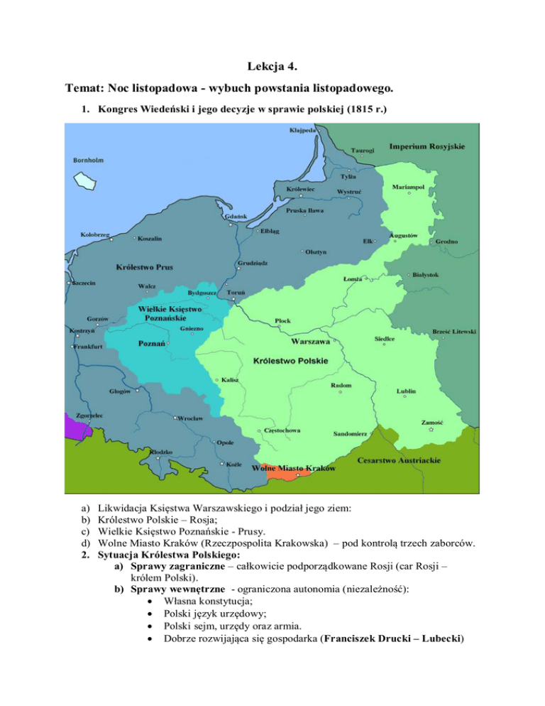 Lekcja 4. Temat: Noc listopadowa - wybuch powstania listopadowego. 1. Kongres Wiedeński i jego decyzje w sprawie polskiej (1815 r.) a) b) c) d) 2. Likwidacja Księstwa Warszawskiego i podział jego ziem: Królestwo Polskie – Rosja; Wielkie Księstwo Poznańskie - Prusy. Wolne Miasto Kraków (Rzeczpospolita Krakowska) – pod kontrolą trzech zaborców. Sytuacja Królestwa Polskiego: a) Sprawy zagraniczne – całkowicie podporządkowane Rosji (car Rosji – królem Polski). b) Sprawy wewnętrzne - ograniczona autonomia (niezależność): Własna konstytucja; Polski język urzędowy; Polski sejm, urzędy oraz armia. Dobrze rozwijająca się gospodarka (Franciszek Drucki – Lubecki) 1816 r. – założenie Uniwersytetu Warszawskiego. 3. Przyczyny wybuchu powstania listopadowego. a) Łamanie przez Rosjan praw Polaków zagwarantowanych w konstytucji; b) Aresztowania Polaków; c) Niezadowolenie w armii polskiej wynikające z brutalności wielkiego księcia Konstantego – brata cara Aleksandra i namiestnika Królestwa; d) Spisek w szkole podchorążych (Piotr Wysocki); e) Dążenie Polaków do odzyskania pełnej niepodległości. 4. Noc listopadowa i wybuch powstania (29/30 listopada 1830 r.). a) nieudana próba zamachu na księcia Konstantego. b) Zdobycie Arsenału przez lud Warszawy i wycofanie się Rosjan z miasta