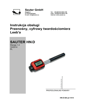 Sauter GmbH Ziegelei 1 D-72336 Balingen E-mail: [email protected] Tel.: +49-[0]7433-9933-199 Faks: +49-[0]7433-9933-149 Internet: www.sauter.eu Instrukcja obsługi Przenośny, cyfrowy twardościomierz Leeb'a SAUTER HN-D Wersja 1.4 10/2014 PL PROFESJONALNE POMIARY HN-D-BA-pl-1414 PL SAUTER HN-D Wersja 1.4 10/2014 Instrukcja obsługi Przenośny, cyfrowy twardościomierz Leeb'a Dziękujemy za zakup mobilnego, cyfrowego twardościomierza Leeb'a firmy SAUTER. Mamy nadzieję, że będą Państwo zadowoleni z wysokiej jakości wykonania tego urządzenia i jego licznych funkcjonalności. W razie jakichkolwiek pytań, życzeń i sugestii jesteśmy do Państwa dyspozycji. Skrócony opis: 1 Streszczenie ................................................................................................... 3 1.1 1.2 1.3 1.4 1.5 Zakres zastosowania i zasada pomiaru ................................................................................. 3 Twardość „L” ............................................................................................................................ 4 Charakterystyka ogólna ........................................................................................................... 4 Zakres zastosowania................................................................................................................ 4 Zastosowanie: podstawowe gałęzie przemysłu .................................................................... 5 2 Wykonanie techniczne .................................................................................. 5 3 Przegląd urządzenia ...................................................................................... 6 4 Sprawdzenie dostarczonych elementów wyposażenia .............................. 6 5 Instrukcja robocza ......................................................................................... 6 5.1 5.2 5.3 5.3.1 5.3.2 5.3.3 5.3.4 5.3.5 5.3.6 5.4 5.5 5.6 5.7 Przyciski i ich funkcje .............................................................................................................. 6 Wyświetlacz LCD ...................................................................................................................... 7 Ustawienia ................................................................................................................................. 7 Typ materiału .............................................................................................................................. 7 Skala twardości .......................................................................................................................... 7 Dane w grupie pomiarów ............................................................................................................ 8 Przeszukiwanie (przeglądanie) danych ...................................................................................... 8 Ustawianie daty i godziny ........................................................................................................... 9 Kalibracja .................................................................................................................................... 9 Format zapisu danych............................................................................................................ 10 Podświetlany wyświetlacz ..................................................................................................... 11 Automatyczne wyłączanie ..................................................................................................... 11 Ładowanie ............................................................................................................................... 11 6 Drukowanie danych ..................................................................................... 12 7 Badanie twardości ....................................................................................... 12 7.1 7.2 Sprawdzenie ustawień wstępnych ....................................................................................... 12 Przygotowanie próbki ............................................................................................................ 12 8 Problemy i rozwiązania ............................................................................... 14 9 Konserwacja i serwis................................................................................... 14 9.1 9.2 9.3 Serwis i konserwacja bijaka .................................................................................................. 14 Prawidłowe składowanie protokołów z danymi pomiarów ................................................ 14 Sposoby postępowania podczas serwisu ........................................................................... 14 10 Deklaracja zgodności .................................................................................. 17 2 HN-D-BA-pl-1414 Środki ostrożności Najpierw prosimy dokładnie przeczytać poniższe wskazówki: 1. Kompletnego urządzenia nie wolno ani zanurzać w wodzie, ani wystawiać na deszcz, gdyż mogłoby to doprowadzić do nieprzewidywalnych uszkodzeń, zniszczenia akumulatora lub wyświetlacza. 2. Jeżeli urządzenie nie będzie używane przez dłuższy okres, należy je przechowywać w oryginalnym opakowaniu, w suchym i chłodnym miejscu. Temperatura otoczenia powinna wynosić od −30°C do +80°C, a względna wilgotność powietrza (RH) od 5% do 95%. 1 Streszczenie 1.1 Zakres zastosowania i zasada pomiaru W czasie wykonywania badania bijaczek z końcówką testową wykonaną z węglika wolframu wyrzucany jest przy użyciu siły sprężyny w kierunku powierzchni badanego obiektu, po czym ponownie odskakuje od niej wskutek odbicia sprężystego. Prędkości uderzenia i odbicia mierzone są w następujący sposób: W czasie wykonywania ruchu do przodu i ruchu powrotnego znajdujący się w bijaczku magnes stały wytwarza napięcie indukowane w umieszczonej