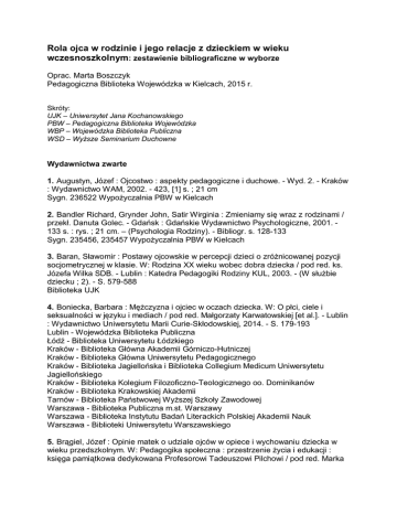 Rola ojca w rodzinie i jego relacje z dzieckiem w wieku wczesnoszkolnym: zestawienie bibliograficzne w wyborze Oprac. Marta Boszczyk Pedagogiczna Biblioteka Wojewódzka w Kielcach, 2015 r. Skróty: UJK – Uniwersytet Jana Kochanowskiego PBW – Pedagogiczna Biblioteka Wojewódzka WBP – Wojewódzka Biblioteka Publiczna WSD – Wyższe Seminarium Duchowne Wydawnictwa zwarte 1. Augustyn, Józef : Ojcostwo : aspekty pedagogiczne i duchowe. - Wyd. 2. - Kraków : Wydawnictwo WAM, 2002. - 423, [1] s. ; 21 cm Sygn. 236522 Wypożyczalnia PBW w Kielcach 2. Bandler Richard, Grynder John, Satir Wirginia : Zmieniamy się wraz z rodzinami / przekł. Danuta Golec. - Gdańsk : Gdańskie Wydawnictwo Psychologiczne, 2001. 133 s. : rys. ; 21 cm. – (Psychologia Rodziny). - Bibliogr. s. 128-133 Sygn. 235456, 235457 Wypożyczalnia PBW w Kielcach 3. Baran, Sławomir : Postawy ojcowskie w percepcji dzieci o zróżnicowanej pozycji socjometrycznej w klasie. W: Rodzina XX wieku wobec dobra dziecka / pod red. ks. Józefa Wilka SDB. - Lublin : Katedra Pedagogiki Rodziny KUL, 2003. - (W służbie dziecku ; 2). - S. 579-588 Biblioteka UJK 4. Boniecka, Barbara : Mężczyzna i ojciec w oczach dziecka. W: O płci, ciele i seksualności w języku i mediach / pod red. Małgorzaty Karwatowskiej [et al.]. - Lublin : Wydawnictwo Uniwersytetu Marii Curie-Skłodowskiej, 2014. - S. 179-193 Lublin - Wojewódzka Biblioteka Publiczna Łódź - Biblioteka Uniwersytetu Łódzkiego Kraków - Biblioteka Główna Akademii Górniczo-Hutniczej Kraków - Biblioteka Główna Uniwersytetu Pedagogicznego Kraków - Biblioteka Jagiellońska i Biblioteka Collegium Medicum Uniwersytetu Jagiellońskiego Kraków - Biblioteka Kolegium Filozoficzno-Teologicznego oo. Dominikanów Kraków - Biblioteka Krakowskiej Akademii Tarnów - Biblioteka Państwowej Wyższej Szkoły Zawodowej Warszawa - Biblioteka Publiczna m.st. Warszawy Warszawa - Biblioteka Instytutu Badań Literackich Polskiej Akademii Nauk Warszawa - Biblioteki Uniwersytetu Warszawskiego 5. Brągiel, Józef : Opinie matek o udziale ojców w opiece i wychowaniu dziecka w wieku przedszkolnym. W: Pedagogika społeczna : przestrzenie życia i edukacji : księga pamiątkowa dedykowana Profesorowi Tadeuszowi Pilchowi / pod red. Marka Konopczyńskiego, Wiesława Theissa, Mikołaja Winiarskiego. - Warszawa : Pedagogium Wyższa Szkoła Pedagogiki Resocjalizacyjnej, 2010. - S. 331-342 Łódź - Biblioteka Uniwersytetu Łódzkiego Kraków - Biblioteka Główna Uniwersytetu Pedagogicznego Kraków - Biblioteka Jagiellońska i Biblioteka Collegium Medicum Uniwersytetu Jagiellońskiego Warszawa - Biblioteki Uniwersytetu Warszawskiego 6. Canfield, Ken R. : Siedem sekretów efektywnych ojców : jak stać się ojcem, jakiego potrzebują twoje dzieci. - [Lublin] : Fundacja im. św. Cyryla i Metodego Inicjatywa Tato.Net, cop. 2013. - 241 s. : il. ; 21 cm WBP w Kielcach 7. Cebernik, Renata : Rola ojca w rozwoju dziecka i jej społeczno-kulturowe uwarunkowania. W: Zadania i role społeczne okresu dorosłości / red. nauk. Karolina Appelt, Julita Wojciechowska. - Poznań : Wydawnictwo Fundacji Humaniora, 2002. S. 187-208 Biblioteka UJK 8. Dąbrowska-Wnuk, Marianna : Zaangażowane ojcostwo, czyli nowe oblicze ojcowskiej miłości. W: Miłość - akt preferencji duchowości człowieka : studium bliskości uczuciowej / red. nauk. Alicja Żywczok. - Warszawa : Wydawnictwo Akademickie Żak, 2013. - S. 135-161 Biblioteka UJK 9. Domagała-Zyśk, Ewa : Rola ojców w zapobieganiu niepowodzeniom szkolnym ich dzieci. W: Oblicza ojcostwa / red. Dorota Kornas-Biela. - Lublin : Towarzystwo Naukowe KUL, 2001. - (Prace Wydziału Nauk Społecznych / Towarzystwo Naukowe KUL ; 70). - S. 373-379 Ojciec jako twórca środowiska sprzyjającego uczeniu się oraz jako osoba motywująca do podejmowania. Biblioteka UJK 10. Froelich, Aleksandra : Ojcostwo-refleksje nad znaczeniem roli ojca w wychowaniu. W: Dialog o wybranych problemach współczesnego świata / pod red. Aleksandry Froelich, Remigiusza Kijak. - Bydgoszcz : Kujawsko-Pomorska Szkoła Wyższa, 2006. - S. 43-51 Streszczenie w języku angielskim. Podano definicję pojęcia: "ojciec". Biblioteka UJK 11. Gajewska, Grażyna : Pedagogika opiekuńcza : elementy metodyki / Grażyna Gajewska. - Wyd. 3 popr. - Zielona Góra : PEKW "Gaja", 2006. - 256 s. : il. ; 21 cm Zawiera m.in.: Wybrane problemy etyki pracy opiekuńczo-wychowawczej ; Kształtowanie się i istota potrzeby przywiązania u małego dziecka i jej aspekty opiekuńczo-wychowawcze ; Kształtowanie więzi psychospołecznej w opiece i jej znaczenie ; Znaczenie kontaktu bliskiego, ciepłego w opiece, werbalnego i niewerbalnego, zasady prawidłowej komunikacji z dzieckiem w opiece i wychowaniu ; Opieka i wychowanie rodzinne ; Rola matki, rola ojca, dziadków i rodzeństwa w opiece i wychowaniu dziecka. Sygn. 242918 Czytelnia PBW w Kielcach Sygn. 242919, 243130 Wypożyczalnia PBW w Kielcach 12. Garbarz Andrzej, Lipska-Obuchowska Małgorzata : Rozumienie ojcostwa dawniej a obecnie. W: Rodzina, diagnoza, profilaktyka i wsparcie / red. nauk. Krystyna Duraj-Nowakowa, Urszula Gruca-Miąsik. - Rzeszów : Wydawnictwo Uniwersytetu Rzeszowskiego, 2009. - S. 66-83 Biblioteka UJK 13. Gordon, Maria : Ojcowie nieobecni i samotni oraz ich rola w wychowaniu do agresywności. W: Agresja wirtualna vs realna : poglądy i badania / red. Zdzisław Majchrzyk, Jan F. Terelak. - Białystok : Wyższa Szkoła Administracji Publicznej im. Stanisława Staszica, 2011. - S. 127-136 Na podstawie badań własnych. Biblioteka UJK 14. Grzelak, Szymon : Dziki ojciec : jak wykorzystać moc inicjacji w wychowaniu. Poznań : Wydawnictwo Polskiej Prowincji Dominikanów W drodze, 2009. - 364, [4] s. : il. kolor. ; 21 cm WBP w Kielcach 15. Jakubiak, Krzysztof : Postać i rola ojca w rodzinie polskiej w XIX i początkach XX w. w świetle piśmiennictwa pedagogicznego i rodzinnego. W: Mężczyzna w rodzinie i społeczeństwie : ewolucja ról w kulturze polskiej i eur