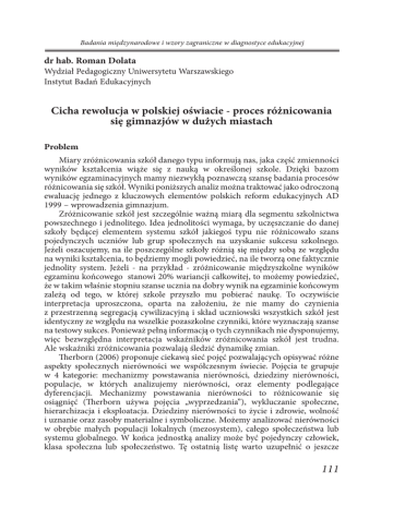 Badania międzynarodowe i wzory zagraniczne w diagnostyce edukacyjnej dr hab. Roman Dolata Wydział Pedagogiczny Uniwersytetu Warszawskiego Instytut Badań Edukacyjnych Cicha rewolucja w polskiej oświacie - proces różnicowania się gimnazjów w dużych miastach Problem Miary zróżnicowania szkół danego typu informują nas, jaka część zmienności wyników kształcenia wiąże się z nauką w określonej szkole. Dzięki bazom wyników egzaminacyjnych mamy niezwykłą poznawczą szansę badania procesów różnicowania się szkół. Wyniki poniższych analiz można traktować jako odroczoną ewaluację jednego z kluczowych elementów polskich reform edukacyjnych AD 1999 – wprowadzenia gimnazjum. Zróżnicowanie szkół jest szczególnie ważną miarą dla segmentu szkolnictwa powszechnego i jednolitego. Idea jednolitości wymaga, by uczęszczanie do danej szkoły będącej elementem systemu szkół jakiegoś typu nie różnicowało szans pojedynczych uczniów lub grup społecznych na uzyskanie sukcesu szkolnego. Jeżeli oszacujemy, na ile poszczególne szkoły różnią się między sobą ze względu na wyniki kształcenia, to będziemy mogli powiedzieć, na ile tworzą one faktycznie jednolity system. Jeżeli - na przykład - zróżnicowanie międzyszkolne wyników egzaminu końcowego stanowi 20% wariancji całkowitej, to możemy powiedzieć, że w takim właśnie stopniu szanse ucznia na dobry wynik na egzaminie końcowym zależą od tego, w której szkole przyszło mu pobierać naukę. To oczywiście interpretacja uproszczona, oparta na założeniu, że nie mamy do czynienia z przestrzenną segregacją cywilizacyjną i skład uczniowski wszystkich szkół jest identyczny ze względu na wszelkie pozaszkolne czynniki, które wyznaczają szanse na testowy sukces. Ponieważ pełną informacją o tych czynnikach nie dysponujemy, więc bezwzględna interpretacja wskaźników zróżnicowania szkół jest trudna. Ale wskaźniki zróżnicowania pozwalają śledzić dynamikę zmian. Therborn (2006) proponuje ciekawą sieć pojęć pozwalających opisywać różne aspekty społecznych nierówności we współczesnym świecie. Pojęcia te grupuje w 4 kategorie: mechanizmy powstawania nierówności, dziedziny nierówności, populacje, w których analizujemy nierówności, oraz elementy podlegające dyferencjacji. Mechanizmy powstawania nierówności to różnicowanie się osiągnięć (Therborn używa pojęcia „wyprzedzania”), wykluczanie społeczne, hierarchizacja i eksploatacja. Dziedziny nierówności to życie i zdrowie, wolność i uznanie oraz zasoby materialne i symboliczne. Możemy analizować nierówności w obrębie małych populacji lokalnych (mezosystem), całego społeczeństwa lub systemu globalnego. W końca jednostką analizy może być pojedynczy człowiek, klasa społeczna lub społeczeństwo. Tę ostatnią listę warto uzupełnić o jeszcze 111 XV Konferencja Diagnostyki Edukacyjnej, Kielce 2009 jeden element – instytucję. Czterem mechanizmom powstawania nierówności przypisuje Therborn odpowiadające im strategie łagodzenia ich skutków. I tak skutki różnicowania się osiągnięć łagodzić mają programy kompensacyjne, wykluczeniu społecznemu przeciwdziałać mają programy integracyjne (inkluzji), hierarchizacji przeciwstawiać się mają strategie spłaszczania hierarchii, efekty eksploatacji łagodzić ma redystrybucja dóbr. Korzystając z tych pojęć możemy różnicowanie się szkół opisać jako proces hierarchizacji ze względu na dobra symboliczne (wyniki kształcenia) populacji z założenia - jednolitych szkół w skali całego społeczeństwa lub jego segmentów (np. szkoły wielkomiejskie lub szkoły w mieście X). Ten proces hierarchizacji szkół sam w sobie wytwarza społeczne nierówności (np. poprzez tabele ligowe), ale jest również interesujący z punktu widzenia potencjalnego wzmacniania procesu różnicowania się osiągnięć zarówno na poziomie jednostek (wzrost wariancji wyników) jak i klasowym (wzrost dystansów międzygrupowych ze względu na osiągnięcia szkolne). Taka interpretacja procesów różnicowania się szkół naprowadza nas na trop ważnej tradycji badawczej, w której warto ulokować studia nad internującym nas fenomenem. Tradycja to to studia nad funkcjonowaniem quasi-rynków edukacyjnych (Gorard, Fitz 2000) zwanych inaczej rynkami publicznymi (Woods, Bagley, Glatter 1998). Wyniki badań wskazują, że mechanizmy rynkowe uruchamiają na progach szkolnych procesy autoselekcji i selekcji, które nasilają procesy różnicowania się szkół (Ball 1993, Goldstein, Noden 2003). W Polsce proces różnicowania się szkół w kontekście studiów nad rynkami publicznymi badali Herczyński i Herbst (2005). Korzystając z danych egzaminacyjnych wykazali, że poziom koncentracji lokalnego rynku oświatowego mierzony tzw. wskaźnikiem Herfindahla jest znacząco, choć niezbyt silnie, negatywnie skorelowany z średnimi wynikami egzaminu gimnazjalnego w gminie miejskiej. Ponieważ badacze rynków edukacyjnych traktują wskaźnik koncentracji rynku – na ekonomiczną modłę - jako miarę rywalizacji między szkołami, wynik pozwala sformułować twierdzenie, że konkurencja między szkołami prowadzi do wzrostu wyników kształcenia. Ustalenie to jest spójne z wieloma badaniami w tym zakresie (np. Hoxby 1994, Gill i in. 2001, Riodan 2004), choć efekt nie zawsze znajduje potwierdzenie (Levin 1998, Gill 2001). Jednak, co dla nas jest szczególnie interesujące, Herczeński i Herbst stwierdzili, że poziom koncentracji rynku jest ujemnie skorelowany z wariancją międzyszkolną. Czyli rywalizacja między szkołami nieznacznie podnosi wyniki, ale nasila zróżnicowanie szkół. Poziom i dynamika zróżnicowania gimnazjów Wskaźnik zróżnicowania gimnazjów informuje nas o tym, jaki odsetek wariancji całkowitej wyników egzaminu gimnazjalnego stanowi wariancja międzyszkolna. Dla oszacowania wariancji międzygrupowej u