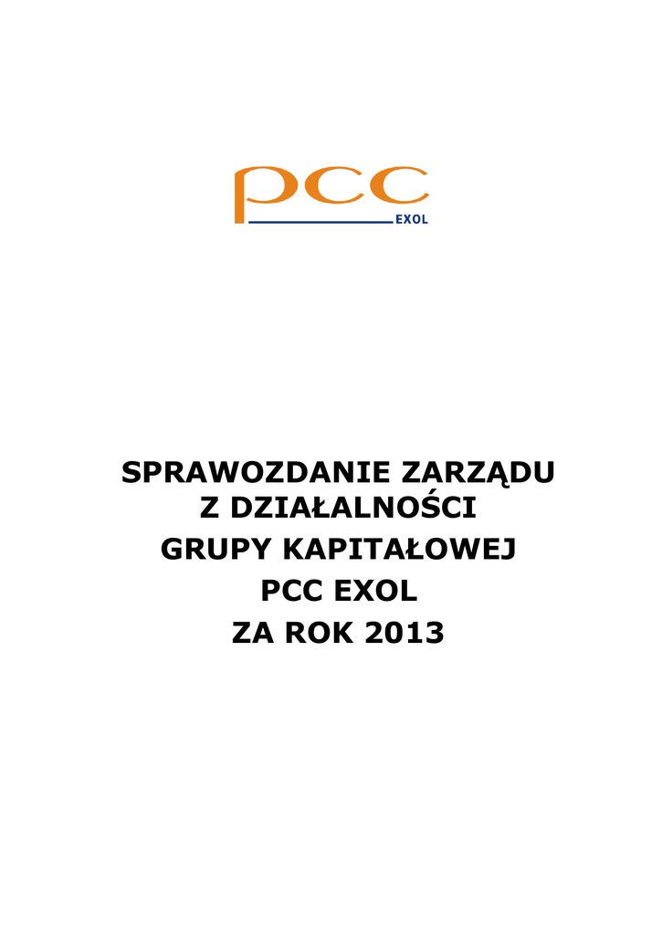 SPRAWOZDANIE ZARZĄDU Z DZIAŁALNOŚCI GRUPY KAPITAŁOWEJ PCC EXOL ZA ROK 2013 Sprawozdanie Zarządu z działalności Grupy Kapitałowej PCC EXOL za rok 2013 SPIS TREŚCI I. WSTĘP............................................................................................................................. 4 II. PODSTAWOWE INFORMACJE O GRUPIE KAPITAŁOWEJ .................................................... 4 II.1. INFORMACJE PODSTAWOWE .................................................................................................... 4 II.2. SKŁAD ZARZĄDU ORAZ RADY NADZORCZEJ EMITENTA .................................................................... 4 II.3. KAPITAŁ II.4. INFORMACJE II.5. SKŁAD GRUPY KAPITAŁOWEJ EMITENTA ..................................................................................... 7 II.6. PRZEDMIOT DZIAŁALNOŚCI SPÓŁEK GRUPY KAPITAŁOWEJ ............................................................... 8 III. OMÓWIENIE PODSTAWOWYCH WIELKOŚCI EKONOMICZNO-FINANSOWYCH WRAZ Z OPISEM SYTUACJI FINANSOWEJ ..................................................................................... 9 PODSTAWOWY I AKCJONARIUSZE POSIADAJĄCY BEZPOŚREDNIO LUB POŚREDNIO ZNACZNE PAKIETY AKCJI ..................................................................................................................... O ZNANYCH SPÓŁCE UMOWACH, W WYNIKU KTÓRYCH MOGĄ W PRZYSZŁOŚCI NASTĄPIĆ ZMIANY W PROPORCJACH POSIADANYCH AKCJI PRZEZ DOTYCHCZASOWYCH AKCJONARIUSZY ..................... 5 7 III.1. ANALIZA WYNIKU FINANSOWEGO ............................................................................................. 9 III.2. ANALIZA AKTYWÓW I PASYWÓW ............................................................................................ 11 III.3. ANALIZA PRZEPŁYWÓW PIENIĘŻNYCH ...................................................................................... 13 III.4. WSKAŹNIKI FINANSOWE I NIEFINANSOWE ................................................................................ 13 III.5. INFORMACJE O ZACIĄGNIĘTYCH I DOTYCZĄCYCH KREDYTÓW I POŻYCZEK WYPOWIEDZIANYCH W DANYM ROKU OBROTOWYM UMOWACH ..................................................................................... 14 III.6. UBEZPIECZENIA ................................................................................................................. 15 III.7. INFORMACJE O UDZIELONYCH I OTRZYMANYCH W DANYM ROKU OBROTOWYM PORĘCZENIACH I GWARANCJACH ................................................................................................................... 16 III.8. OPIS WYKORZYSTANIA PRZEZ SPÓŁKĘ DOMINUJĄCĄ WPŁYWÓW Z EMISJI PAPIERÓW WARTOŚCIOWYCH DO CHWILI SPORZĄDZENIA SPRAWOZDANIA Z DZIAŁALNOŚCI ............................................................. 17 III.9. INFORMACJE O ISTOTNYCH TRANSAKCJACH ZAWARTYCH PRZEZ SPÓŁKĘ LUB JEDNOSTKĘ OD NIEJ ZALEŻNĄ Z PODMIOTAMI POWIĄZANYMI NA INNYCH WARUNKACH NIŻ RYNKOWE ............................................... 17 III.10. OBJAŚNIENIE III.11. OCENA WRAZ Z JEJ UZASADNIENIEM, DOTYCZĄCĄ ZARZĄDZANIA ZASOBAMI FINANSOWYMI ............. 17 III.12. OCENA MOŻLIWOŚCI REALIZACJI ZAMIERZEŃ INWESTYCYJNYCH ............................................... 18 III.13. INFORMACJE DOTYCZĄCE PRZEWIDYWANYCH ŹRÓDEŁ ŚRODKÓW NIEZBĘDNYCH DO REALIZACJI ................................................................................................................... 19 RÓŻNIC POMIĘDZY WYNIKAMI FINANSOWYMI WYKAZANYMI W RAPORCIE ROCZNYM A WCZEŚNIEJ PUBLIKOWANYMI PROGNOZAMI WYNIKÓW NA DANY ROK ............................................. 17 ZOBOWIĄZAŃ, III.14. OCENA CZYNNIKÓW I NIETYPOWYCH ZDARZEŃ MAJĄCYCH WPŁYW NA WYNIK Z DZIAŁALNOŚCI ZA ROK ....................................................................................................................... 20 OBROTOWY IV. CHARAKTERYSTYKA DZIAŁALNOŚCI GRUPY KAPITAŁOWEJ PCC EXOL ........................... 20 IV.1. INFORMACJE O RYNKACH ZBYTU ............................................................................................. 20 IV.2. INFORMACJE O PODSTAWOWYCH PRODUKTACH, TOWARACH LUB USŁUGACH ....................................... 22 IV.3. INFORMACJE O ZAWARTYCH UMOWACH ZNACZĄCYCH DLA DZIAŁALNOŚCI SPÓŁKI ................................. 24 IV.4. WAŻNIEJSZE ZDARZENIA 2013R. ORAZ ZDARZENIA, JAKIE NASTĄPIŁY PO DNIU 31 GRUDNIA 2013R. ..... 25 IV.5. PERSPEKTYWY ROZWOJU DZIAŁALNOŚCI GRUPY KAPITAŁOWEJ ...................................................... 25 IV.6. WSKAZANIE POSTĘPOWAŃ TOCZĄCYCH SIĘ PRZED SĄDEM.............................................................. 26 V. ZASADY ZARZĄDZANIA PRZEDSIĘBIORSTWEM ............................................................. 26 2 Sprawozdanie Zarządu z działalności Grupy Kapitałowej PCC EXOL za rok 2013 V.1. OPIS GŁÓWNYCH CECH STOSOWANYCH W PRZEDSIĘBIORSTWIE SYSTEMÓW KONTROLI WEWNĘTRZNEJ I ZARZĄDZANIA RYZYKIEM W SPÓŁCE DOMINUJĄCEJ ...................................................................... 26 V.2. ZMIANY W PODSTAWOWYCH ZASADACH ZARZĄDZANIA GRUPĄ KAPITAŁOWĄ ...................................... 27 V.3. INFORMACJE O SYSTEMIE KONTROLI PROGRAMÓW AKCJI PRACOWNICZYCH ORAZ WARTOŚCI WYNAGRODZEŃ, NAGRÓD LUB KORZYŚCI, W TYM WYNIKAJĄCYCH Z PROGRAMÓW MOTYWACYJNYCH LUB PREMIOWYCH OPARTYCH NA KAPITALE V.4. WSZELKIE V.5. OKREŚLENIE UMOWY ZAWARTE PCC EXOL...................................................................... 27 MIĘDZY SPÓŁKĄ DOMINUJĄCĄ A OSOBAMI ZARZĄDZAJĄCYMI, PRZEWIDUJĄCE REKOMPENSATĘ W PRZYPADKU ICH REZYGNACJI LUB ZWOLNIENIA ............................... 27 (UDZIAŁÓW) PCC EXOL PCC EXOL, BĘDĄCYCH W POSIADANIU OSÓB ZARZĄDZAJĄCYCH I NADZORUJĄCYCH ....................................................................................... 27 ŁĄCZNEJ LICZBY I WARTOŚCI NOMINALNEJ WSZYSTKICH AKCJI ORAZ AKCJI I UDZIAŁÓW W JEDNOSTKACH POWIĄZAN