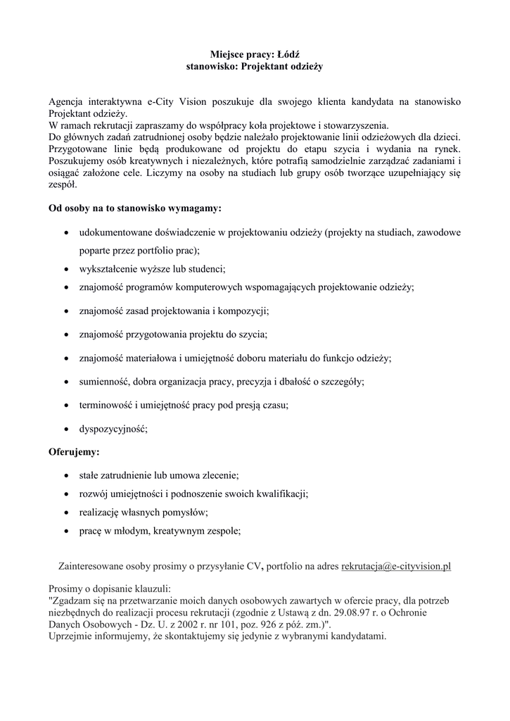 Miejsce pracy: Łódź stanowisko: Projektant odzieży Agencja interaktywna e-City Vision poszukuje dla swojego klienta kandydata na stanowisko Projektant odzieży. W ramach rekrutacji zapraszamy do współpracy koła projektowe i stowarzyszenia. Do głównych zadań zatrudnionej osoby będzie należało projektowanie linii odzieżowych dla dzieci. Przygotowane linie będą produkowane od projektu do etapu szycia i wydania na rynek. Poszukujemy osób kreatywnych i niezależnych, które potrafią samodzielnie zarządzać zadaniami i osiągać założone cele. Liczymy na osoby na studiach lub grupy osób tworzące uzupełniający się zespół. Od osoby na to stanowisko wymagamy: udokumentowane doświadczenie w projektowaniu odzieży (projekty na studiach, zawodowe poparte przez portfolio prac); wykształcenie wyższe lub studenci; znajomość programów komputerowych wspomagających projektowanie odzieży; znajomość zasad projektowania i kompozycji; znajomość przygotowania projektu do szycia; znajomość materiałowa i umiejętność doboru materiału do funkcjo odzieży; sumienność, dobra organizacja pracy, precyzja i dbałość o szczegóły; terminowość i umiejętność pracy pod presją czasu; dyspozycyjność; Oferujemy: stałe zatrudnienie lub umowa zlecenie; rozwój umiejętności i podnoszenie swoich kwalifikacji; realizację własnych pomysłów; pracę w młodym, kreatywnym zespole; Zainteresowane osoby prosimy o przysyłanie CV, portfolio na adres [email protected] Prosimy o dopisanie klauzuli: "Zgadzam się na przetwarzanie moich danych osobowych zawartych w ofercie pracy, dla potrzeb niezbędnych do realizacji procesu rekrutacji (zgodnie z Ustawą z dn. 29.08.97 r. o Ochronie Danych Osobowych - Dz. U. z 2002 r. nr 101, poz. 926 z póź. zm.)". Uprzejmie informujemy, że skontaktujemy się jedynie z wybranymi kandydatami.