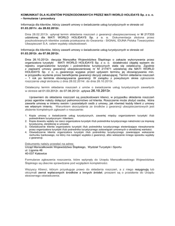 KOMUNIKAT DLA KLIENTÓW POSZKODOWANYCH PRZEZ MATI WORLD HOLIDAYS Sp. z o. o. – formularze i procedury Informacja dla klientów, którzy zawarli umowy o świadczenie usług turystycznych w okresie od 01.03.2011r. do 28.02.2012r. Dnia 28.02.2013r. upłynął termin składania roszczeń z gwarancji ubezpieczeniowej nr M 217333 udzielonej dla MATI WORLD HOLIDAYS Sp. z o. o. Dokumentacja złożona przez poszkodowanych klientów została przekazana do Gwaranta - SIGNAL IDUNA Polska Towarzystwo Ubezpieczeń S.A. celem wypłaty odszkodowań. Informacja dla klientów, którzy zawarli umowy o świadczenie usług turystycznych w okresie od 01.03.2012r. do 07.08.2012r. Dnia 26.10.2012r. decyzja Marszałka Województwa Śląskiego o zakazie wykonywania przez organizatora turystyki MATI WORLD HOLIDAYS Sp. z o. o. działalności objętej wpisem do rejestru organizatorów turystyki i pośredników turystycznych stała się ostateczna. Zgodnie z zapisami umowy gwarancji ubezpieczeniowej nr M 217471 udzielonej dla MATI WORLD HOLIDAYS Sp. z o. o., gwarancja wygasa przed upływem terminu jej obowiązywania min. w przypadku wydania przez beneficjenta gwarancji decyzji zakazującej. Termin składania roszczeń – 1 rok po terminie obowiązywania gwarancji. W związku z powyższym okres zgłoszenia roszczenia uległ skróceniu z dnia 28.02.2014r. do dnia 26.10.2013r. Ostateczny termin składania roszczeń z umów o świadczenie usług turystycznych zawartych w okresie od 01.03.2012r. do 07.08.2012r. upływa 26.10.2013r. Uprawnieni do składania roszczeń są poszkodowani klienci, w przypadku składania roszczeń przez agentów należy dołączyć pełnomocnictwo od klienta. Roszczenie może złożyć osoba, która zawarła umowę w imieniu swoim i pozostałych osób z umowy, jak również każdy klient z umowy we własnym imieniu. Warunkiem skorzystania ze środków z gwarancji ubezpieczeniowych jest złożenie kompletnych zgłoszeń o roszczenie: 1. Kopia umowy o świadczenie usług turystycznych, zawartej między organizatorem turystyki i/lub pośrednikiem turystycznym i klientem; 2. Kopia dowodu wpłaty na rzecz organizatora turystyki i/lub pośrednika turystycznego należności za imprezę turystyczną, określonej w umowie; 3. Oświadczenie klienta organizatora turystyki i/lub pośrednika turystycznego stwierdzające niewykonanie przez organizatora turystyki i/lub pośrednika turystycznego zobowiązań umownych o określonej wartości; 4. Oświadczenie klienta organizatora turystyki i/lub pośrednika turystycznego zawierające wskazanie rachunku bankowego, na który ma nastąpić wypłata z gwarancji, albo wskazanie innego sposobu wypłaty z gwarancji. Dokumenty należy przesłać na adres: Urząd Marszałkowski Województwa Śląskiego, Wydział Turystyki i Sportu ul. Ligonia 46 40-037 Katowice Formularze zgłoszenia roszczenia, które wpłynęły do Urzędu Marszałkowskiego Województwa Śląskiego są obecnie sprawdzane pod względem kompletności. Wszyscy Klienci, którym przysługuje prawo do składania roszczeń, a z niego rezygnują lub otrzymali zwrot wpłaconych środków z innych źródeł, proszeni są o przesłanie do Urzędu stosownego oświadczenia. DOKUMENTY I OŚWIADCZENIA NIEZBĘDNE DO ZGŁOSZENIA ROSZCZENIA Z GWARANCJI UBEZPIECZENIOWYCH TURYSTYCZNYCH w związku z działalnością wykonywaną przez organizatorów turystyki i pośredników turystycznych na rzecz organizatora turystyki MATI WORLD HOLIDAYS Sp. z o. o. z Chorzowa: Nr M 217471 z dnia 23.01.2012. Gwarant: SIGNAL IDUNA Polska Towarzystwo Ubezpieczeń S.A. w Warszawie. Okres obowiązywania od dnia 01.03.2012r do dnia 26.10.2012r. z siedzibą Prosimy o dokładne zapoznanie się i informacjami, wypełnienie poniższego formularza i przesłanie / dostarczenie na podany niżej adres: Urząd Marszałkowski Województwa Śląskiego Wydział Turystyki i Sportu ul. Ligonia 46 40-037 Katowice Do formularza zgłoszenia szkody należy dołączyć: 1. Kopię umowy o świadczenie usług turystycznych zawartej pomiędzy organizatorem turystyki MATI WORLD HOLIDAYS Sp. z o. o. a klientem; 2. Kopię dowodu wpłaty na rzecz organizatora turystyki należności za imprezę turystyczną, określonej w ww. umowie (np. wyciąg bankowy, pokwitowanie/ paragon); Uprawnieni do składania roszczeń są poszkodowani klienci, w przypadku składania roszczeń przez agentów należy dołączyć pełnomocnictwo od klienta. Roszczenie może złożyć osoba, która zawarła umowę w imieniu swoim i pozostałych osób z umowy, jak również każdy klient z umowy we własnym imieniu. Zgodnie z zapisami ww. umów gwarancji ubezpieczeniowych nieprzekraczalny termin składania roszczeń w związku z niezrealizowanymi lub przerwanymi imprezami turystycznymi dla klientów, którzy zawarli umowy w okresie od dnia 01.03.2012r do dnia 07.08.2012r. upływa w dniu 26.10.2013r. Oświadczam, że organizator turystyki MATI WORLD HOLIDAYS Sp. z o. o. z siedzibą w Chorzowie przy ul. Hajduckiej 6, nie wykonał względem mnie zobowiązań umownych o łącznej wartości …………….……………………………………………………………………….…………………… ( słownie )………………………………………………………………………………………………………………………. ……………………………………………… czytelny podpis klienta FORMULARZ ZGŁOSZENIA SZKODY Z GWARANCJI UBEZPIECZENIOWEJ DANE KLIENTA Nazwisko i imię Data urodzenia ADRES Ulica/ numer domu/numer mieszkania Kod pocztowy/miejscowość/kraj Telefon kontaktowy Numer rachunku bankowego dddddddddddddddddddddddddd Nazwa banku Nazwisko i imię właściciela rachunku DANE DOTYCZĄCE OFERTY WYKUPIONEJ W MATI WORLD HOLIDAYS SP. Z O.O. Data zawarcia umowy turystycznej Numer rezerwacyjny Docelowe miejsce podróży Termin imprezy Ilość osób na rzecz których zawarto umowę Całkowity koszt imprezy Kwota zapłacona przez Pana/Panią Czy wyst