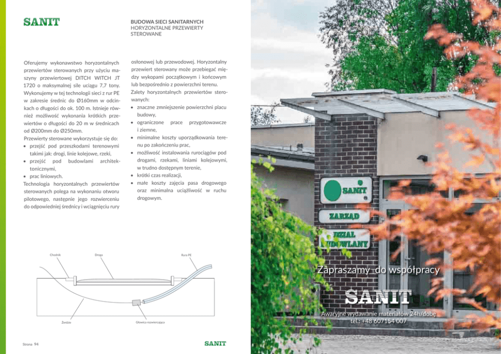 BUDOWA SIECI SANITARNYCH HORYZONTALNE PRZEWIERTY STEROWANE Oferujemy wykonawstwo horyzontalnych przewiertów sterowanych przy użyciu maszyny przewiertowej DITCH WITCH JT 1720 o maksymalnej sile uciągu 7,7 tony. Wykonujemy w tej technologii sieci z rur PE w zakresie średnic do Ø160mm w odcinkach o długości do ok. 100 m. Istnieje również możliwość wykonania krótkich przewiertów o długości do 20 m w średnicach od Ø200mm do Ø250mm. Przewierty sterowane wykorzystuje się do: • przejść pod przeszkodami terenowymi takimi jak: drogi, linie kolejowe, rzeki, • przejść pod budowlami architektonicznymi, • prac liniowych. Technologia horyzontalnych przewiertów sterowanych polega na wykonaniu otworu pilotowego, następnie jego rozwierceniu do odpowiedniej średnicy i wciągnięciu rury osłonowej lub przewodowej. Horyzontalny przewiert sterowany może przebiegać między wykopami początkowym i końcowym lub bezpośrednio z powierzchni terenu. Zalety horyzontalnych przewiertów sterowanych: • znaczne zmniejszenie powierzchni placu budowy, • ograniczone prace przygotowawcze i ziemne, • minimalne koszty uporządkowania terenu po zakończeniu prac, • możliwość instalowania rurociągów pod drogami, rzekami, liniami kolejowymi, w trudno dostępnym terenie, • krótki czas realizacji, • małe koszty zajęcia pasa drogowego oraz minimalna uciążliwość w ruchu drogowym. Droga Chodnik Rura PE Zapraszamy do współpracy Żerdzie Strona 94 Awaryjne wydawanie materiałów 24h/dobę tel.: +48 607154 007 Głowica rozwiercająca ceny netto loco Gliwice Strona 95