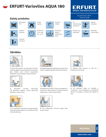 PL ERFURT-Variovlies AQUA 180 Zalety produktu Nie zawiera PCV Trudno zapalny Do ścian i sufitów Do wielokrotnego malowania Otwarty dyfuzyjnie Stabilna struktura Ściana min. 1 min; sufit min. 3 min Powlekany klejem; aktywowany wodą Pokrywa rysy i pęknięcia Niewielkie zużycie farby Łatwy do usunięcia Obróbka 1. Usunąć stare tapety i warstwy farby. Szorstkie podłoża wygładzić masą szpachlową zawierającą gips. Podłoża silnie chłonne zagruntować podkładem niezawierającym rozpuszczalnika. 2. Powłoka klejowa jest aktywowana, dzięki czemu można rozciągnąć tapetę po spryskaniu jej wodą. 3. Naklejać bryty pionowo na styk lub z podwójnym przycięciem. 4. Dociskając szczotką tapeciarską lub gumowym wałkiem, usunąć pęcherzyki powietrza i zmarszczenia. 5. Naddatki przy sufitach, listwach podłogowych, oknach itp. należy odcinać za pomocą noża do tapetowania i szpachli tapeciarskiej. 6. Nie przyklejać tapety na zakładkę w narożnikach i przy krawędziach, ale dokładnie odcinać na krawędzi, a kolejny bryt układać na styk. 7. Po wyschnięciu pomalować wysokiej jakości farbą dyspersyjną zgodną z normą DIN EN 13300 lub farbą akrylową. 8. Przy późniejszym remoncie tapetę łatwo można usunąć. Variovlies www.erfurt.com PL Instrukcja techniczna 04/2016 Opis produktu Zastosowanie/obróbka ERFURT-Variovlies AQUA 180 Podłoże Podłoże musi być suche, nośne, równomierne, chłonne, czyste, gładkie i dostatecznie równe dla przewidzianej okładziny ściennej. Usunąć stare tapety i nieprzylegające warstwy farby. Szorstkie podłoża wygładzić masą szpachlową zawierającą gips. Silnie chłonne, pylące i wykruszające się podłoża należy pokryć środkiem do gruntowania, rozpuszczalnym w wodzie, przeznaczonym do tapet. Producent ERFURT & SOHN KG • Hugo-Erfurt-Straße 1 42399 Wuppertal • GERMANY • www.erfurt.com Należy przestrzegać instrukcji technicznych BFS nr 7 i nr 16. Surowce/produkcja Tapeta ERFURT-Variovlies AQUA 180 nadaje się do zakrywania rys klasy A. ERFURT-Variovlies AQUA 180 to gładka, wstępnie pigmentowana powłoka ścienna, wyprodukowana ze specjalnych włókien celulozowych i tekstylnych, z homogeniczną powłoką kleju na tylnej stronie. Dane produktu Nakładanie kleju Tapeta ERFURT-Variovlies AQUA 180 pokryta jest od tyłu jednorodną warstwą kleju. •Nr zamówienia 1002900 •Wymiar opakowania: długość 25,00 m x szerokość 0,75 m •Zawartość kartonu: 4 rolki •Gramatura: ok. 180 g/m2 Klej jest aktywowany poprzez kąpiel wodną, w trakcie której materiał powlekany jest zimną wodą. Można w tym celu zastosować wszystkie pojemniki na wodę dostępne w sprzedaży. Najlepsze efekty można osiągnąć przy zastosowaniu pojemników ze zintegrowanym paskiem zbierającym wodę, który bezpośrednio usunie nadmiar wody i pozwoli zapobiec nadmiernemu namoknięciu tapety. •Nr zamówienia 1002901 •Wymiar opakowania: długość 25,00 m x szerokość 1,00 m •Zawartość kartonu: 4 rolki •Gramatura: ok. 180 g/m2 Czas nasiąkania klejem Właściwości produktu •Wstępnie pigmentowany •Bardzo dobre krycie podłoża dzięki pigmentacji, dzięki temu w większości przypadków wystarczy jedna warstwa farby •Dobrze kryje kontrasty kolorystyczne podłoża •Bardzo gładka powierzchnia tapety •Przepuszczalność dla pary wodnej zgodnie z normą DIN 52615 odpowiada dyfuzyjnej warstwie powietrza o grubości 0,02 m •Klasa reakcji na ogień „B-s1,d0” zgodnie z normą DIN EN 13501-1 odpowiada „B1” (trudno zapalna) zgodnie z normą DIN 4102-1 •Nie zawiera PCV, szkodliwych dla zdrowia zmiękczaczy ani rozpuszczalników •Nie zawiera włókien szklanych •Bez domieszki związków metali ciężkich i formaldehydu •Stabilna wymiarowo i pokrywająca rysy Tapetę ERFURT-Variovlies AQUA 180 można układać niemal natychmiast. Przy układaniu na ścianie zalecany czas nasiąkania (w celu aktywacji kleju) wynosi 1 minutę, przy układaniu na suficie czas nasiąkania wynosi 3 minuty. Klejenie Przyklejać tapetę ERFURT-Variovlies AQUA 180 pionowo na styk. Na dużych powierzchniach klejenie na styk podnosi wydajność pracy i gwarantuje optymalny rysunek spoin. Na powierzchniach cząstkowych, na przykład we wnękach drzwiowych i okiennych, konieczne jest podwójne cięcie. Na miękkim podłożu należy wykonać podwójne cięcie przy użyciu noża ze stopką dystansową. Zwrócić uwagę, aby bryty naklejać zawsze w tym samym kierunku. Bryty dociskać wałkiem do tapetowania (gumowym wałkiem) lub szpachlą tapeciarską, usuwając pęcherzyki powietrza. Naddatek tapety przy suficie, listwach przypodłogowych, oknach itd. docisnąć do krawędzi plastikową szpachelką i odciąć nożem do tapetowania. •W połączeniu z odpowiednią farbą bardzo odporna na zniszczenia Nie przyklejać okładziny ściennej na zakładkę. •Łatwo usuwalna po użyciu środka do usuwania tapet i wody (zależnie od materiału powłoki) Schnięcie •Do wielokrotnego malowania farbami dostępnymi w handlu Podczas schnięcia tapety zwracać uwagę na to, by pomieszczenie było wietrzone. Unikać przeciągów! Malowanie Zależnie od stopnia obciążenia nanieść jedną lub dwie powłoki farb dyspersyjnych odpornych na zmywanie lub ścieranie o min. klasie ścieralności na mokro 3 wg EN 13300 . Made in Germany ERFURT & SOHN KG Hugo-Erfurt-Straße 1 42399 Wuppertal Tel.: +49 202 6110 0 Faks: +49 202 6110 89 451 E-mail: [email protected] Internet: www.erfurt.com Infolinia: +49 202 6110 375
