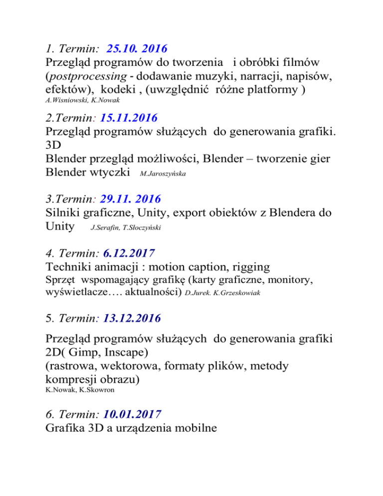 1. Termin: 25.10. 2016 Przegląd programów do tworzenia i obróbki filmów (postprocessing - dodawanie muzyki, narracji, napisów, efektów), kodeki , (uwzględnić różne platformy ) A.Wisniowski, K.Nowak 2.Termin: 15.11.2016 Przegląd programów służących do generowania grafiki. 3D Blender przegląd możliwości, Blender – tworzenie gier Blender wtyczki M.Jaroszyńska 3.Termin: 29.11. 2016 Silniki graficzne, Unity, export obiektów z Blendera do Unity J.Serafin, T.Słoczyński 4. Termin: 6.12.2017 Techniki animacji : motion caption, rigging Sprzęt wspomagający grafikę (karty graficzne, monitory, wyświetlacze…. aktualności) D.Jurek. K.Grzeskowiak 5. Termin: 13.12.2016 Przegląd programów służących do generowania grafiki 2D( Gimp, Inscape) (rastrowa, wektorowa, formaty plików, metody kompresji obrazu) K.Nowak, K.Skowron 6. Termin: 10.01.2017 Grafika 3D a urządzenia mobilne UWAGA !!! 17.01.2017 ( ew 24.01.2017 – zajecia z czwartku, lub 26,27) Prezentacja animacji godz. 16.20 31.01.2017 UWAGA !!!! Egzamin godz. 16.20 Zajęcia trwają od 1.10.2016 - 27.01 2017 Terminy zajęć lab: Wtorek 18.00-19.30 Środa 14.40-16.10